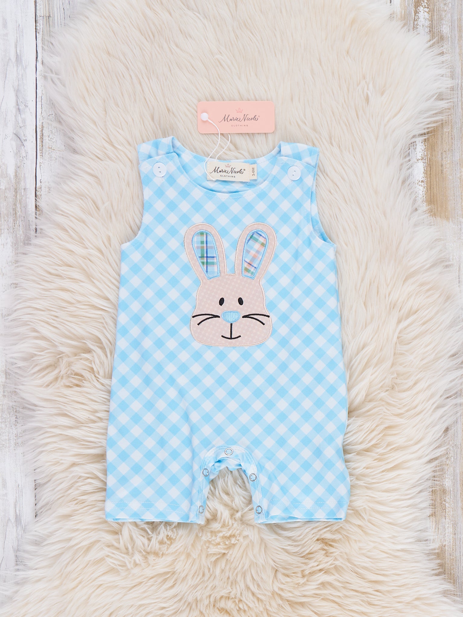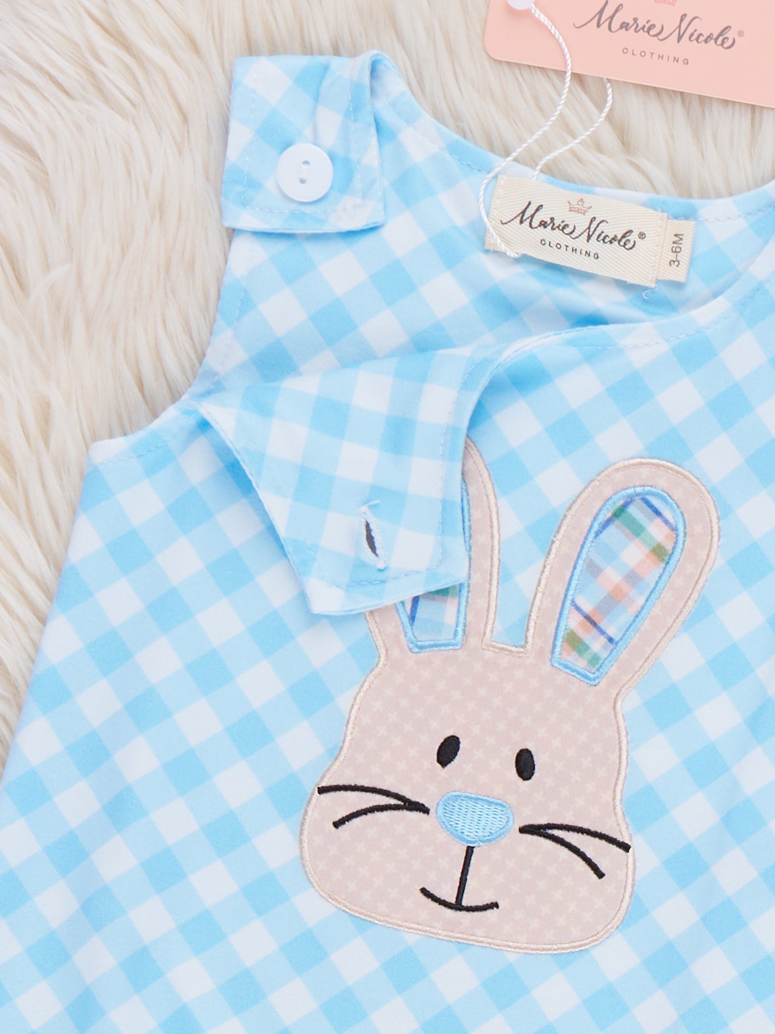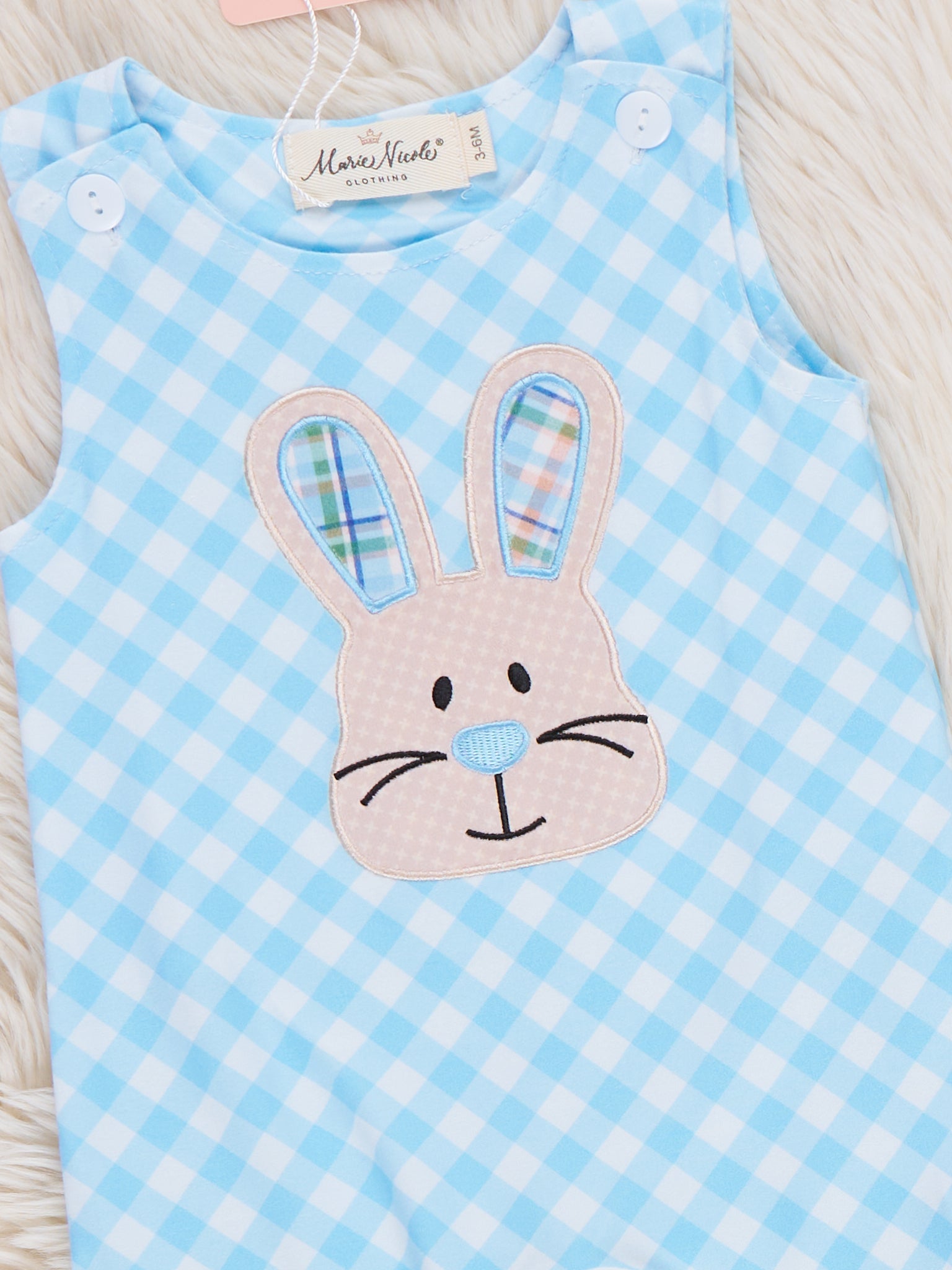 Bunny Square Play Embroidered Johnny by Marie Nicole Clothing keeps little ones ready for Easter fun with an allover gingham pattern and a sweet bunny face embroidery front and center. The sleeveless johnny silhouette offers easy movement and simple snap closures, perfect for playdates, photos, and spring celebrations.