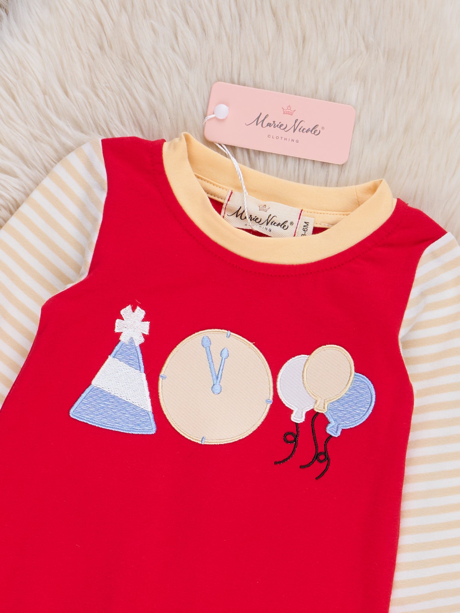 Get ready to party with this playful Red & Yellow Party Time sibling set! Perfect for celebrating the New Year, this boys romper by Marie Nicole Clothing features a vibrant red bodice with an embroidered party theme and fun yellow striped sleeves. Make a statement and have some fun with this stylish and unique romper! Features a party hat, clock, and balloons.