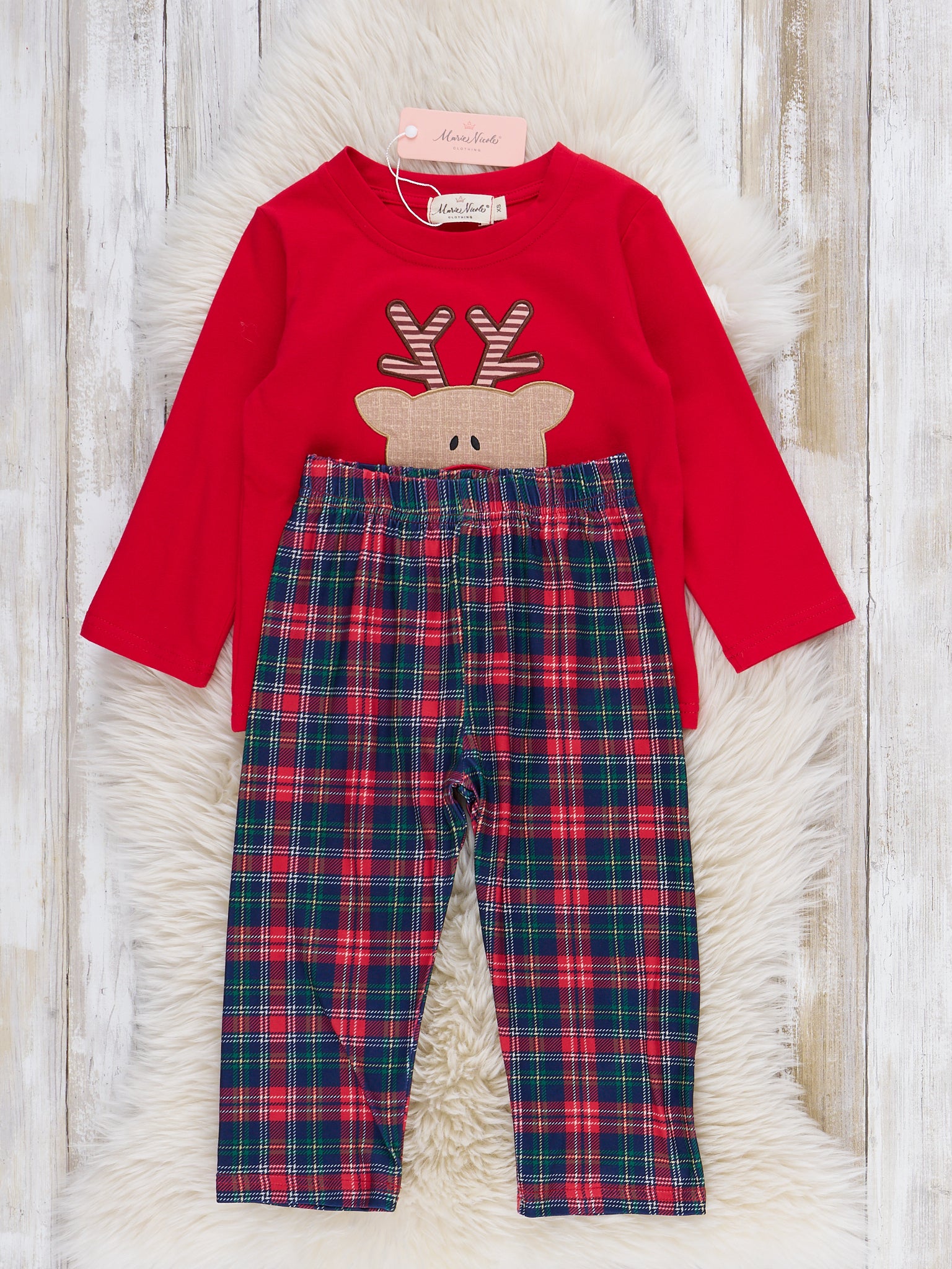 The Big Red Nose Rudolph Embroidered Outfit glows like Rudolph's nose! Bright red paired with tartan pants, this two-piece set is adorably festive for the holidays with its embroidered reindeer. Also made with soft, comfortable fabric, your little boy will love this romper during the winter days and Christmas time.