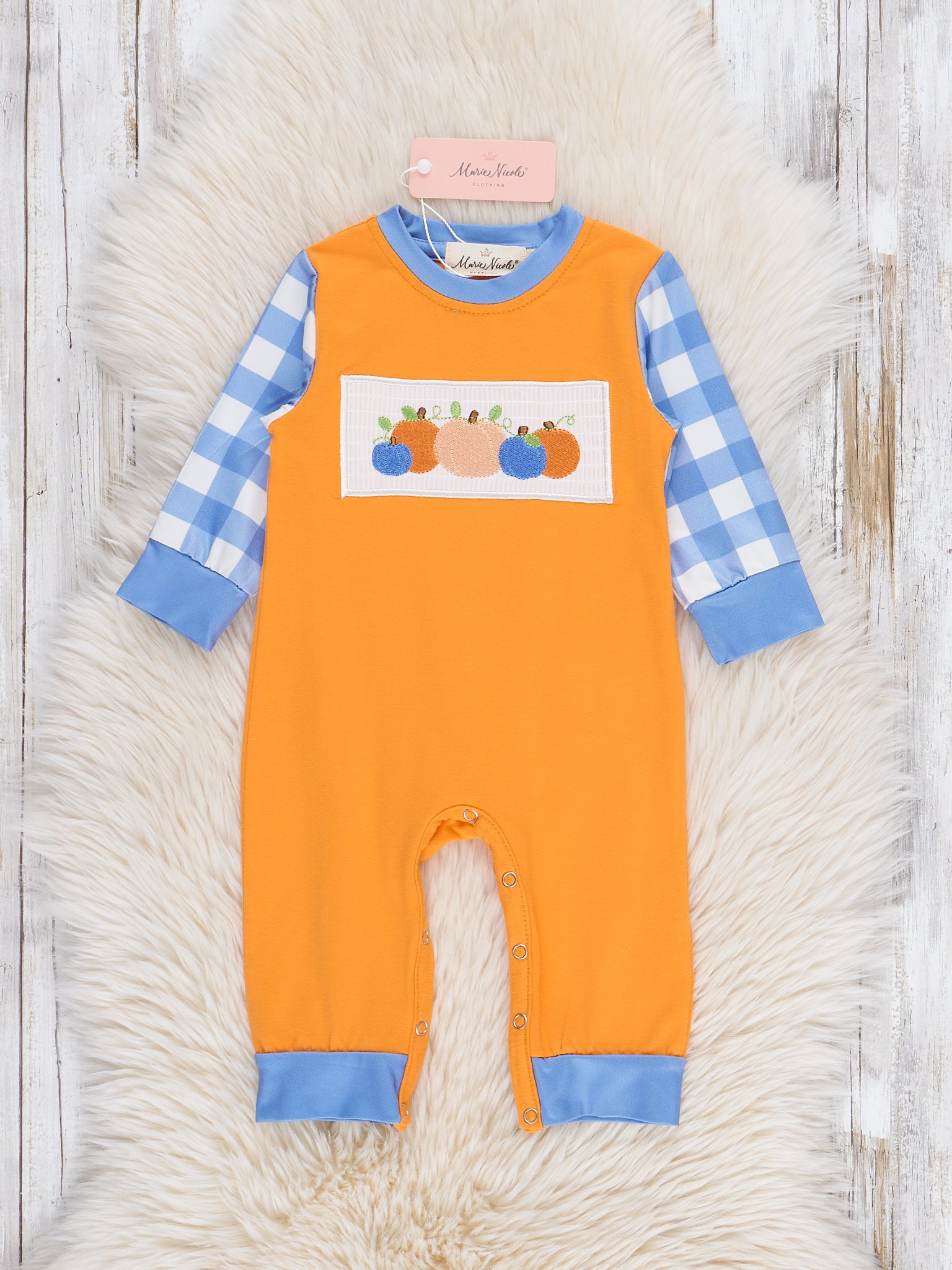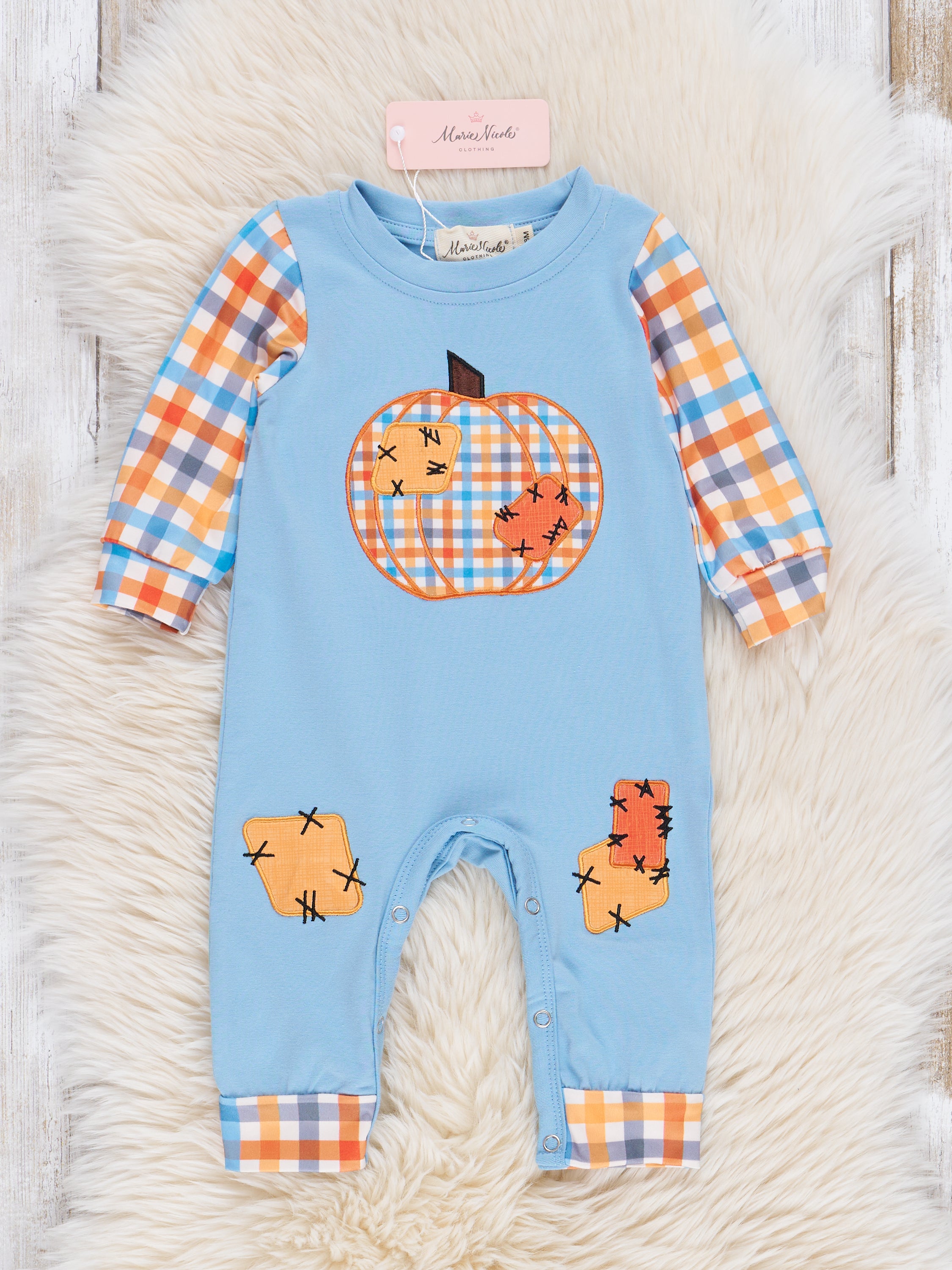 Pumpkin Patch Skies Embroidered Plaid Overall Bubble Set