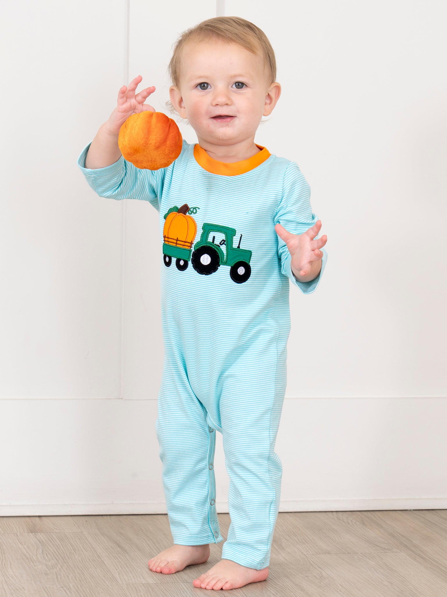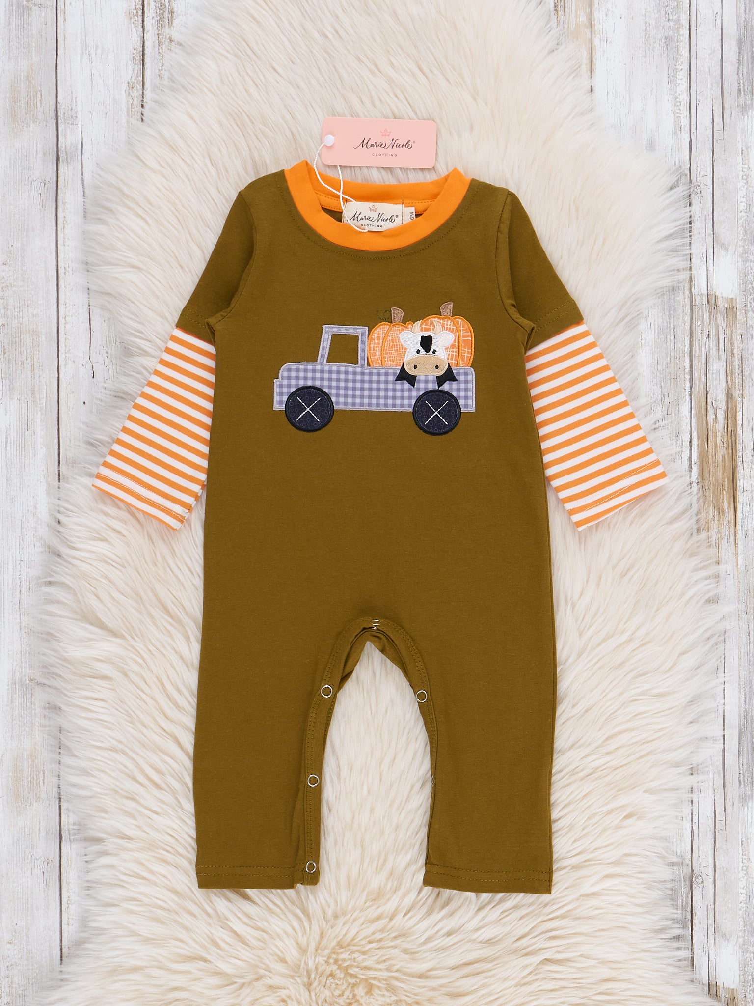 Cattle & Pumpkins Express Embroidered Striped Romper
