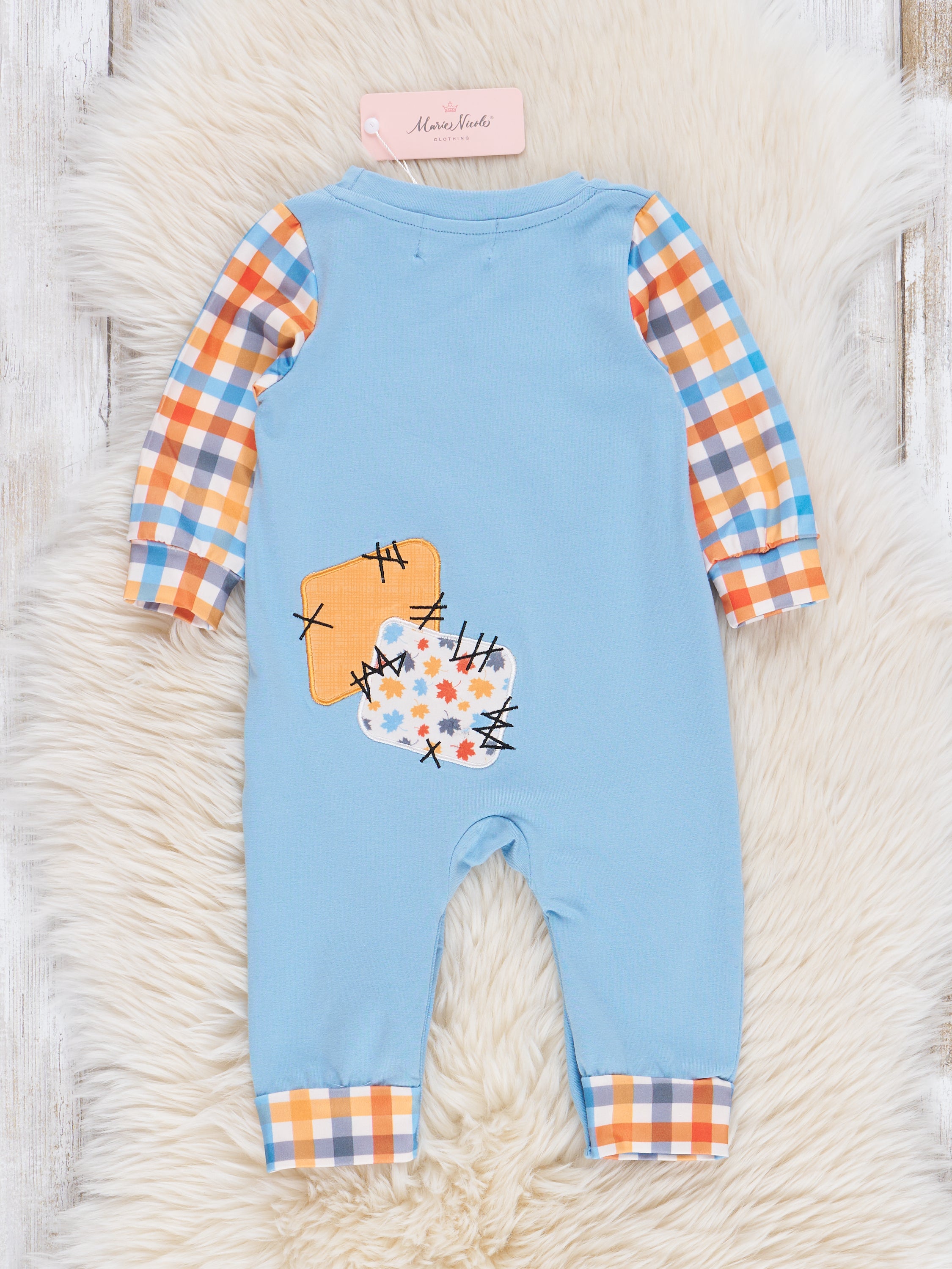 Introducing the Soft Blue & Orange Gingham Patch Romper, perfectly fit for the fall season. Make a statement by coordinating your little ones with this romper by Marie Nicole Clothing, featuring an embroidered gingham pumpkin, raglan sleeves, and an eye-catching knee patch. It's perfect for days spent chasing leaves in the park!