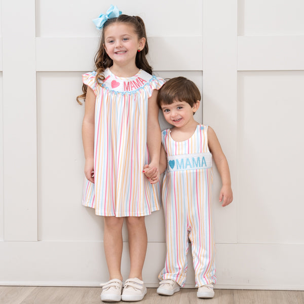 This Striped "I Love Mama" Smocked Johnny by Marie Nicole Clothing is perfect for Mother's Day! This johnny features fun stripes, smocking, an embroidered "I Love Mama" detail, and functioning buttons on the straps. So full of love!