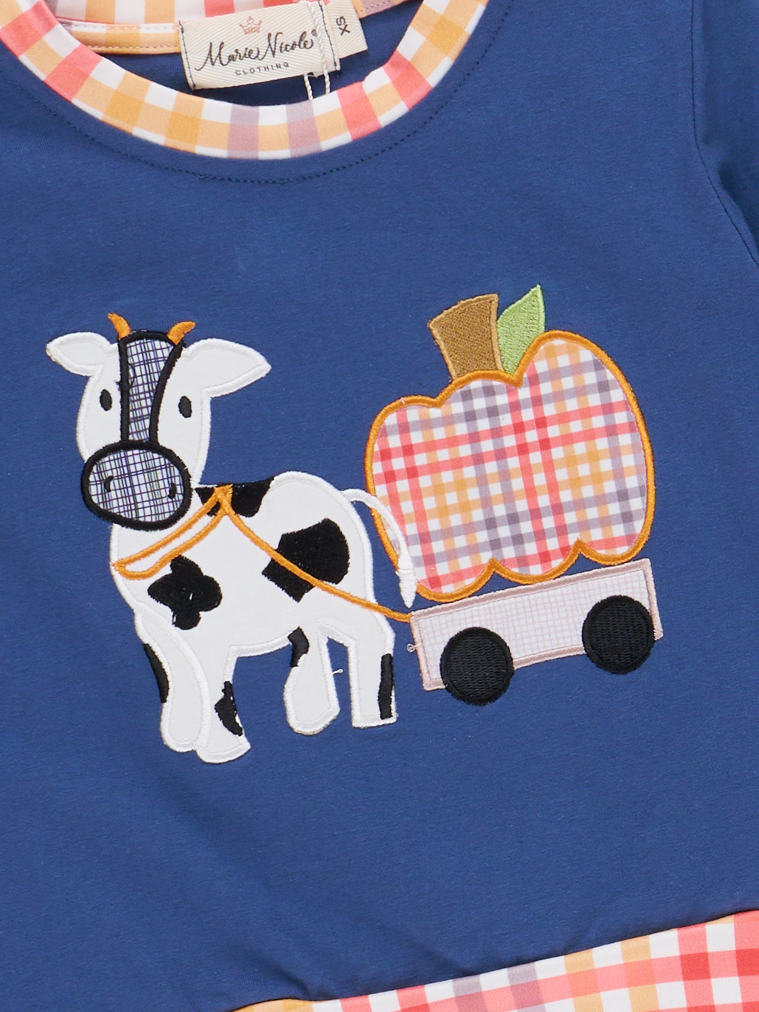 The Farm Friends Pumpkin Ride Embroidered Top by Marie Nicole Clothing features playful farm animal and pumpkin appliqué across the front, with coordinating plaid trim at the collar and cuffs. This soft and comfy long-sleeve top is perfect for fall festivities, farm outings, and making cheerful autumn memories.