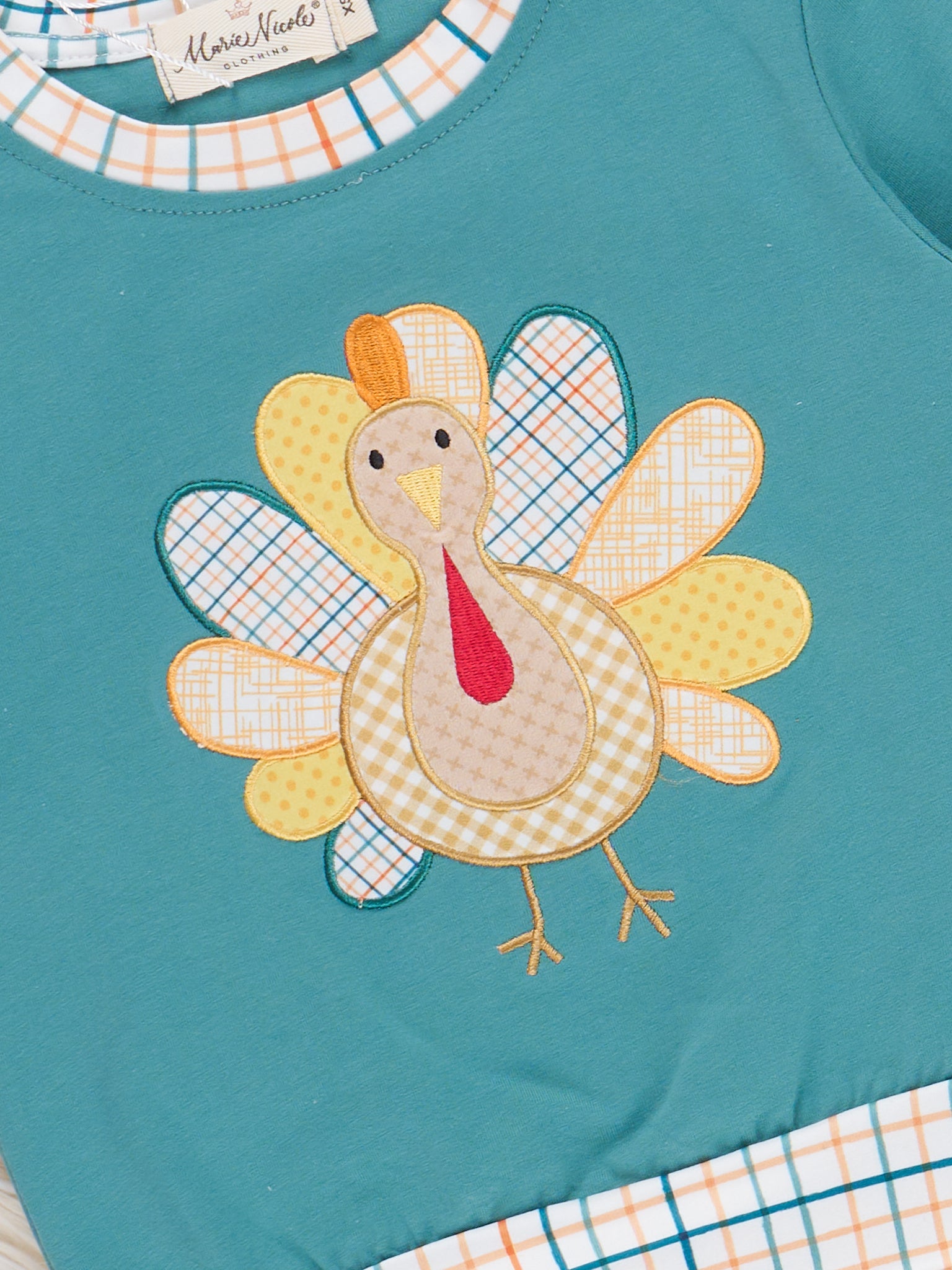 The Gobble Giggles Top by Marie Nicole Clothing features a playful embroidered turkey applique on a teal base, with coordinating plaid trim on the collar, cuffs, and hem. This long-sleeve top is ideal for Thanksgiving and fall festivities, combining festive charm with comfortable everyday style.