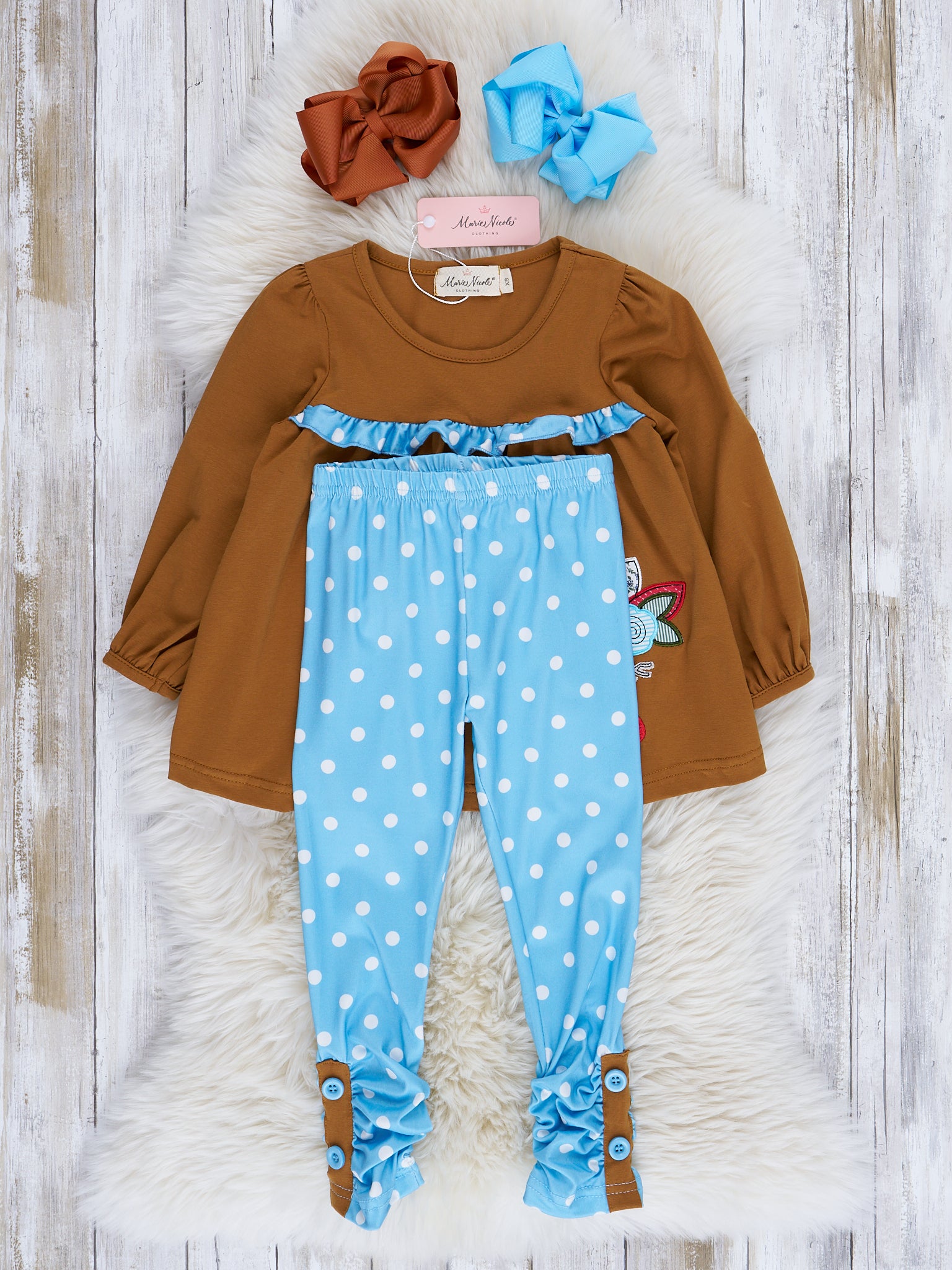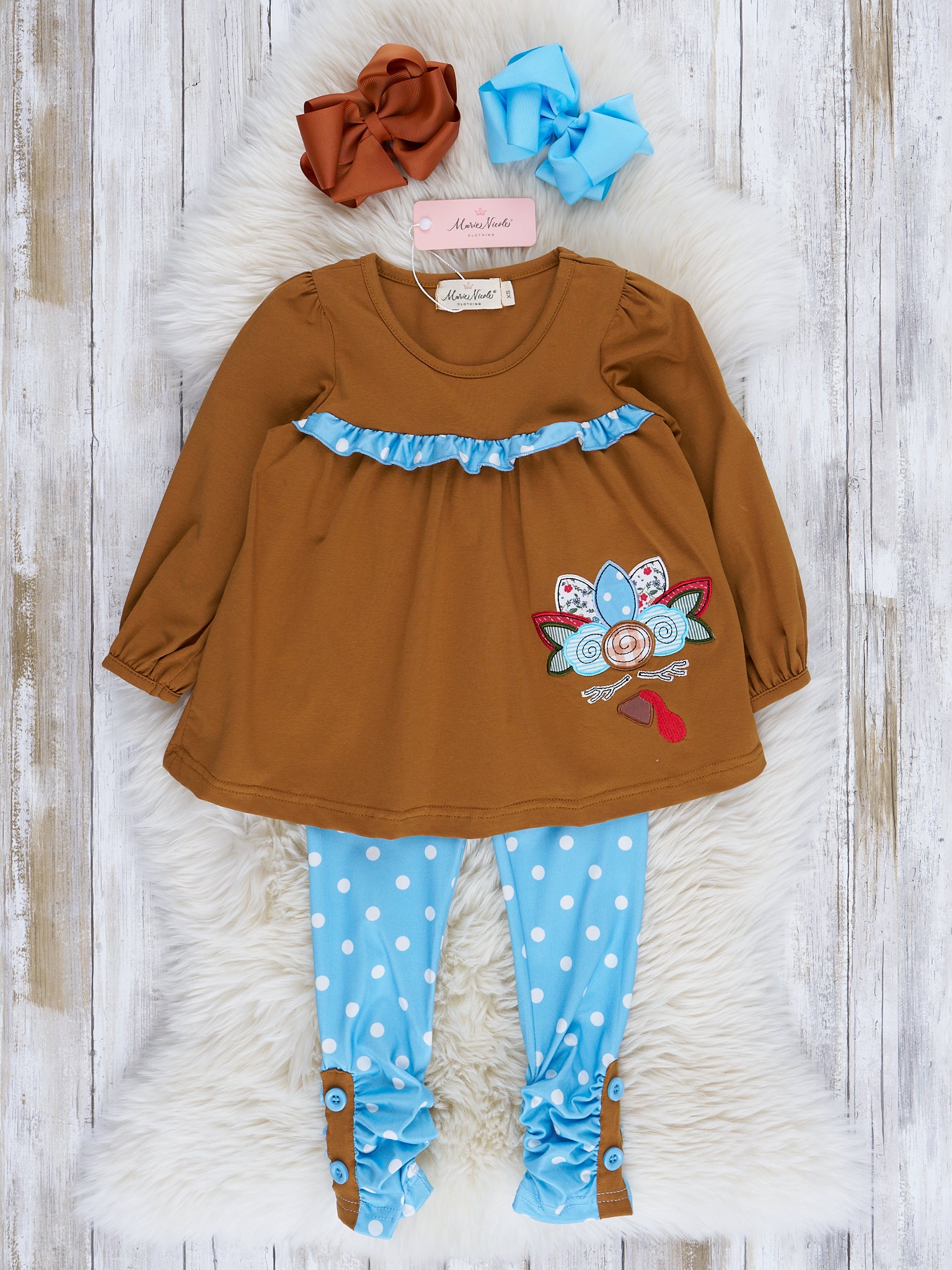 Brown & Blue Dot Embroidered Turkey Ruffle Outfit