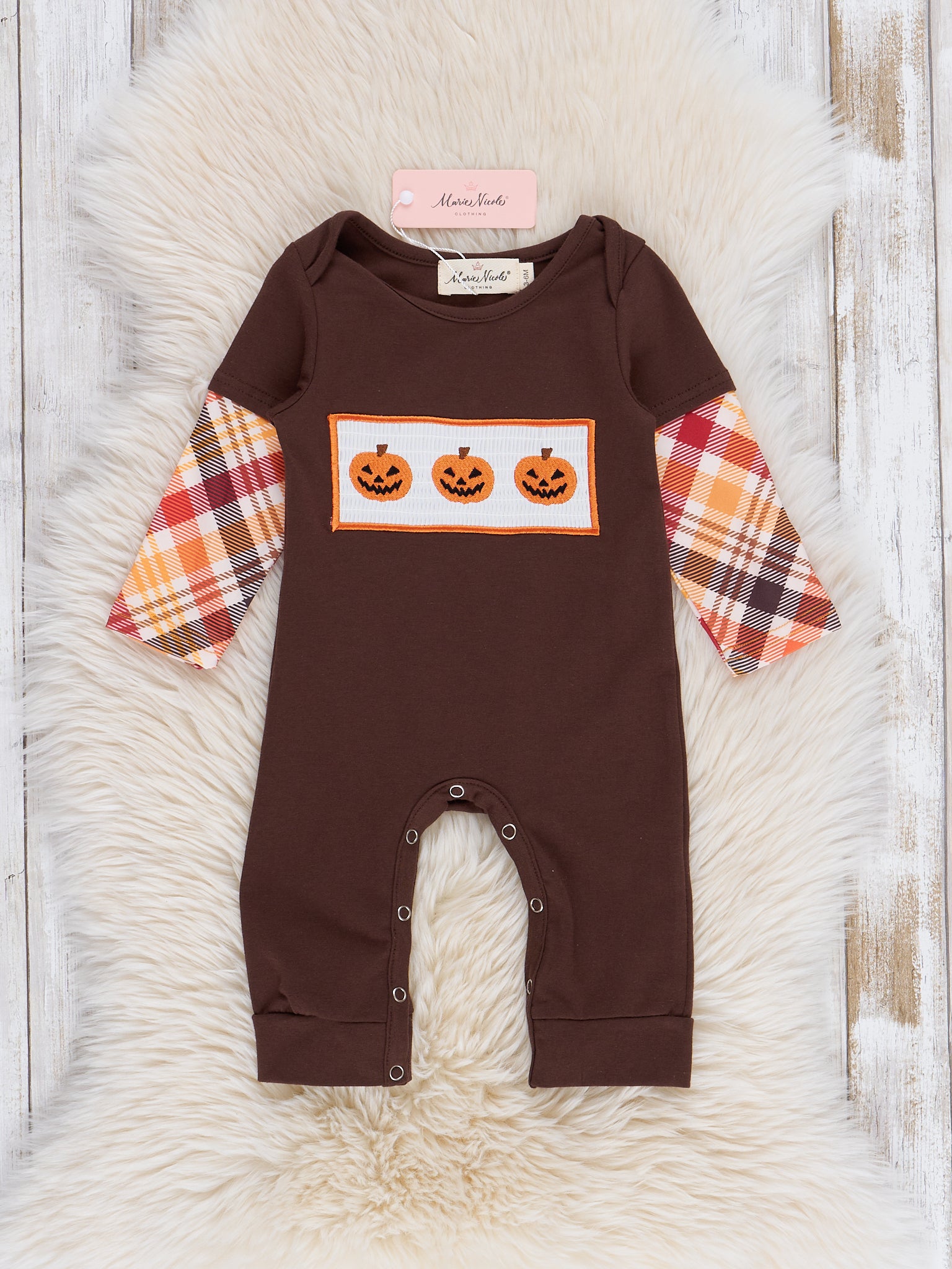 Brown Plaid Smocked Pumpkins Ruffle Bubble
