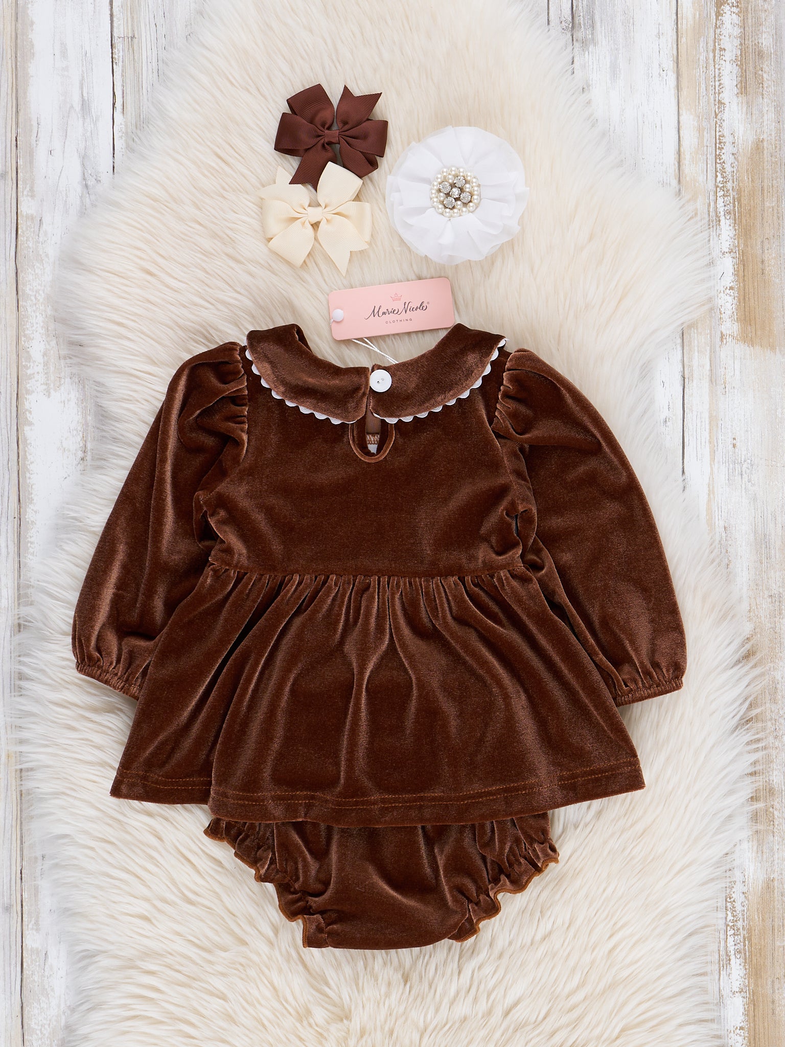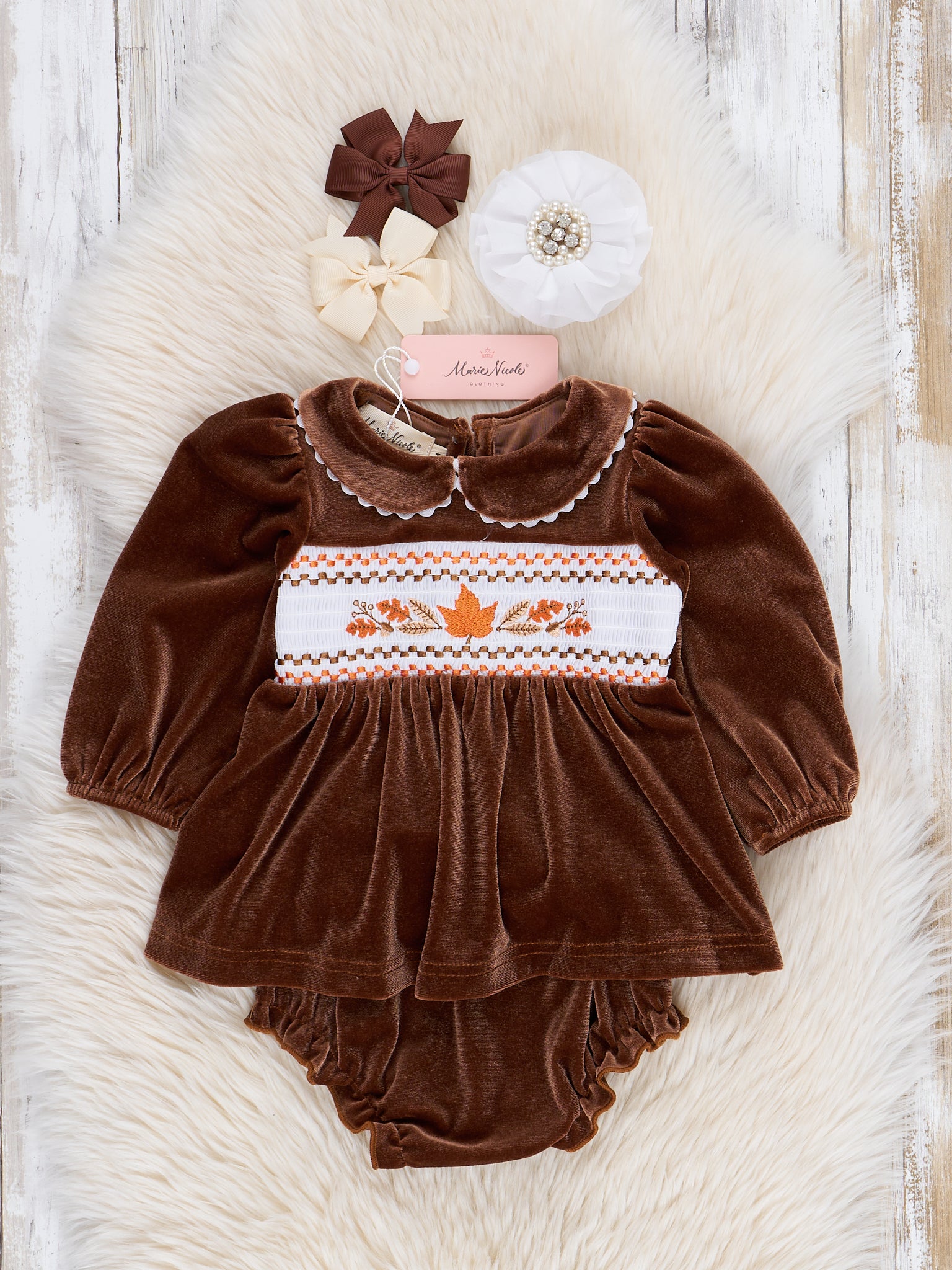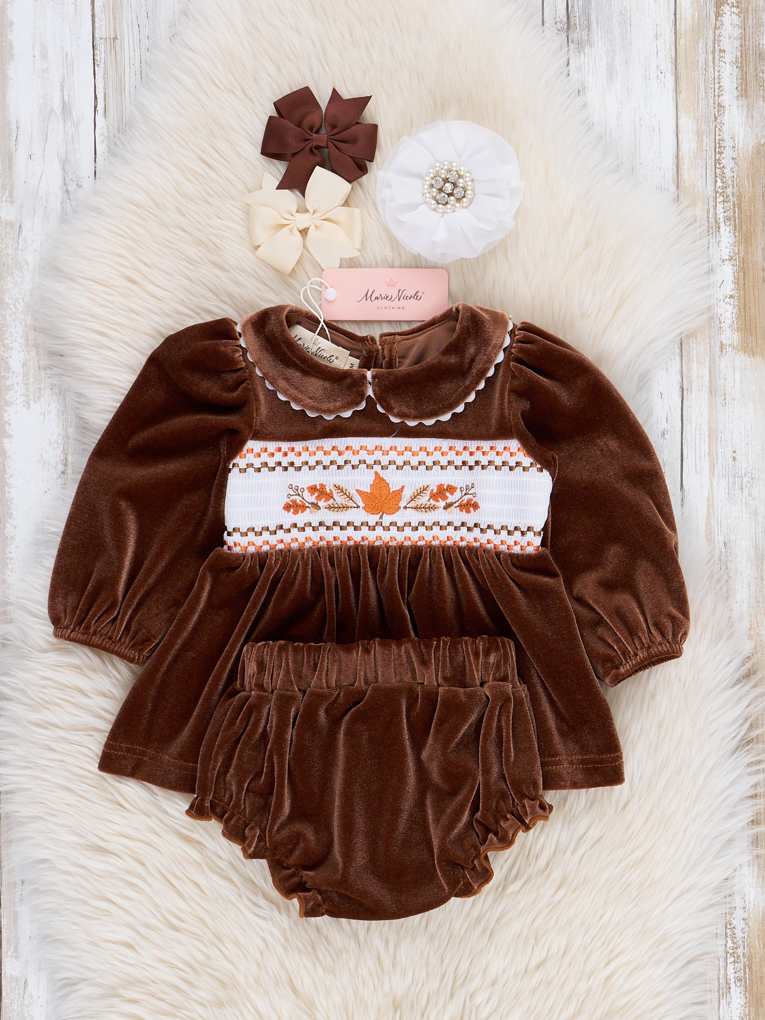 Brown Velvet Autumn Smocked Bloomers Outfit