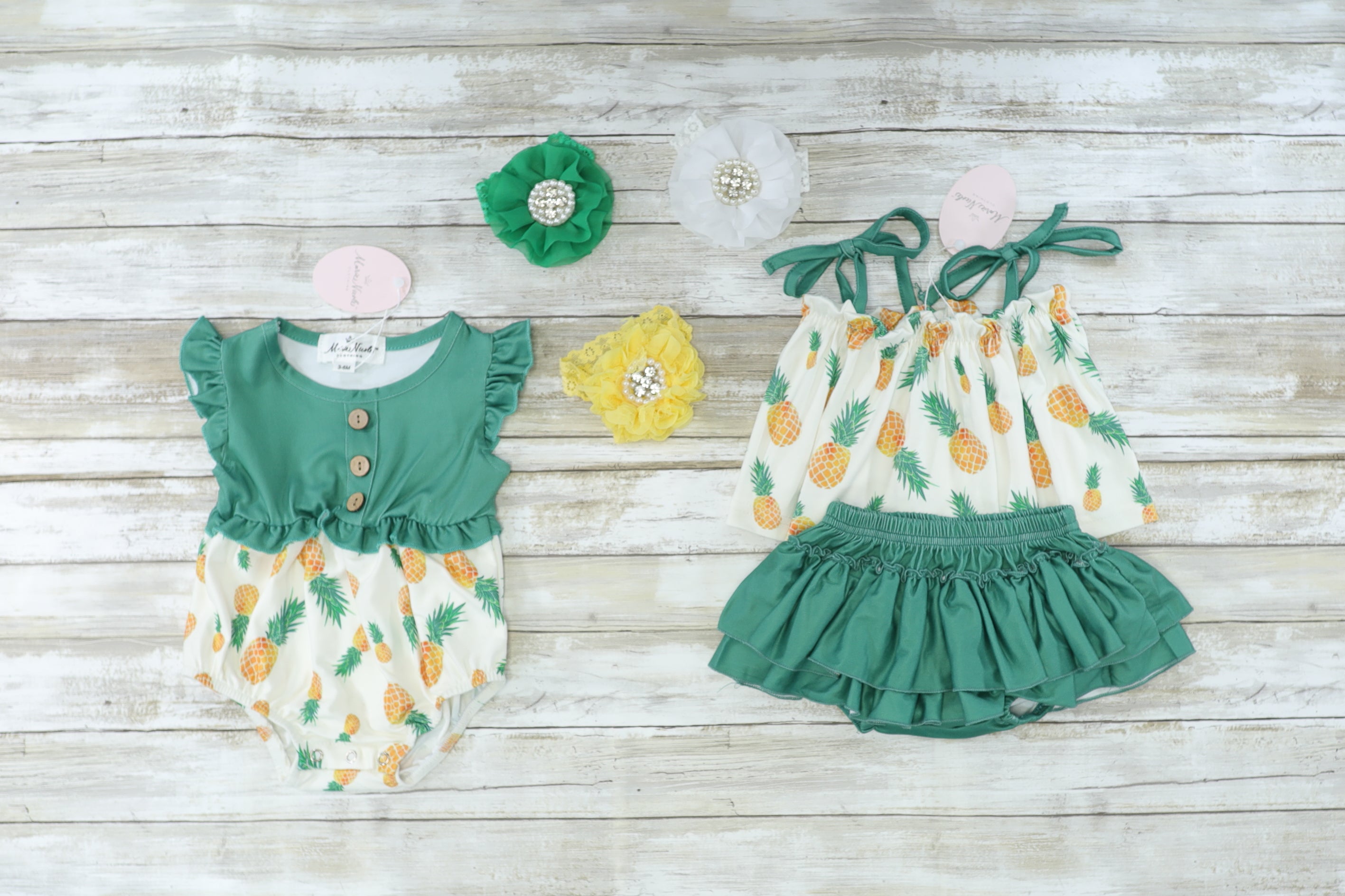In a world full of apples, be a pineapple! đ This bubble features cute ruffles, wooden buttons, & a pineapple print.