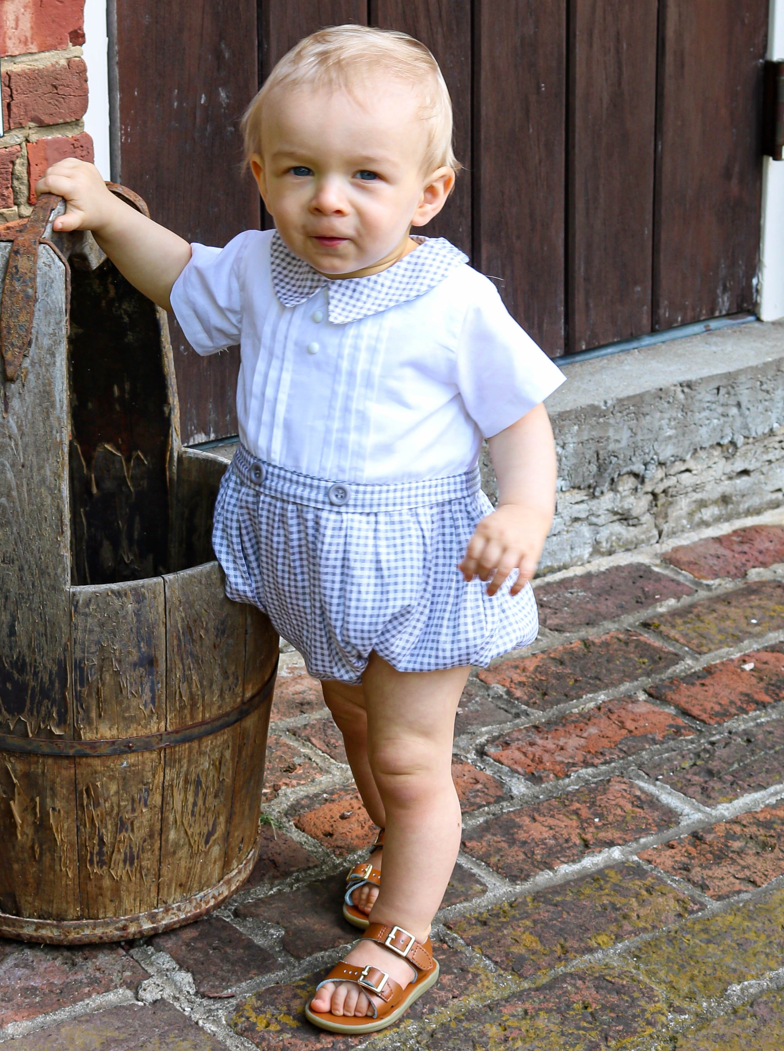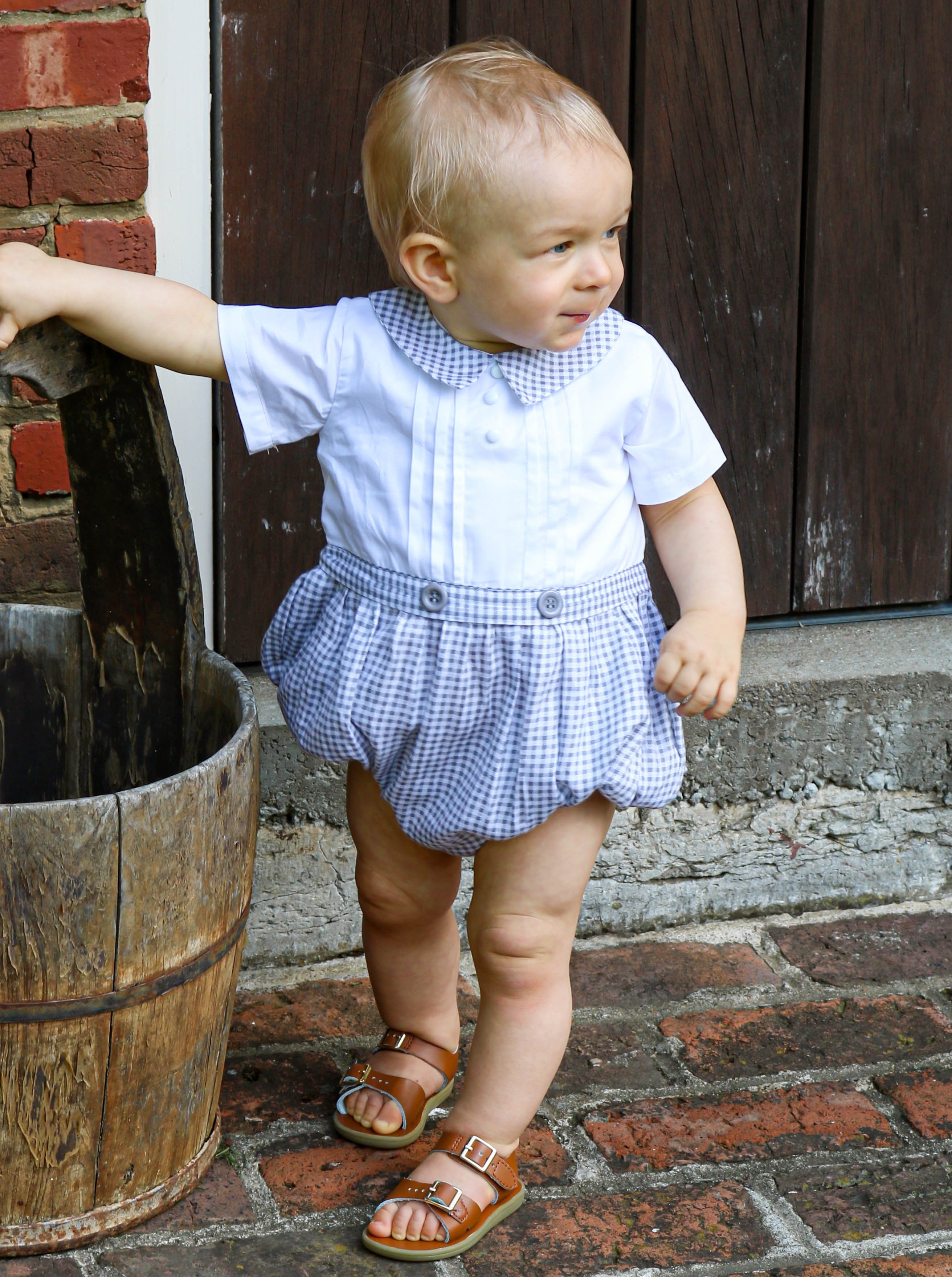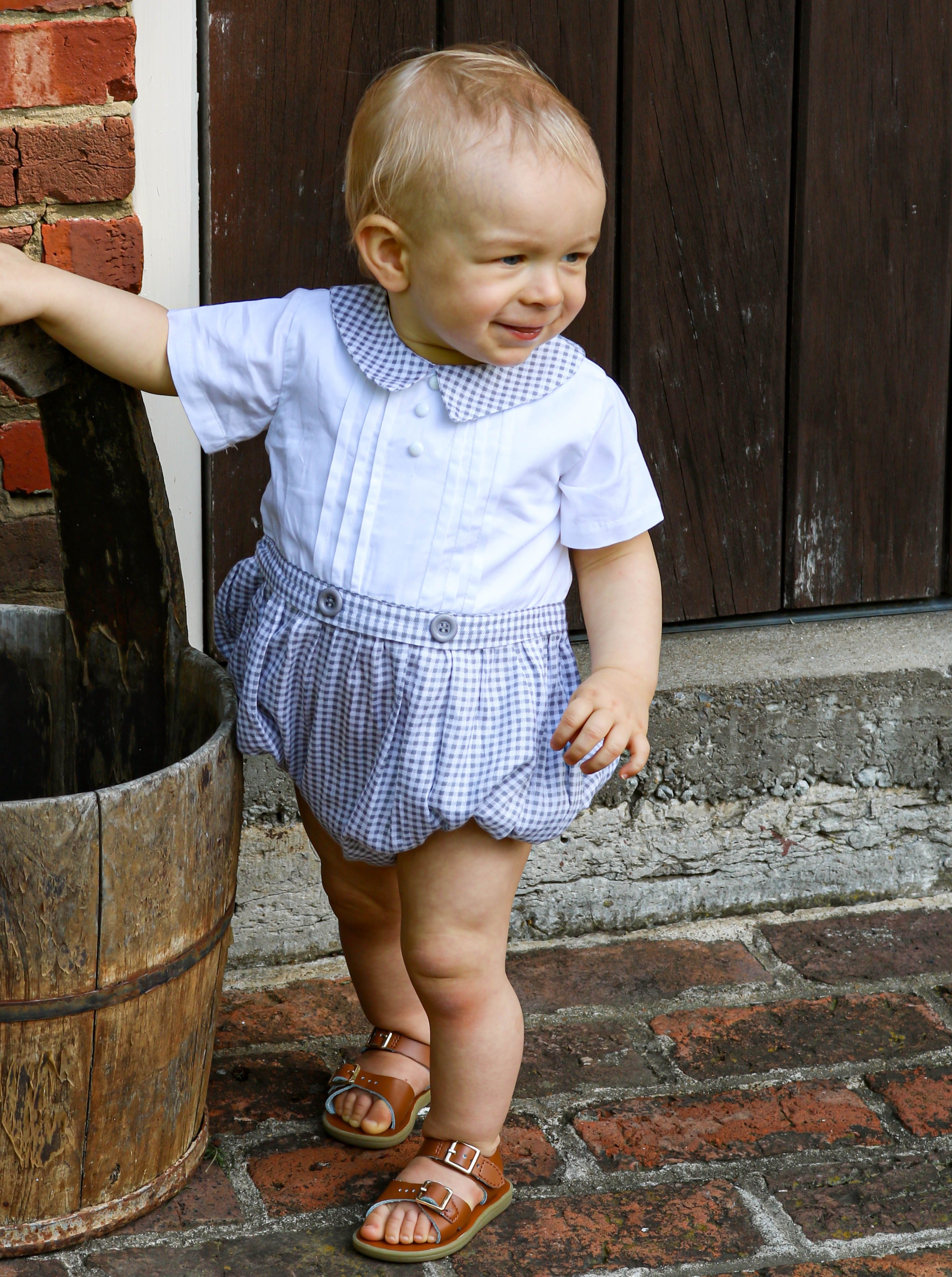 A classic bubble romper for your little! This is a great option for church, a Summer wedding... the list goes on! It features a collar, white & grey buttons, a white & grey gingham pattern, a zippered back, & snap buttons on the bottom making for easy diaper changes.