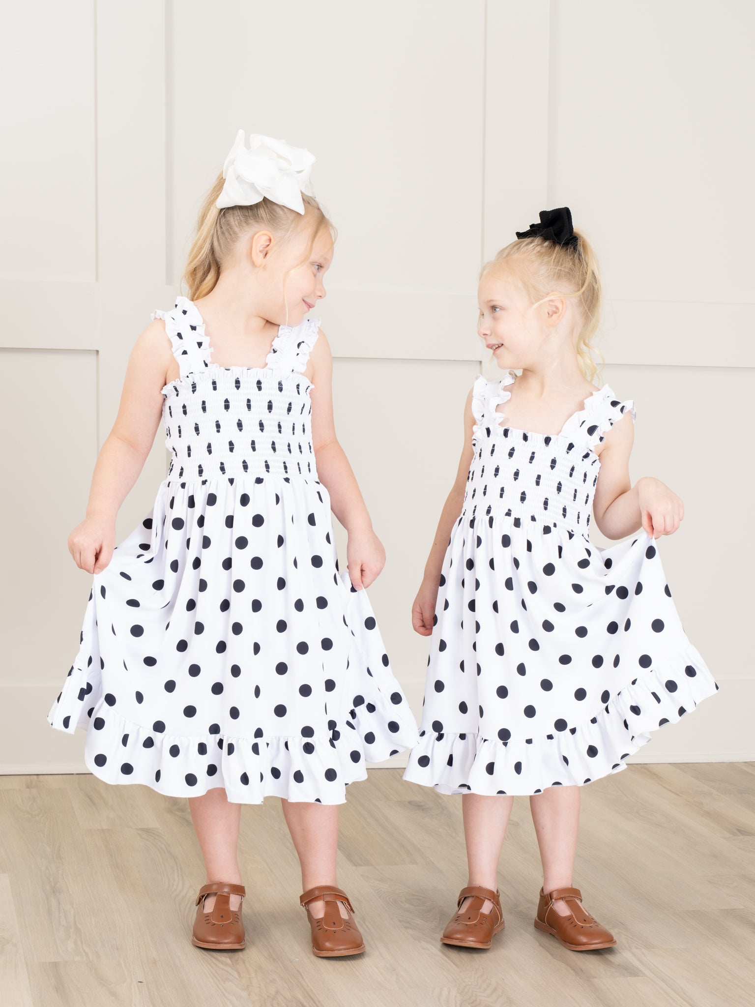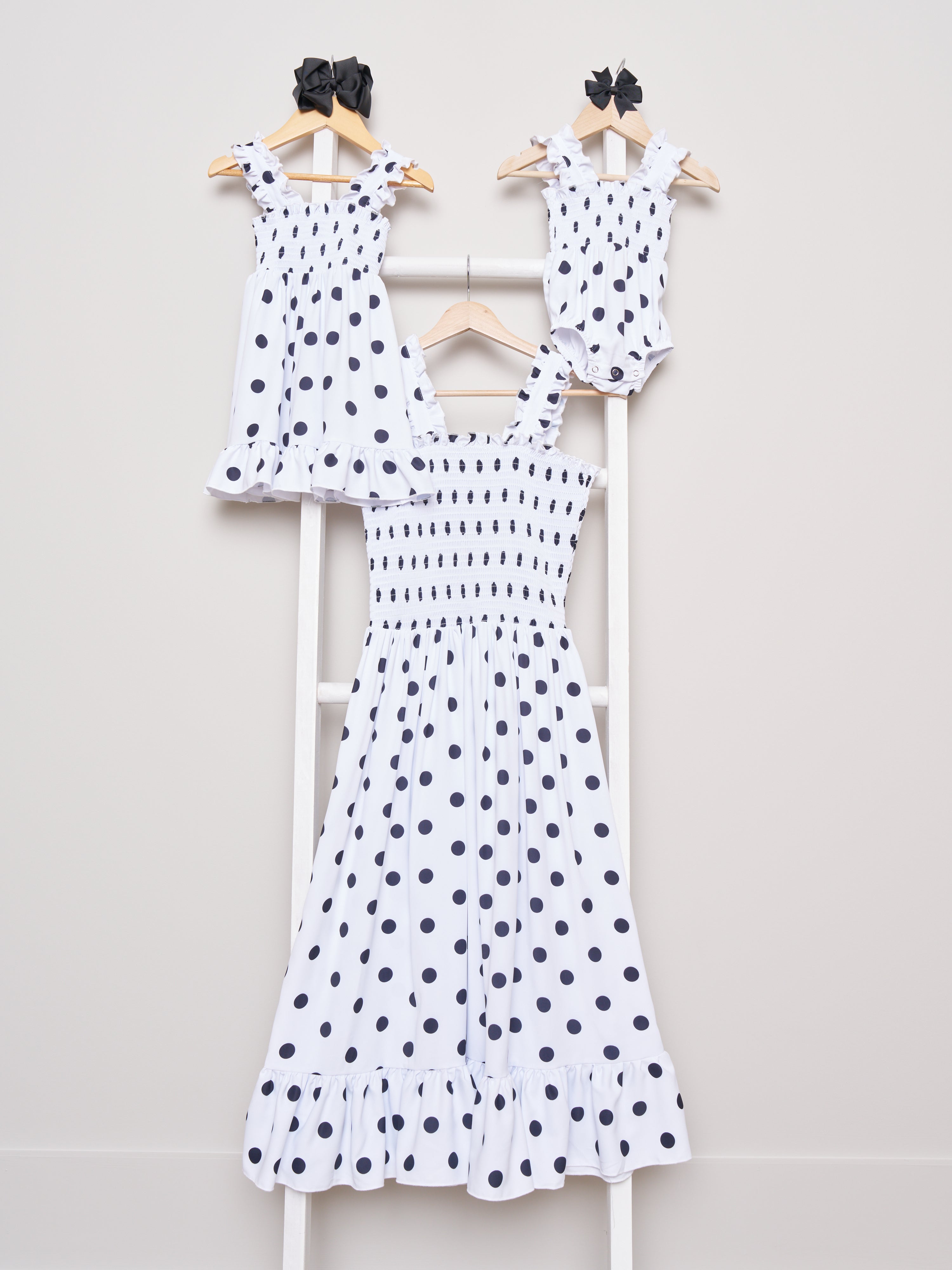 This Mom & Me Smocked Polka Dot Dress & Bubble set is a fun, stylish way for your little one to bond with you! Featuring sweet polka dots and delicate smocking, these matching outfits feature ruffles for an extra bit of flair. Perfect for a girl's day out!