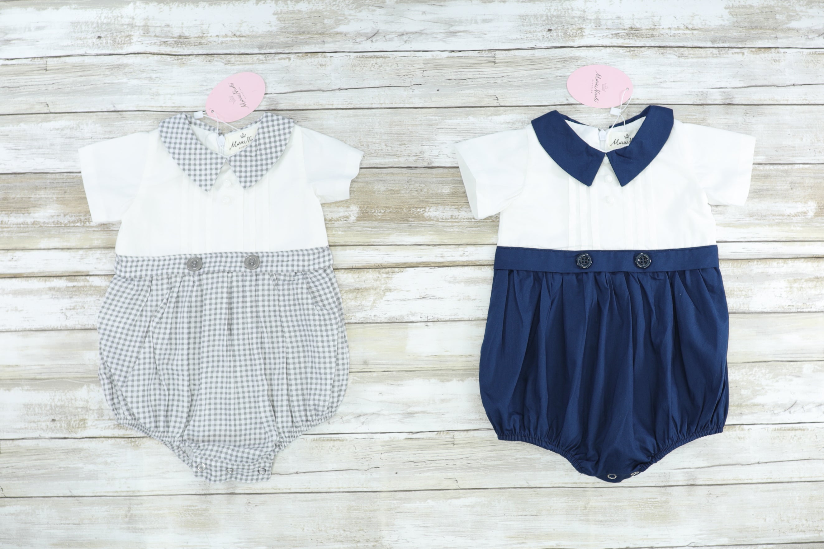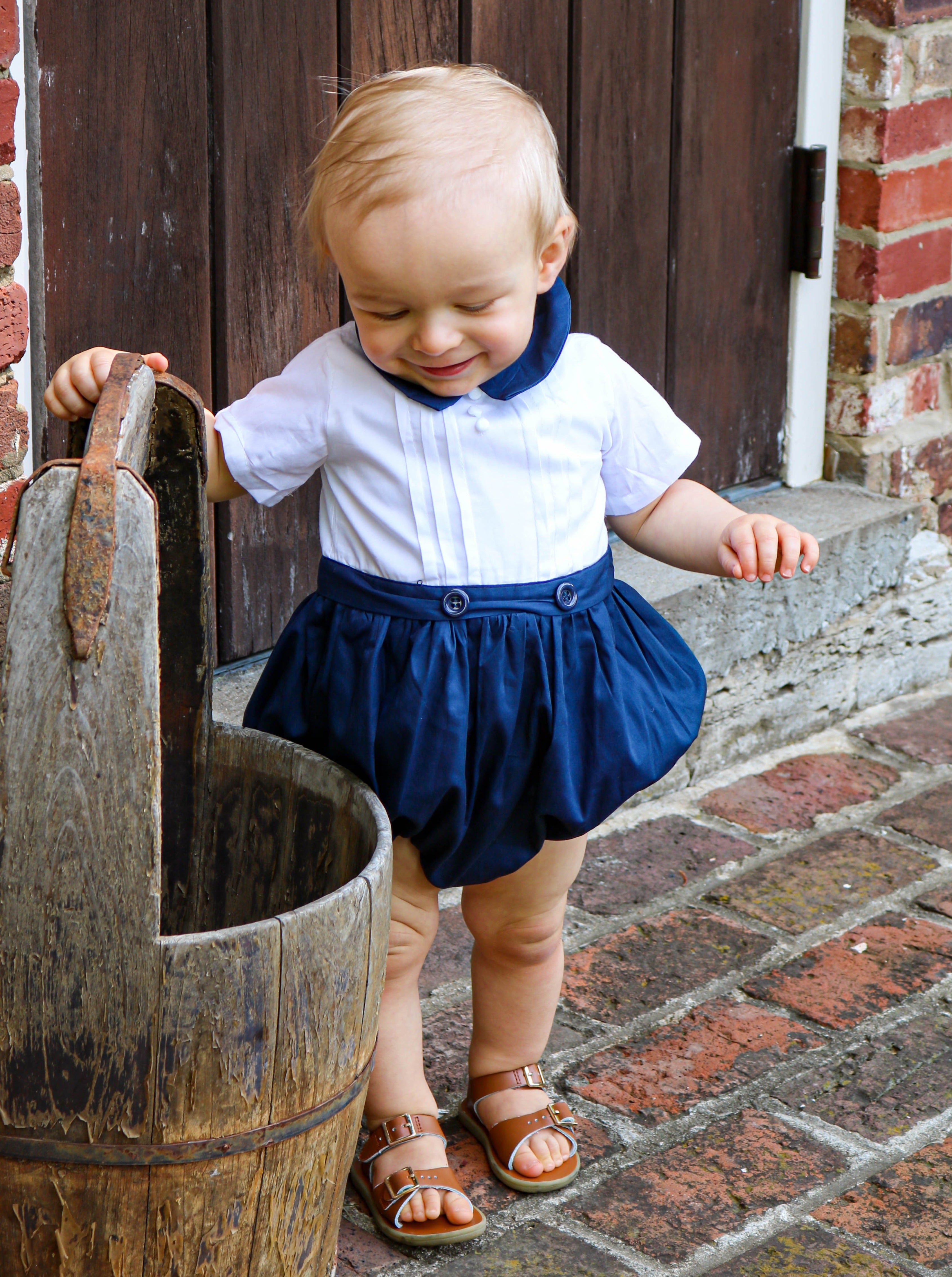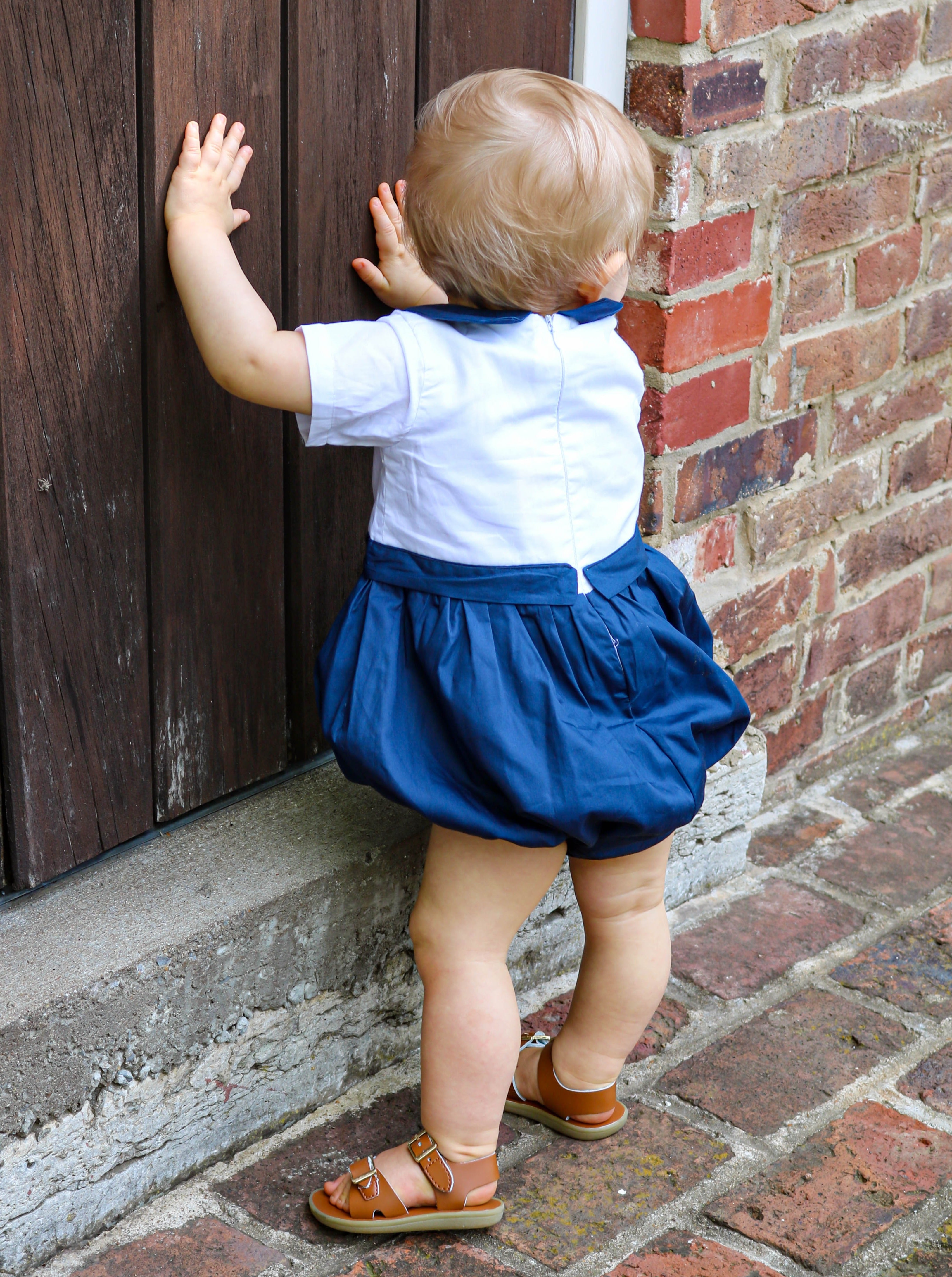 A classic bubble romper for your little! This is a great option for church, a Summer wedding... the list goes on! It features a collar, white & blue buttons, a zippered back, & snap buttons on the bottom making for easy diaper changes.