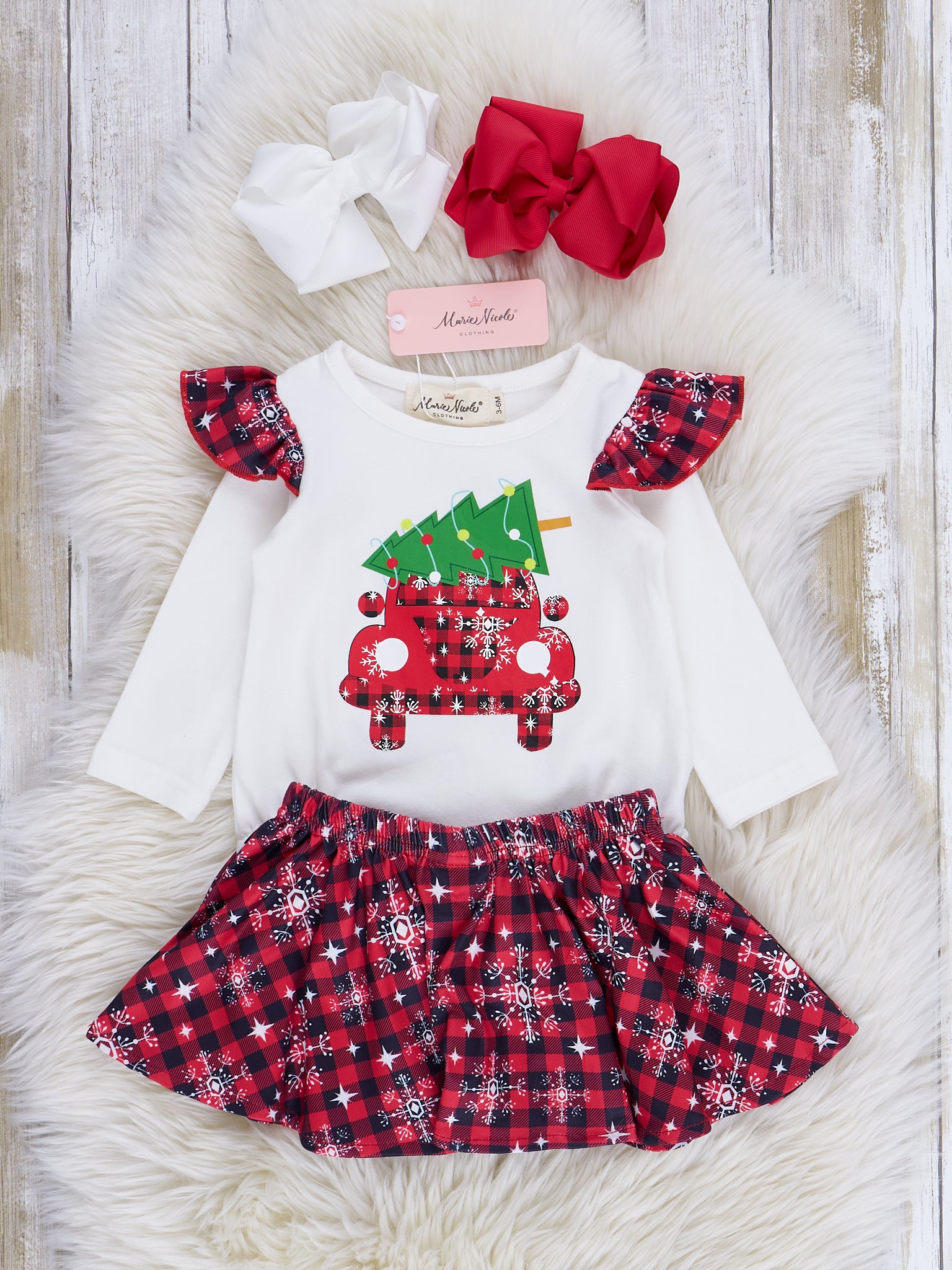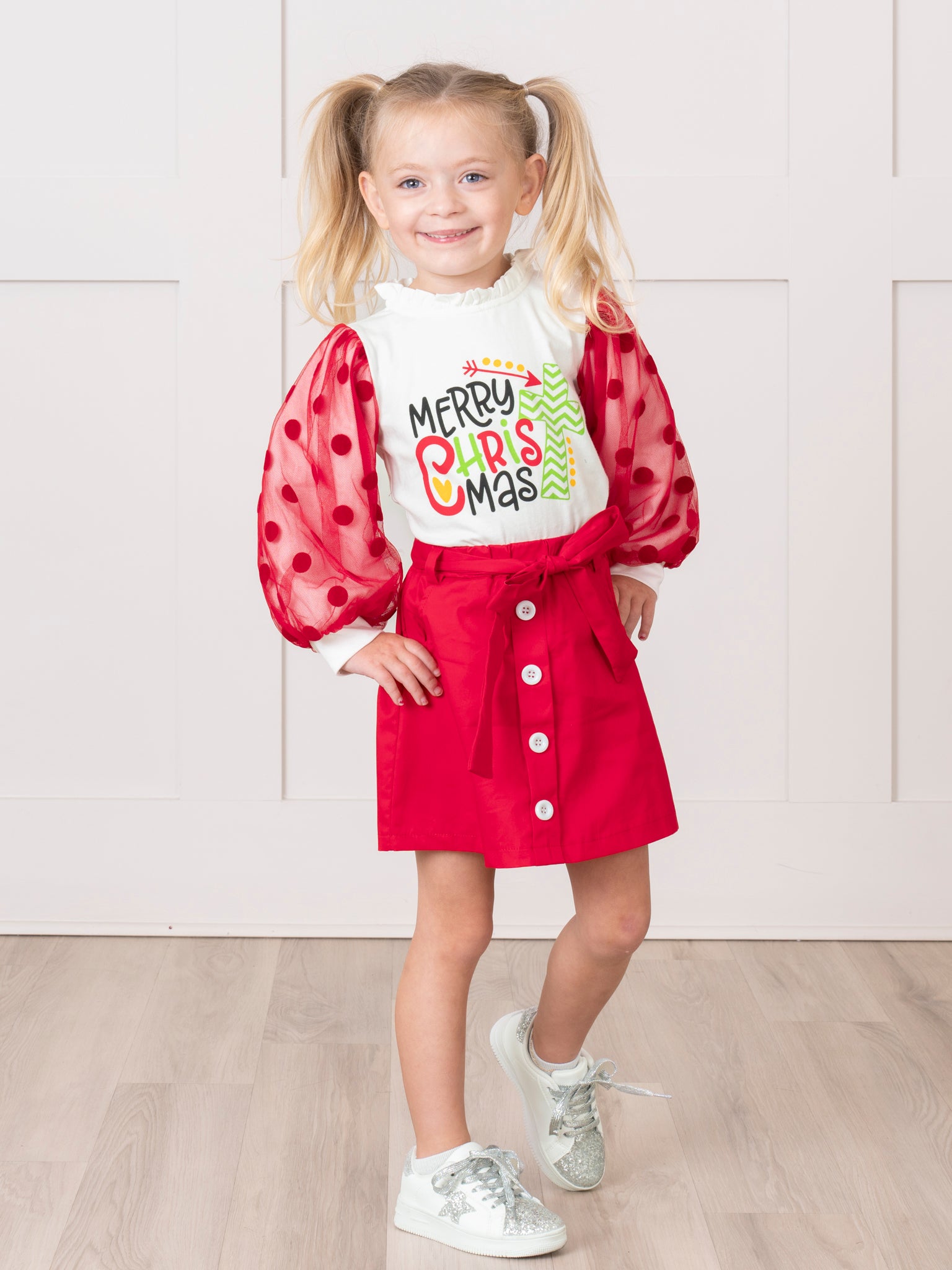 Red & White Bubble Sleeve Christmas Outfit w/ Skirt