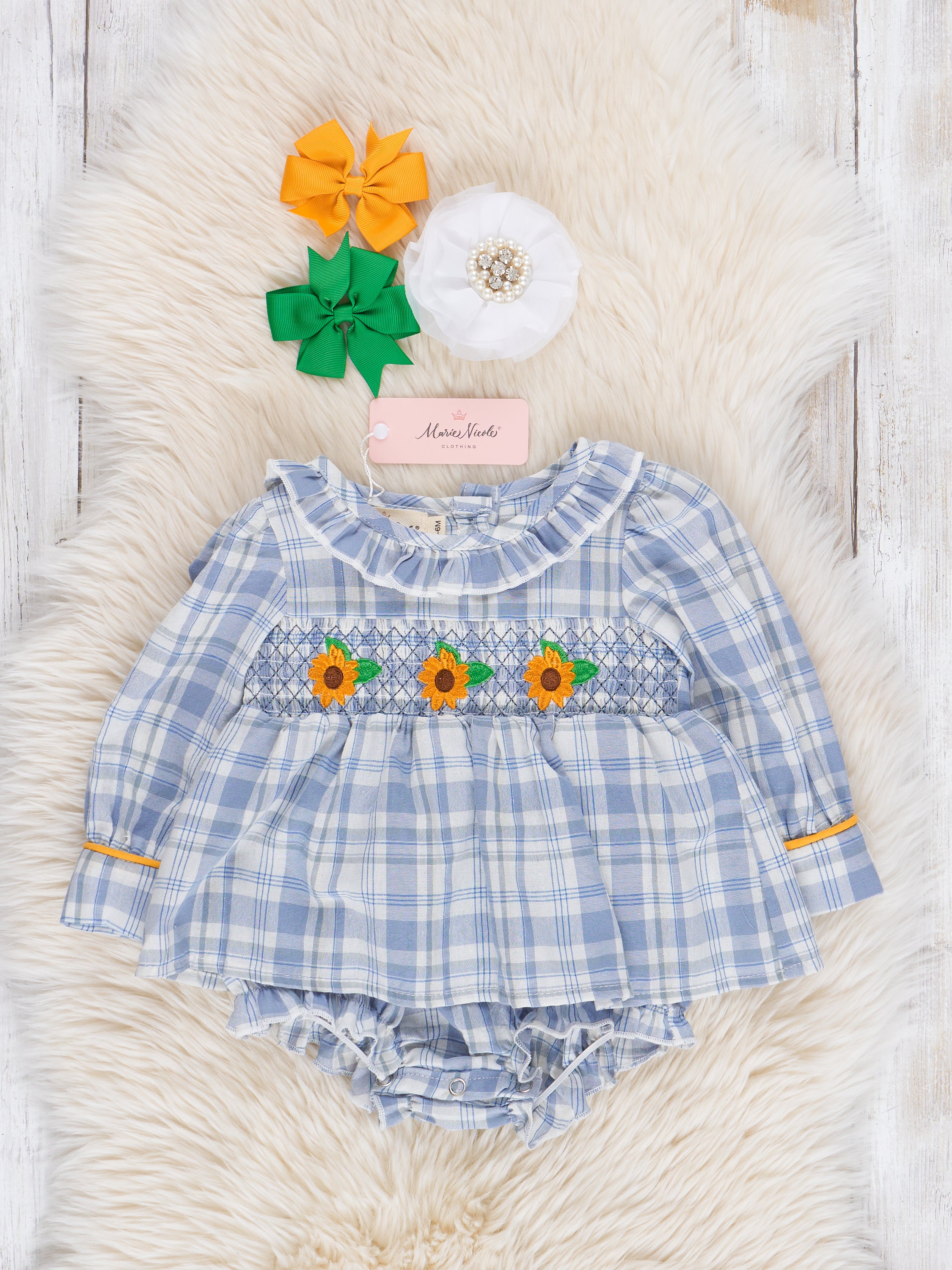 Blue Plaid Smocked Sunflower Peplum Bubble