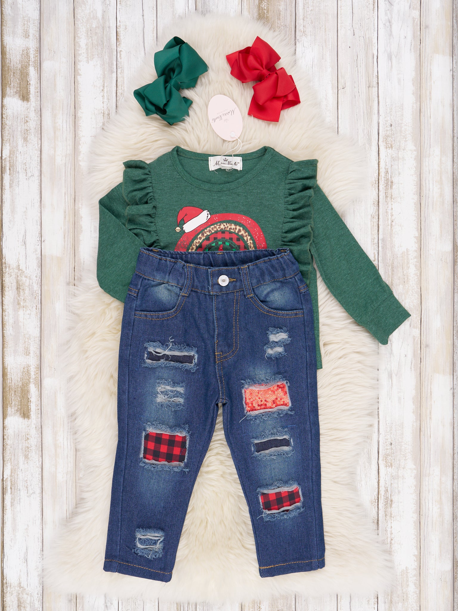 Buffalo Plaid Rainbow Ruffle Top & Distressed Denim Outfit