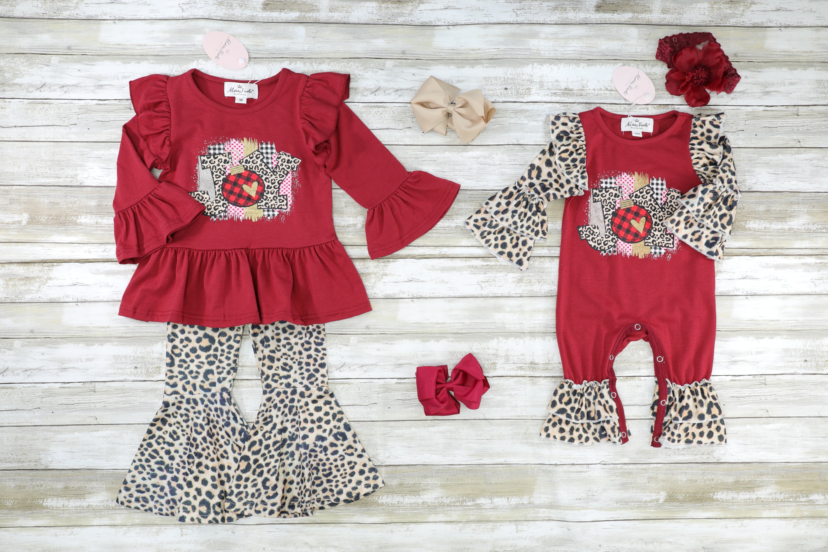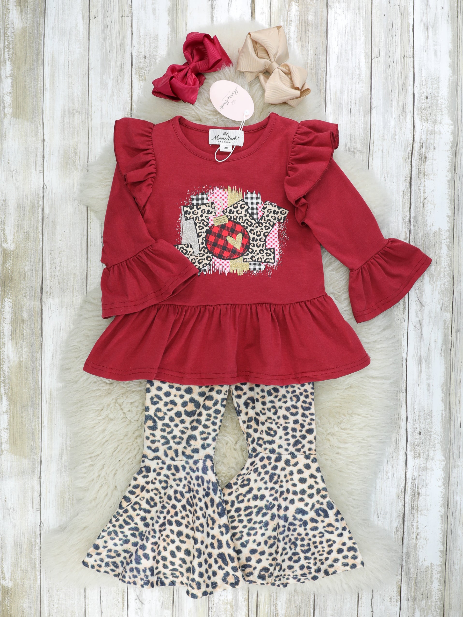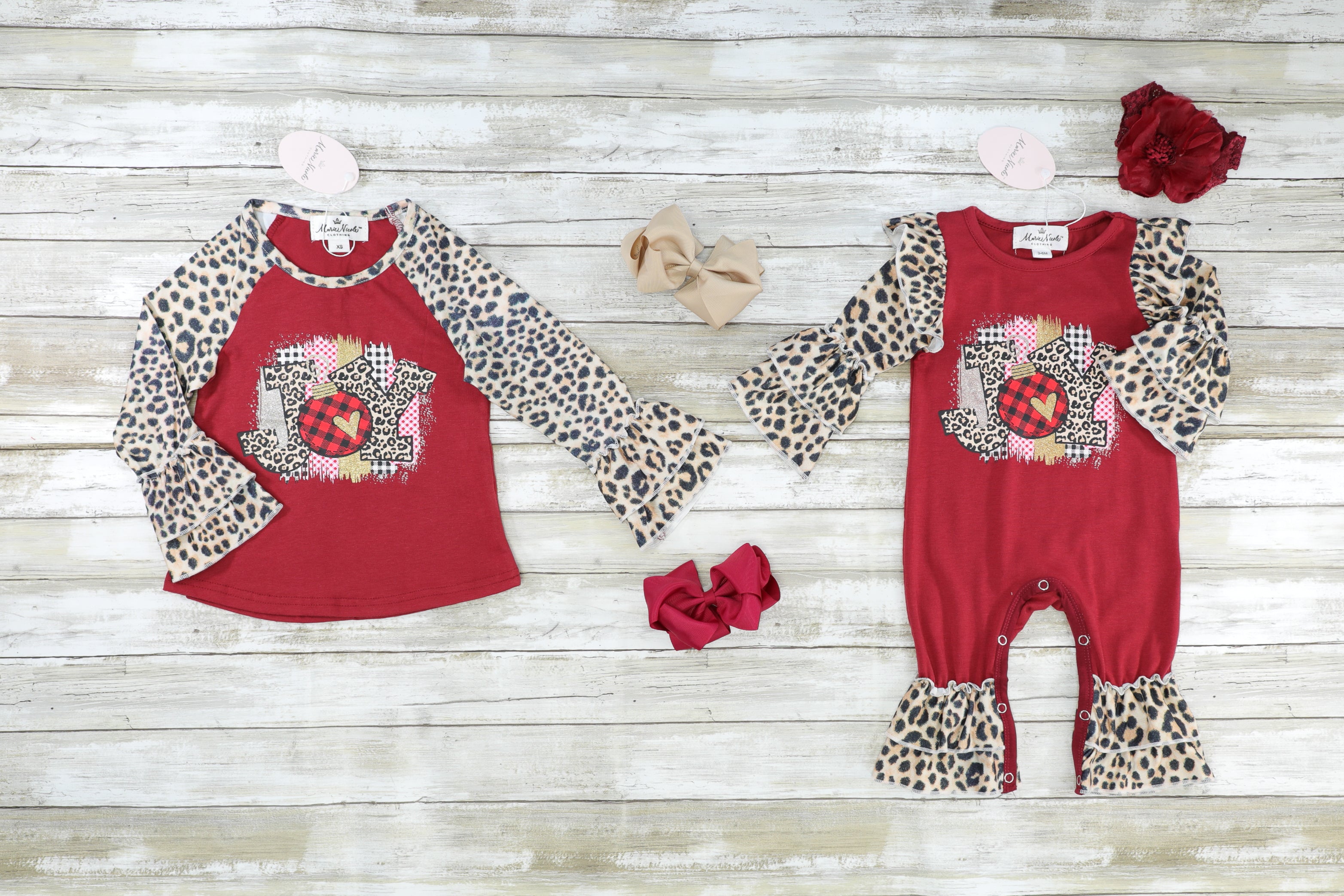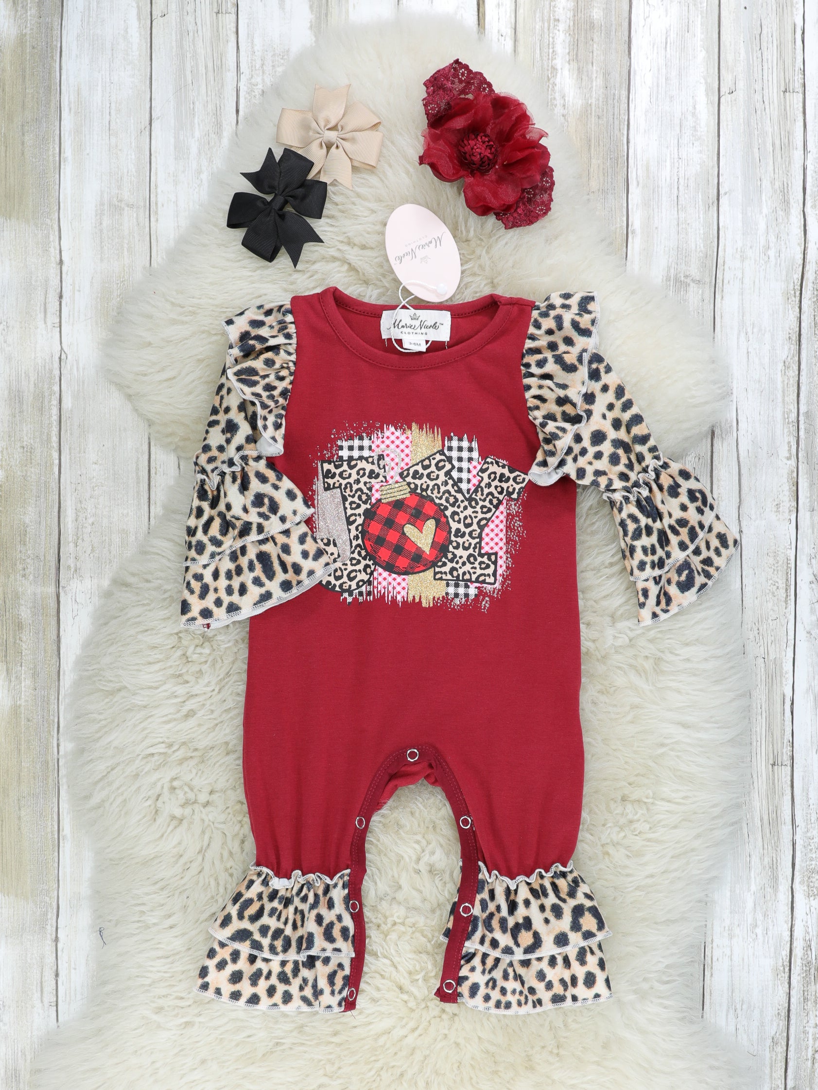 Burgundy "Joy" Leopard Ruffle Raglan Romper