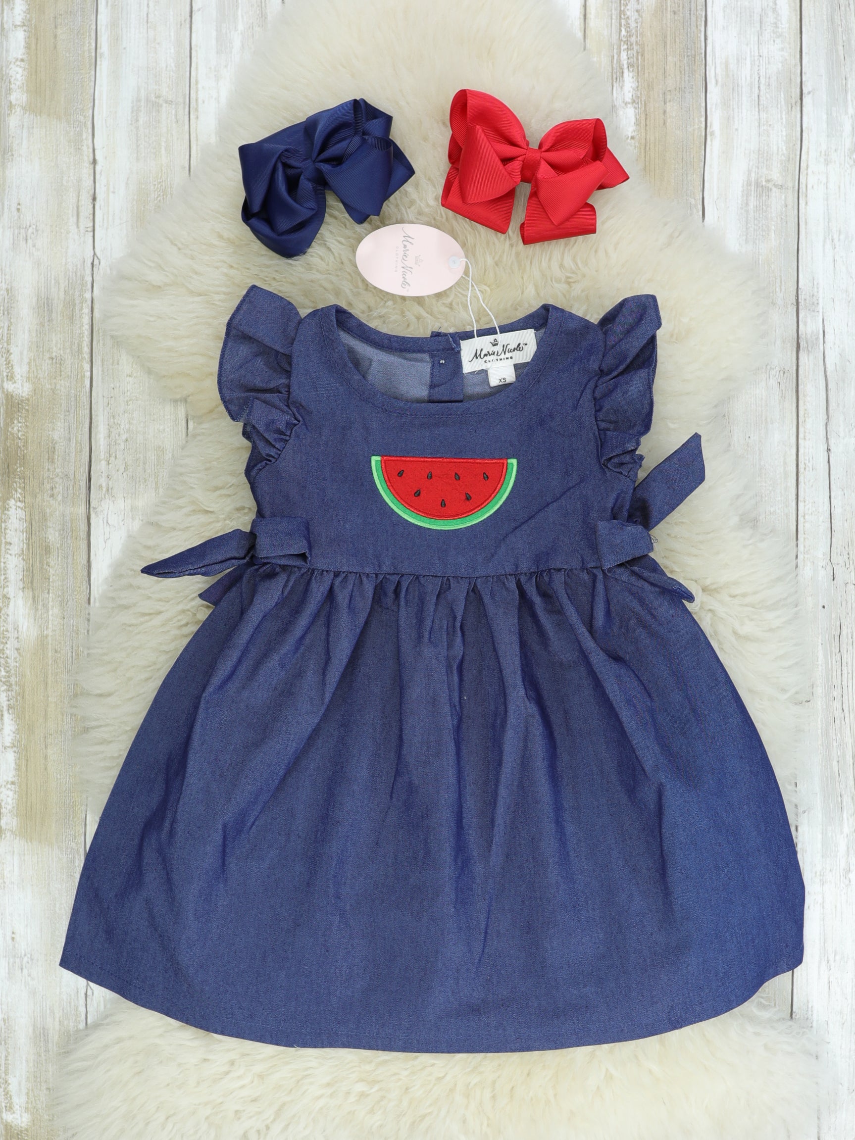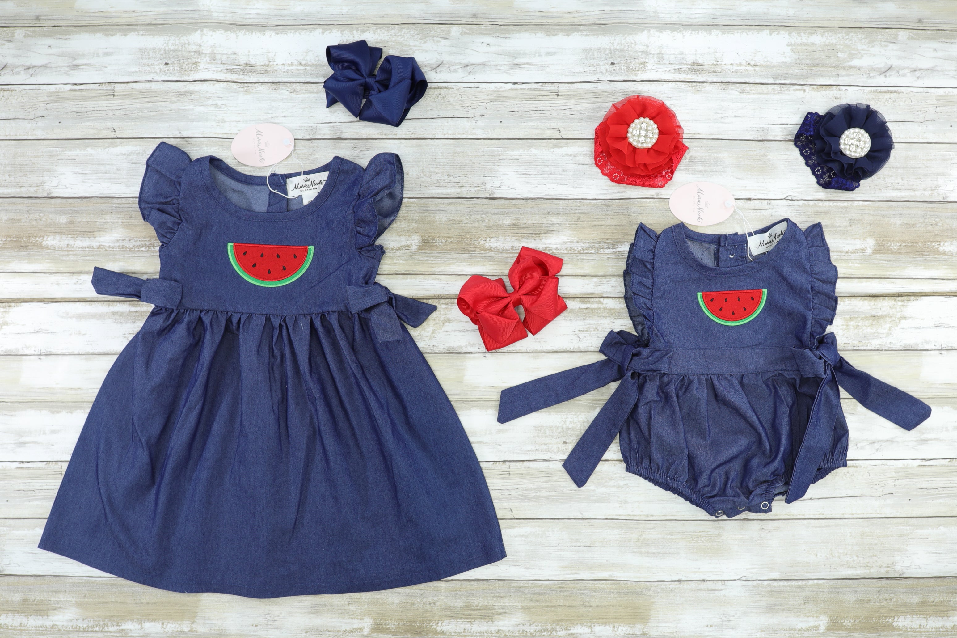 More watermelon, please! The perfect set for your sweet sisters! This chambray dress features ruffle flutter sleeves, a watermelon appliqué, & bows on both sides at the chest.