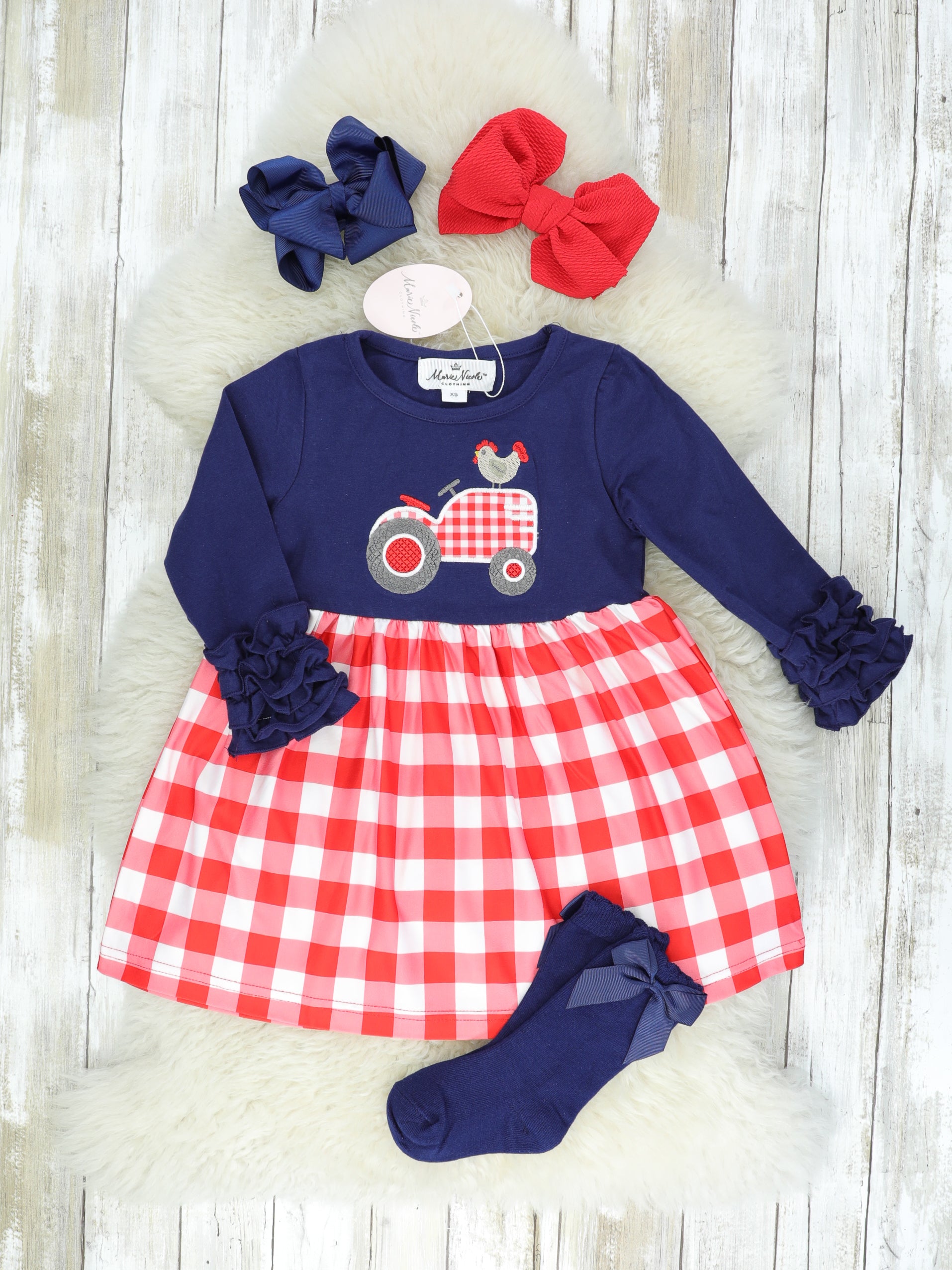 Chicken On A Tractor Navy Icing Check Dress With Socks