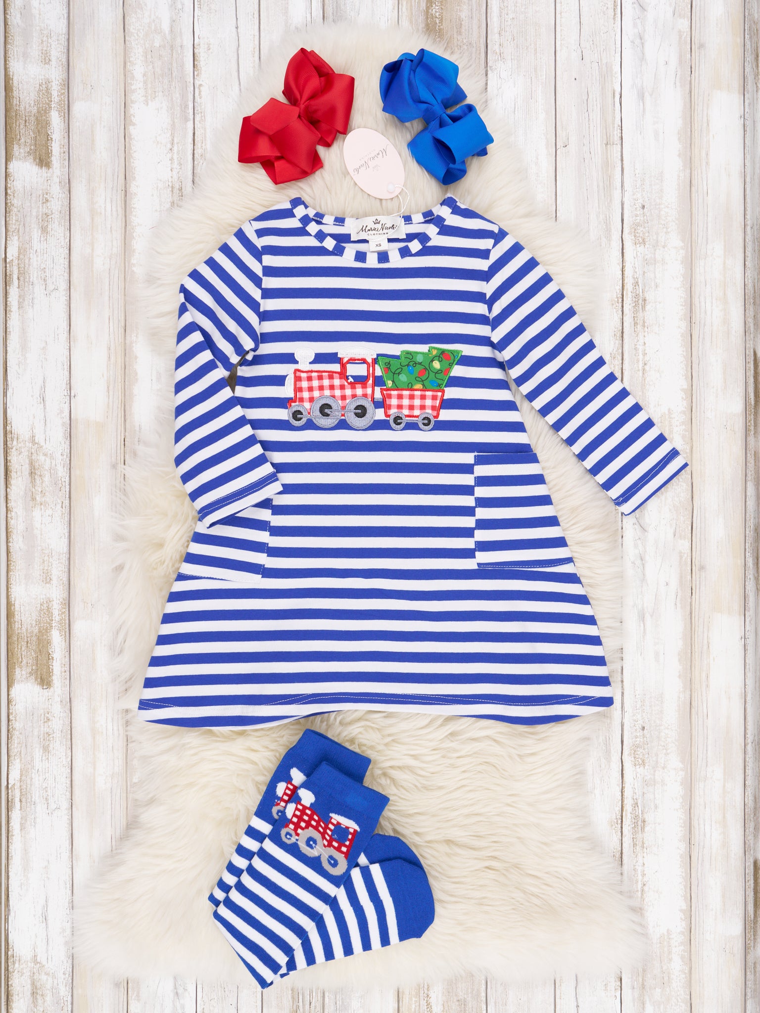 Blue Striped Christmas Tree Train Pocket Dress