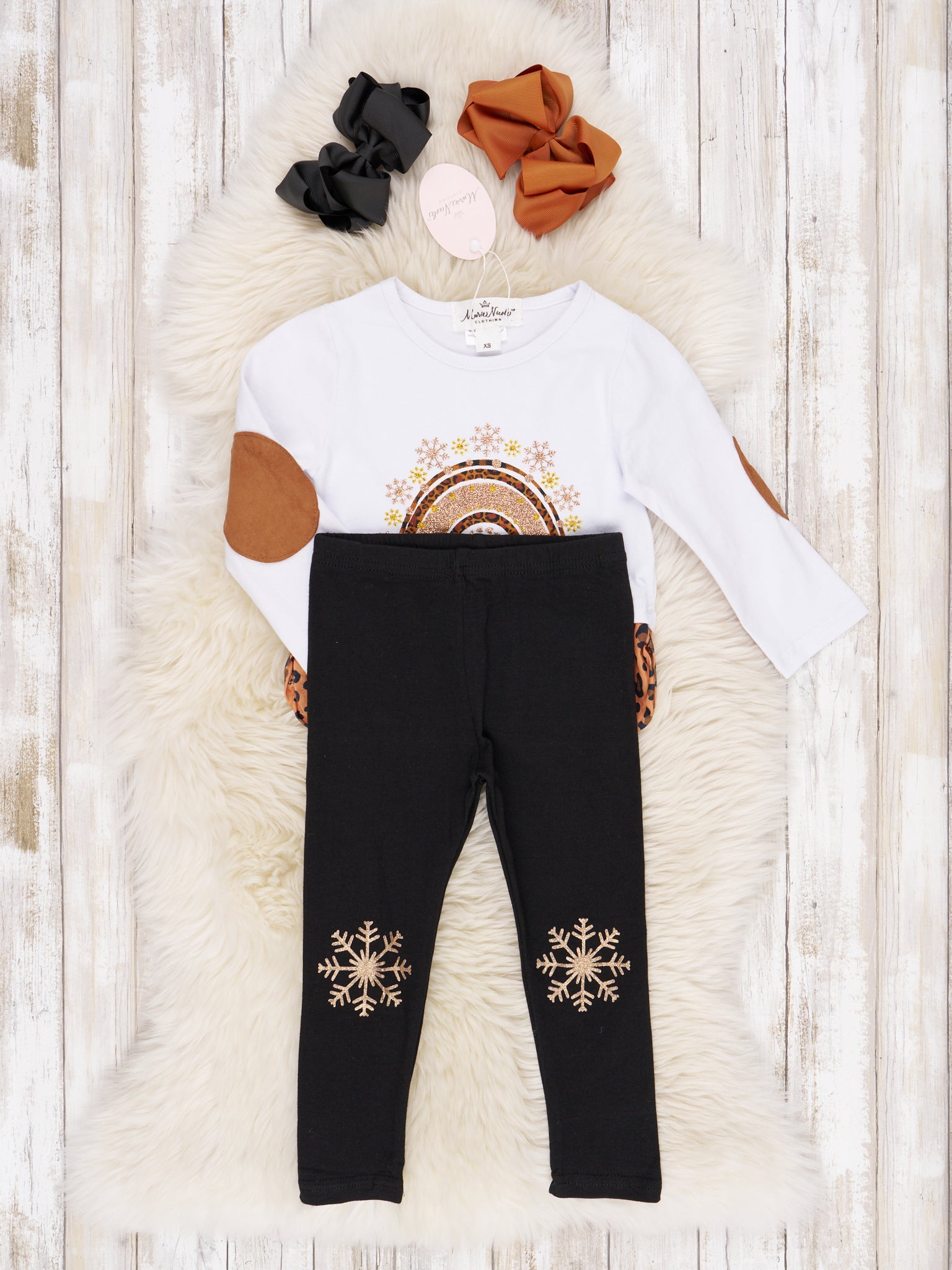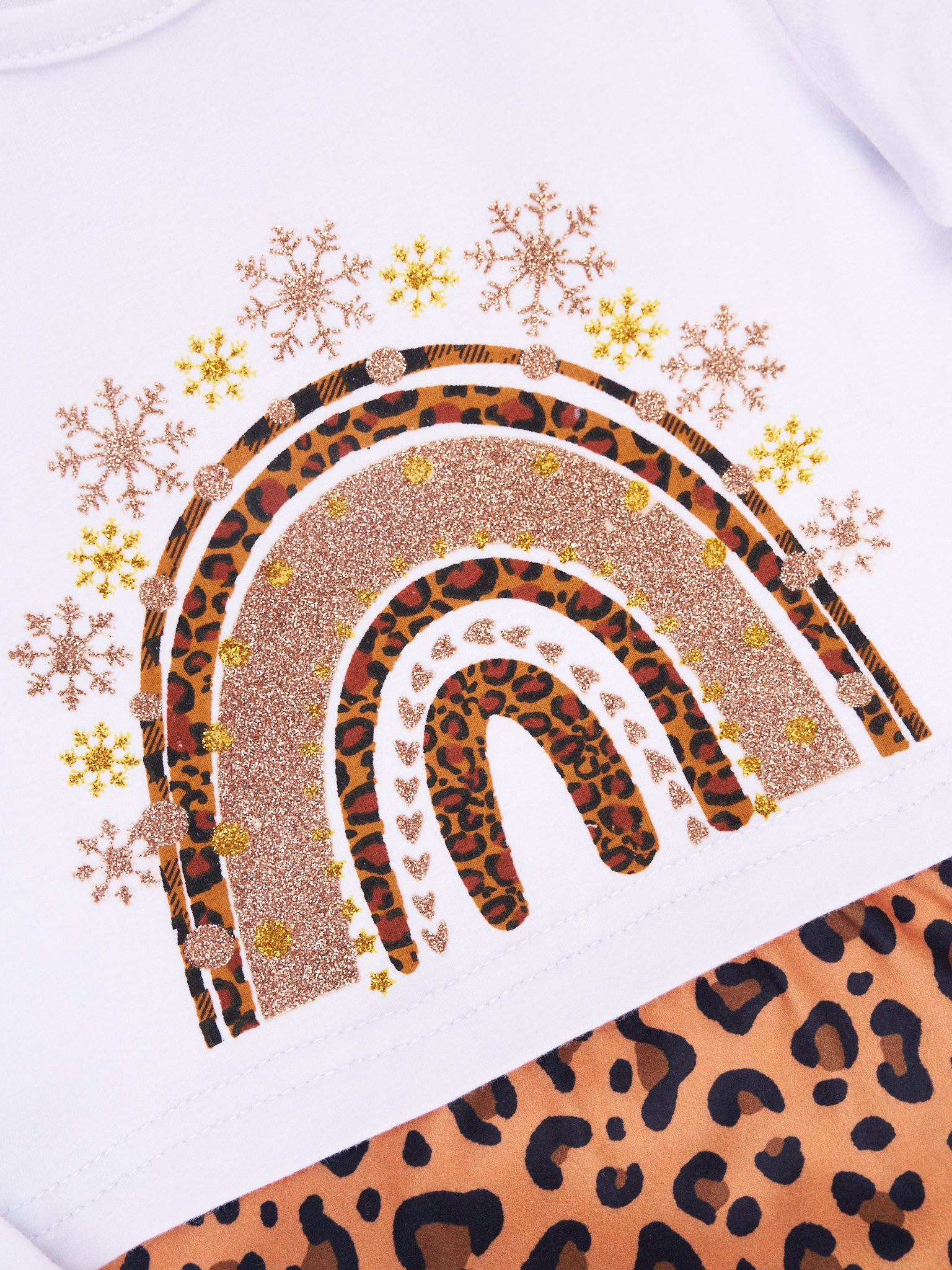 Unleash the party animal in your little one with this Golden Leopard Rainbow Outfit! Sparkle in the snowflake details that shimmer and shine. Look cool and stylish this Christmas in this trendy and festive ensemble. It's a wild ride!