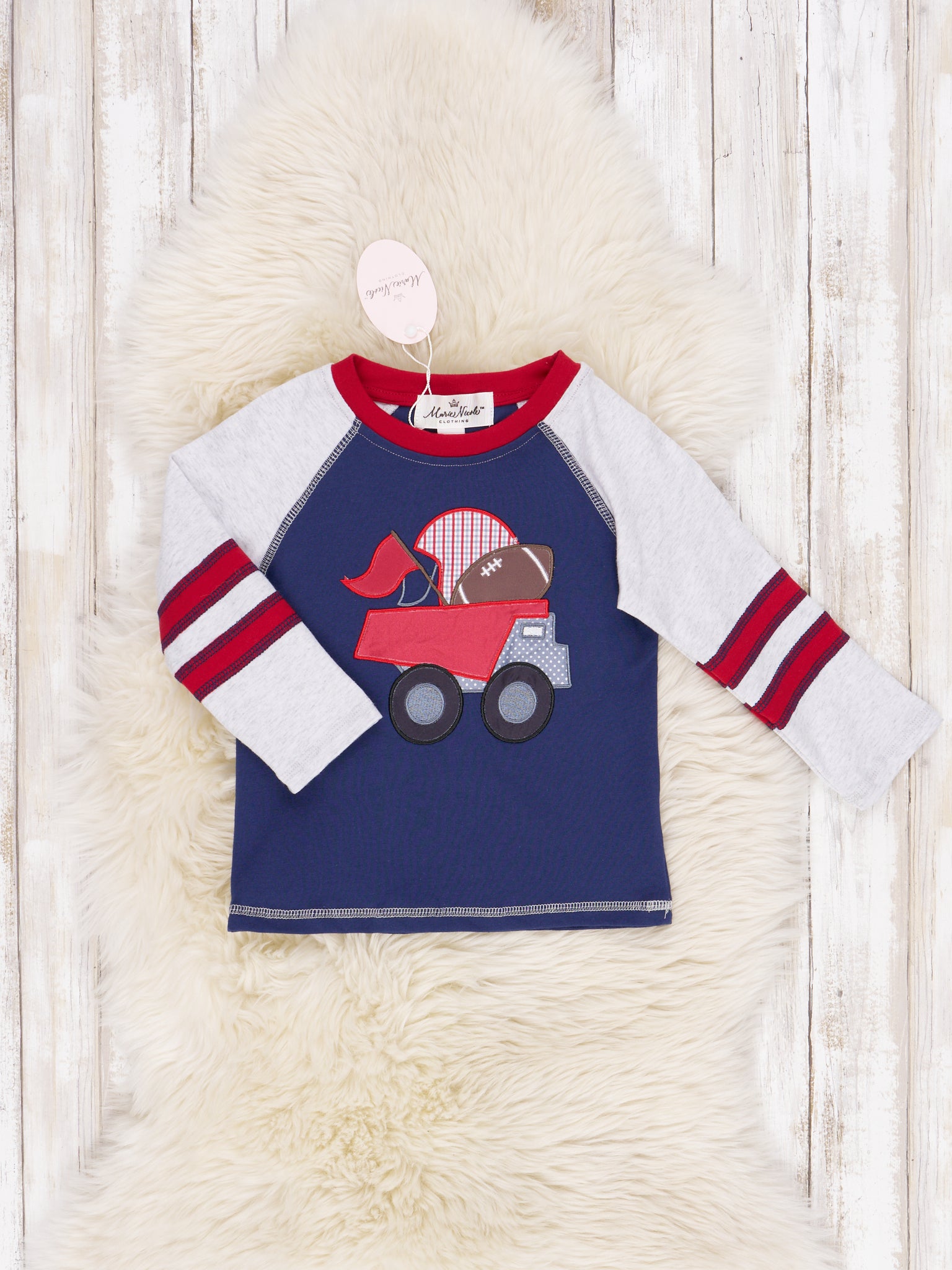 This Navy Football Raglan Shirt is for anyone who's a fan of both cute style and gridiron glory! Featuring a football dump truck appliqué, classic raglan sleeves and maroon trim, it's the perfect way to get your little one ready for game day. Get your kiddo suited up and ready to hit the field in this one-of-a-kind shirt!