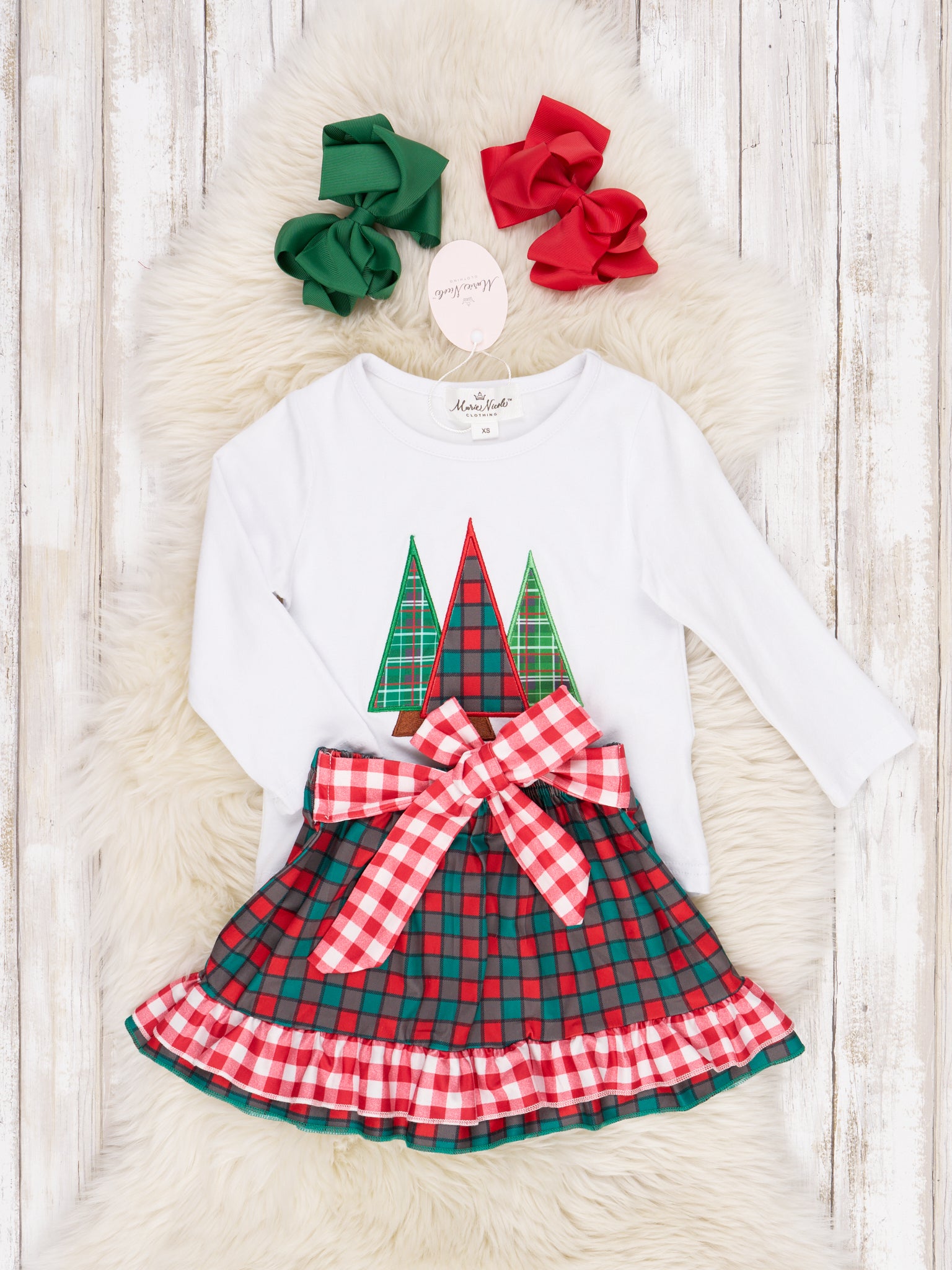 This Plaid Christmas Tree Ruffle Skirt Outfit is the perfect way to stand out this holiday season! The unique white top features a festive Christmas tree appliqué and is perfectly paired with a plaid skirt that's topped off with ruffles.