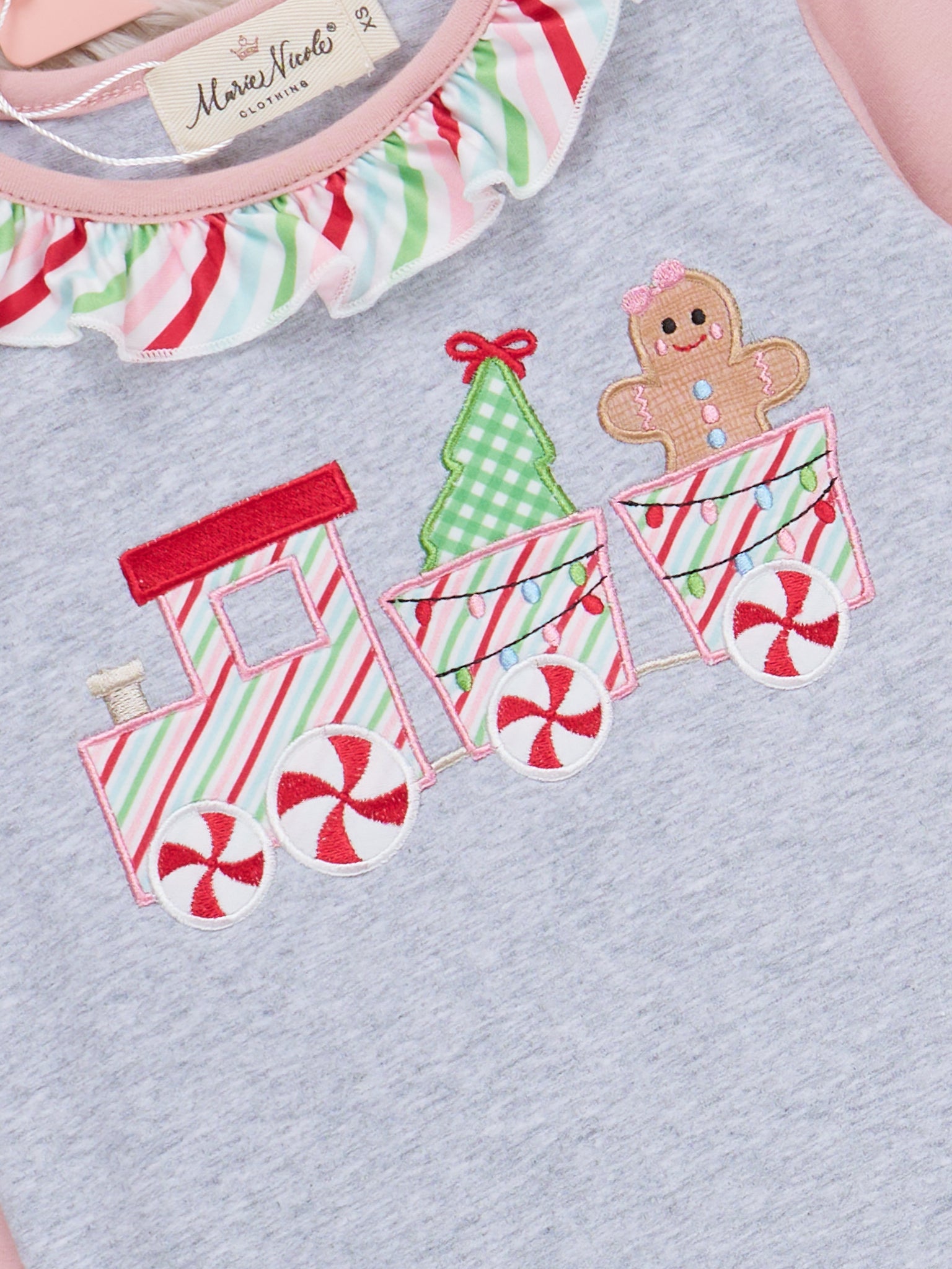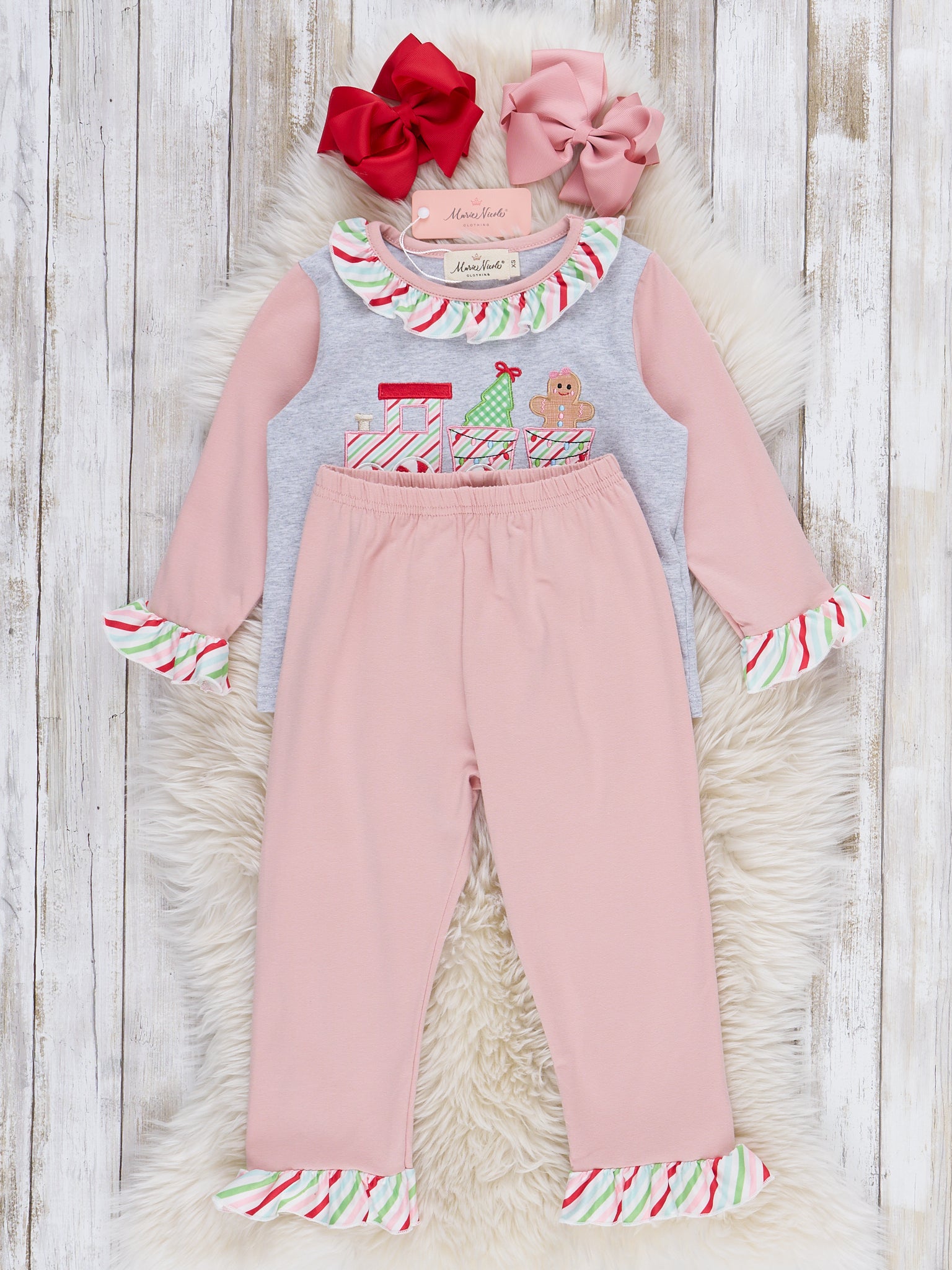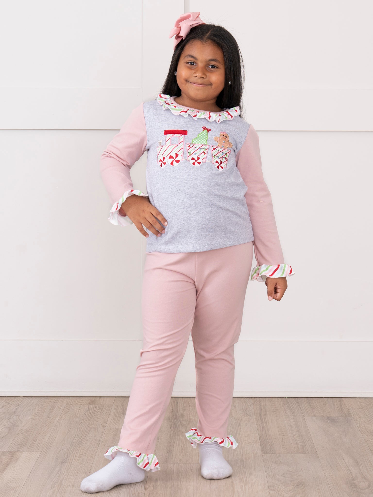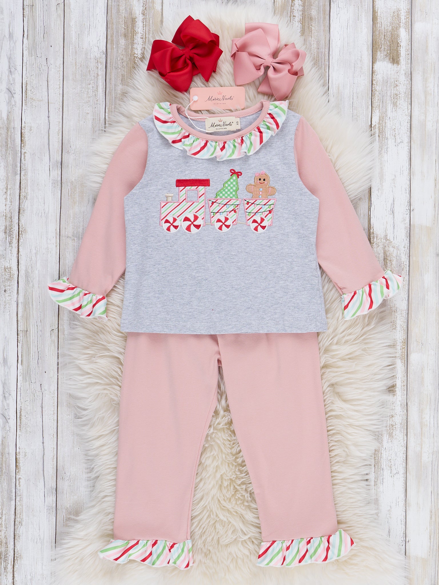 The Peppermint Trim Ruffle Pajamas from Marie Nicole Clothing bring festive cheer to your little one’s holiday wardrobe! This adorable set features a top with peppermint details and a ruffled collar, paired with matching pants that have ruffled trim at the cuffs. Perfect for cozy holiday moments, these pajamas offer both comfort and holiday magic.