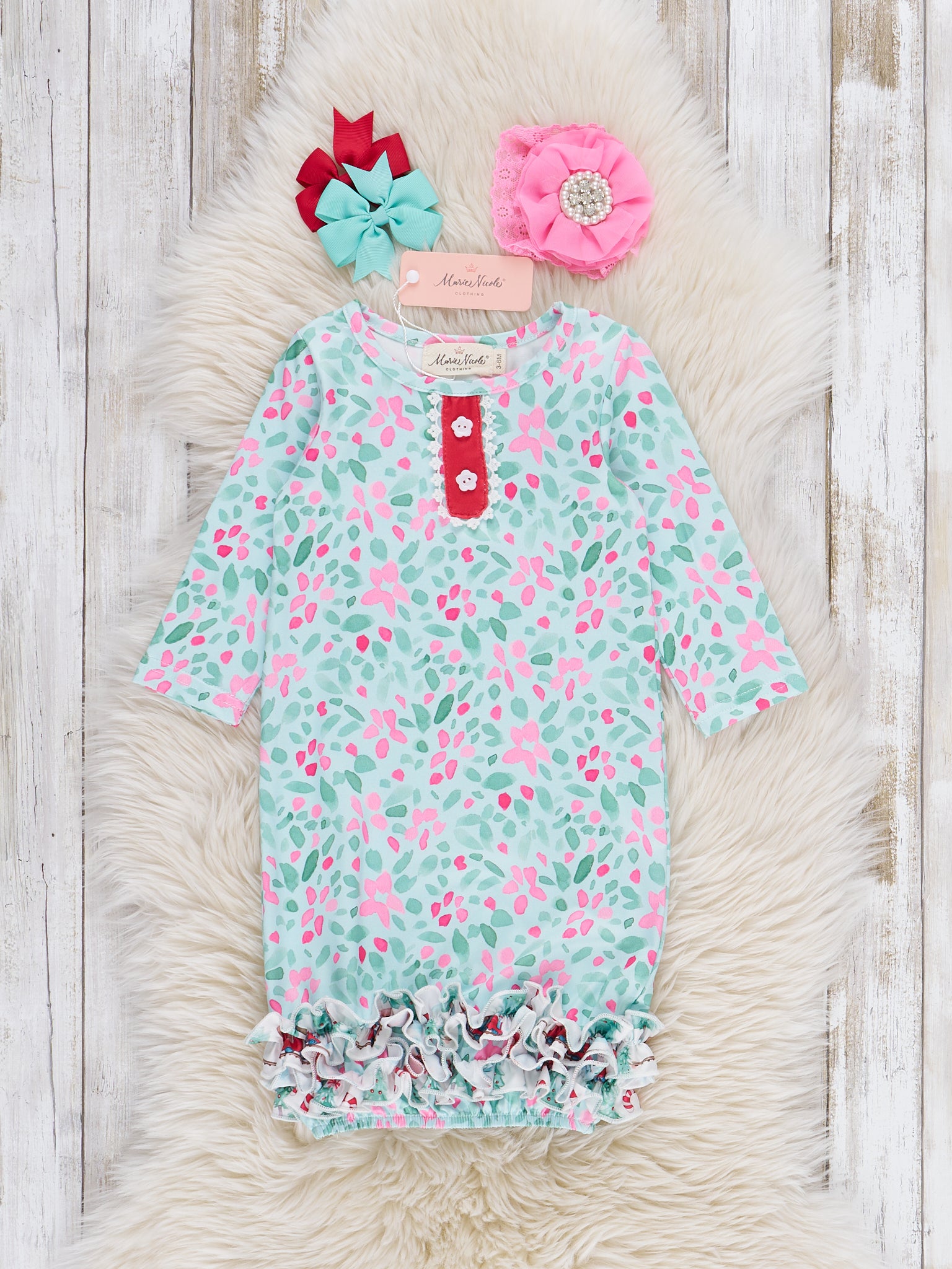 The Winter Wonderland Train Ruffle Gown from Marie Nicole Clothing is designed to keep little ones cozy and stylish, featuring a whimsical berry print and adorable ruffle accents at the bottom, hiding a train and trees print. Made from soft, stretchy fabric for gentle comfort, this gown also offers an easy knot bottom for quick diaper changes, blending practicality with charming style for newborns and infants.
