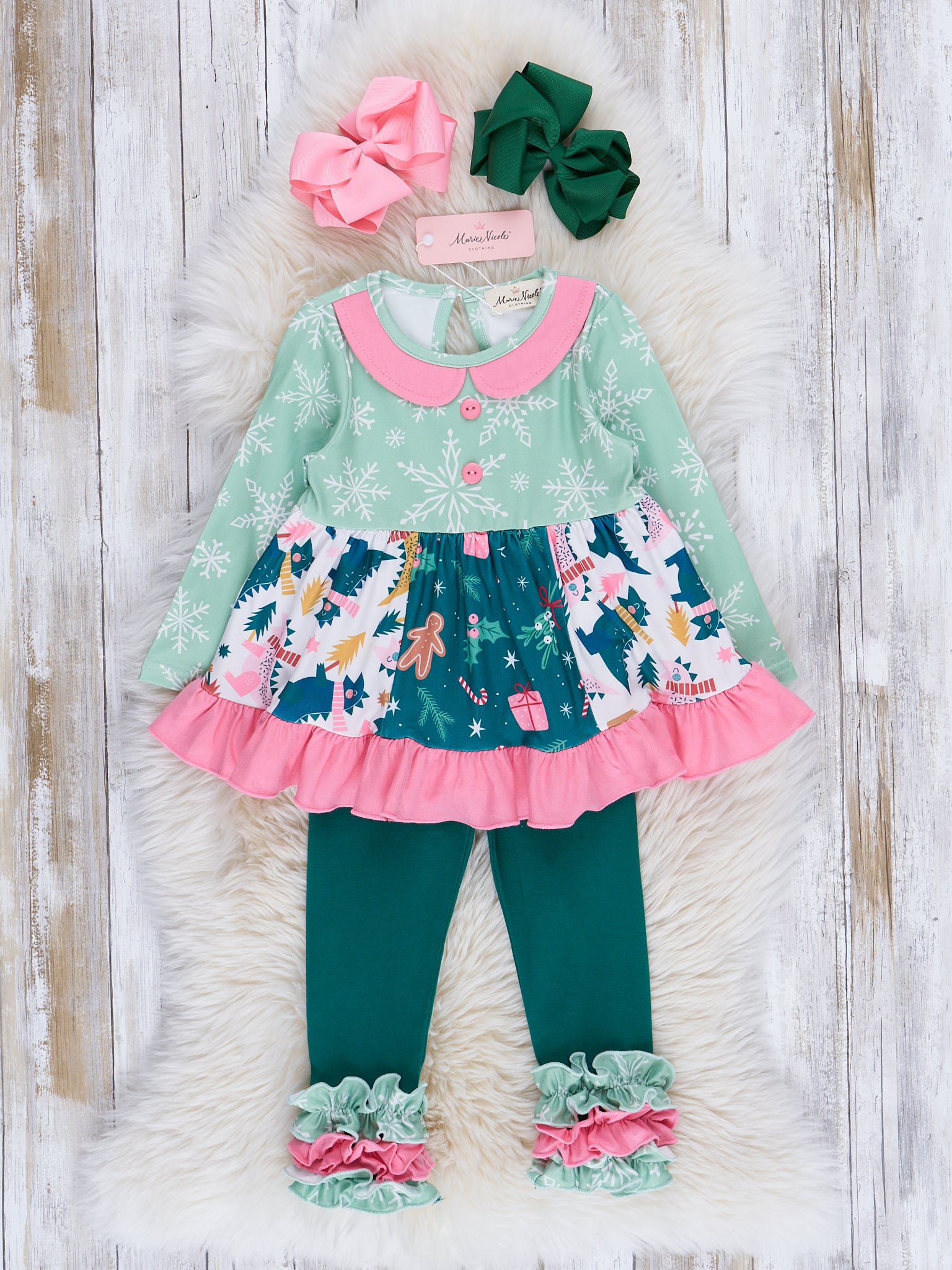 Pink & Green Snowflakes & Dinos Ruffle Outfit