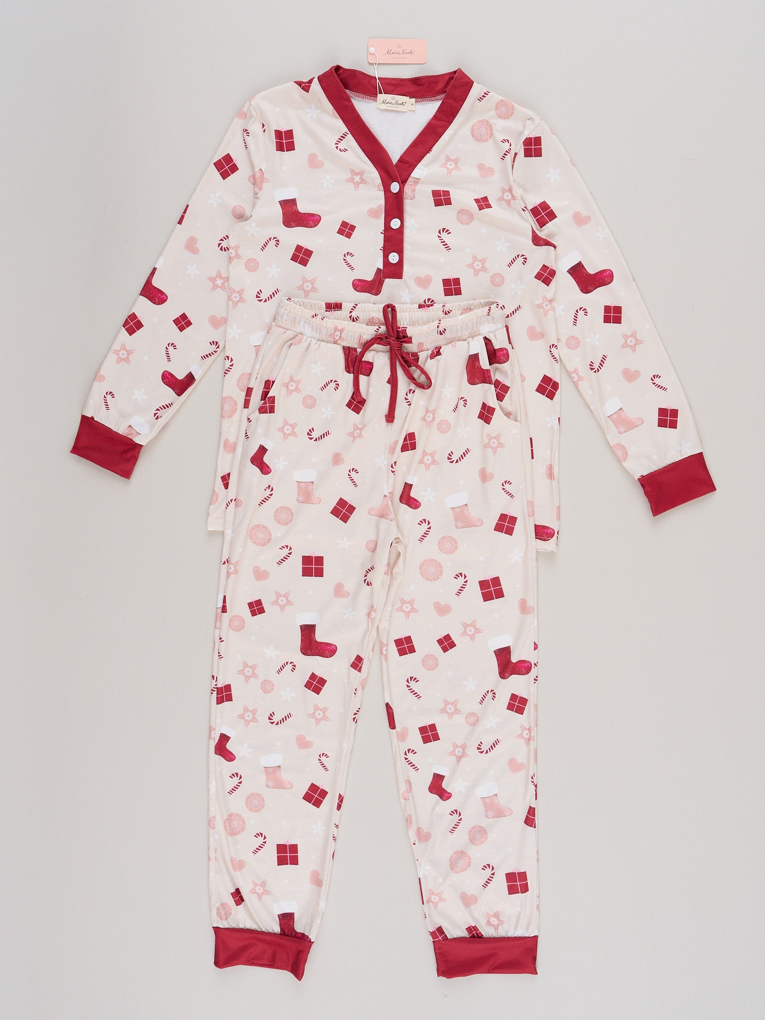 The Mom & Me Merry Magic Pajamas by Marie Nicole set brings a festive touch with a coordinated top and pants, each adorned in a lively pattern of stockings, gifts, and holiday icons. Ribbed cuffs and button accents complete the look, making these pajamas perfect for matching family celebrations.