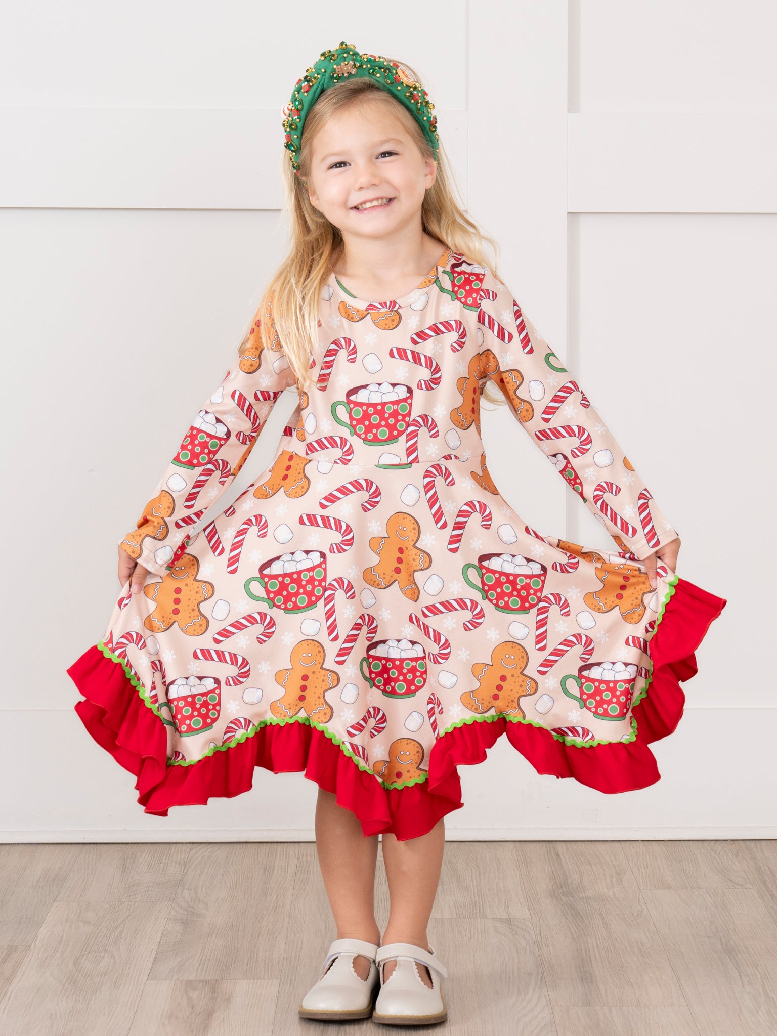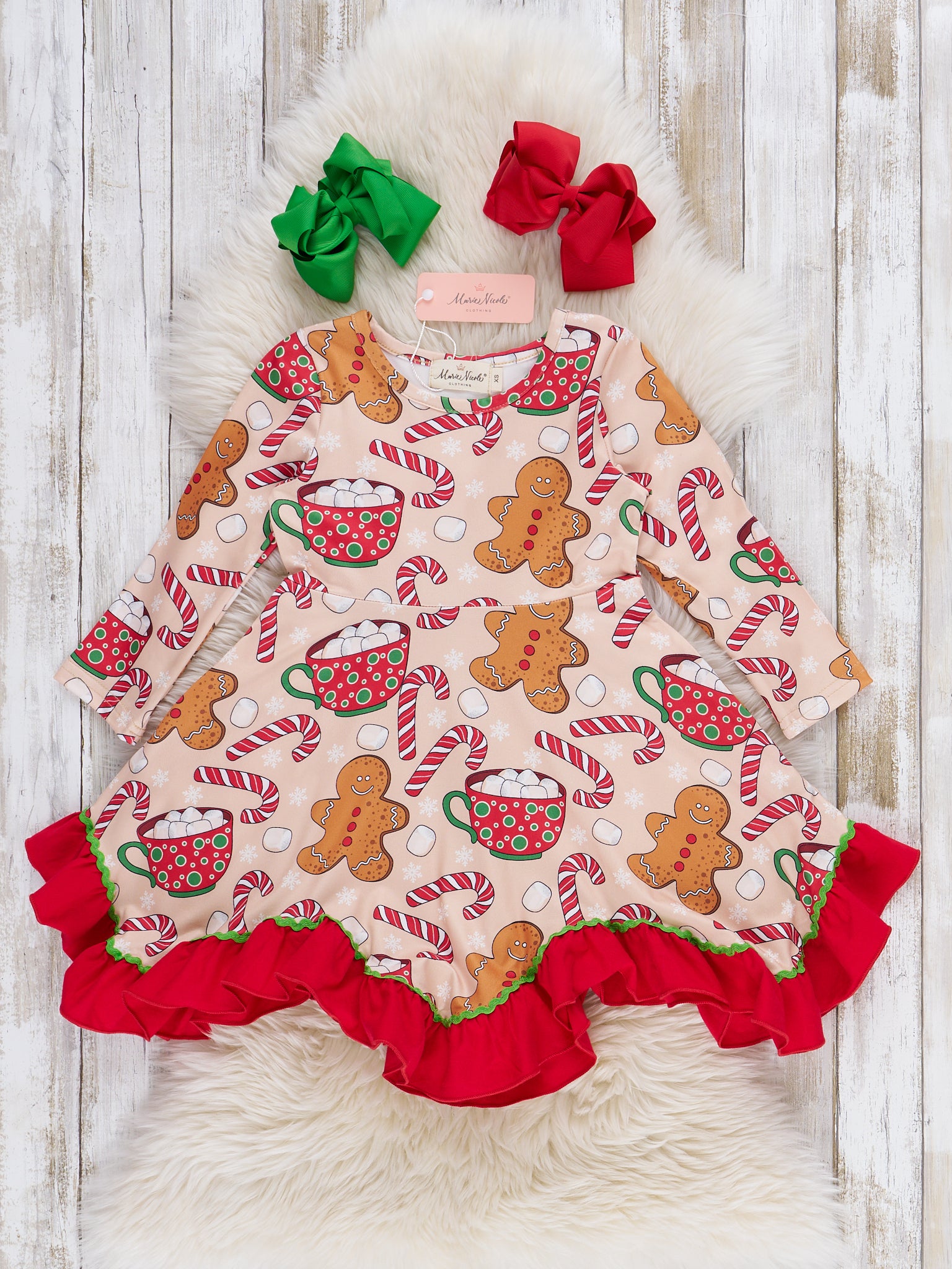 Get your little one ready for the holidays with this adorable Gingerbread & Cocoa Ruffle Dress. Made for stylish girls, this dress features a festive gingerbread cookies and hot cocoa print, accented with a playful ruffle trim. Perfect for spreading cheer and cuteness this Christmas!