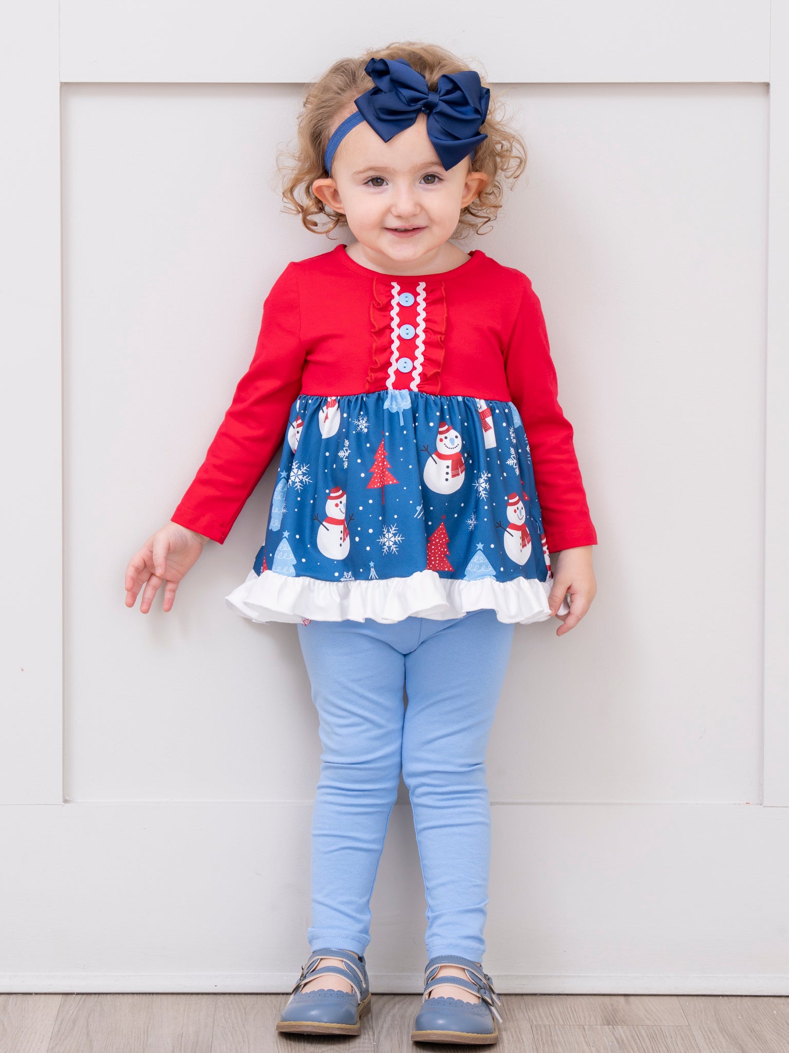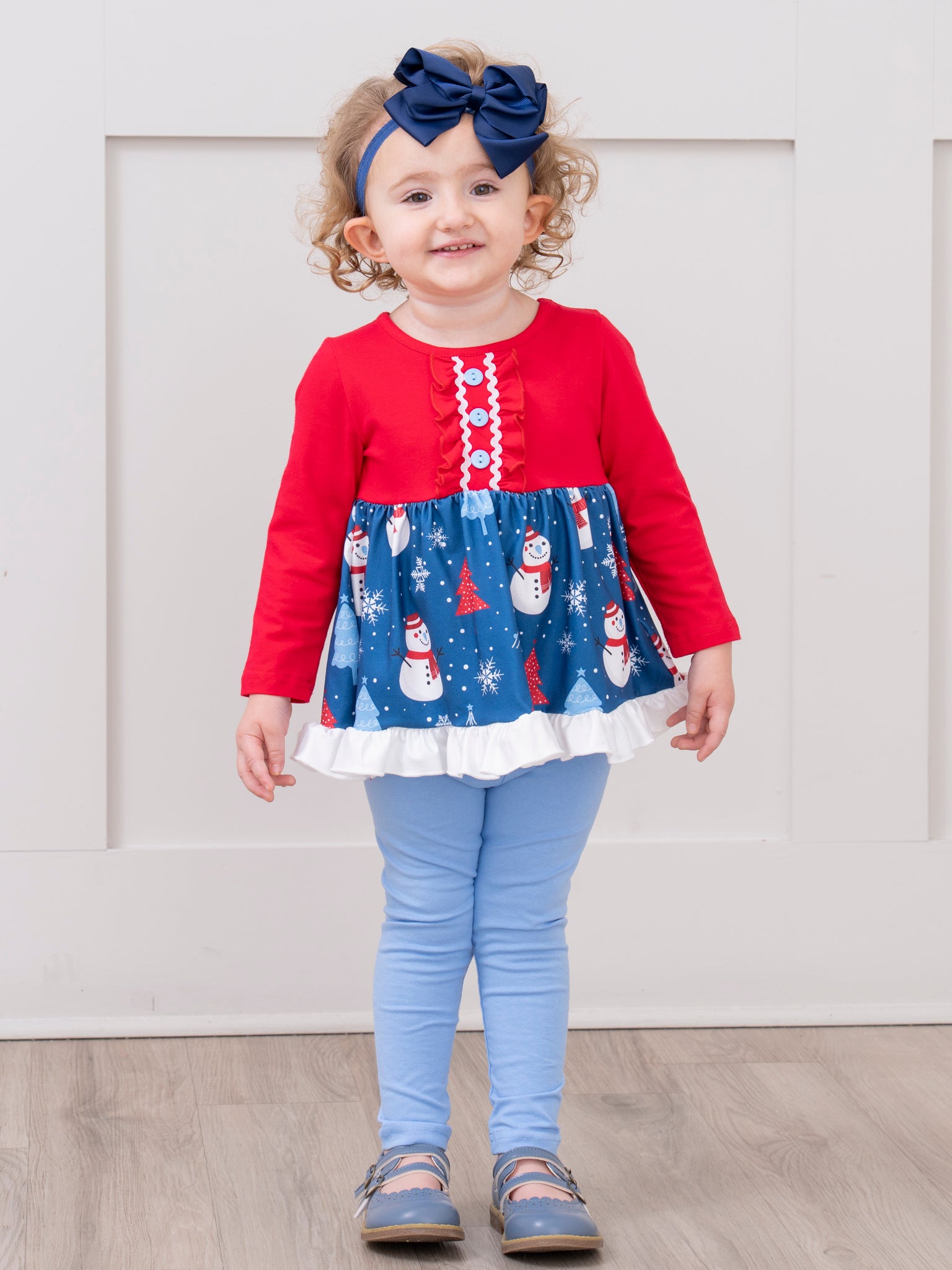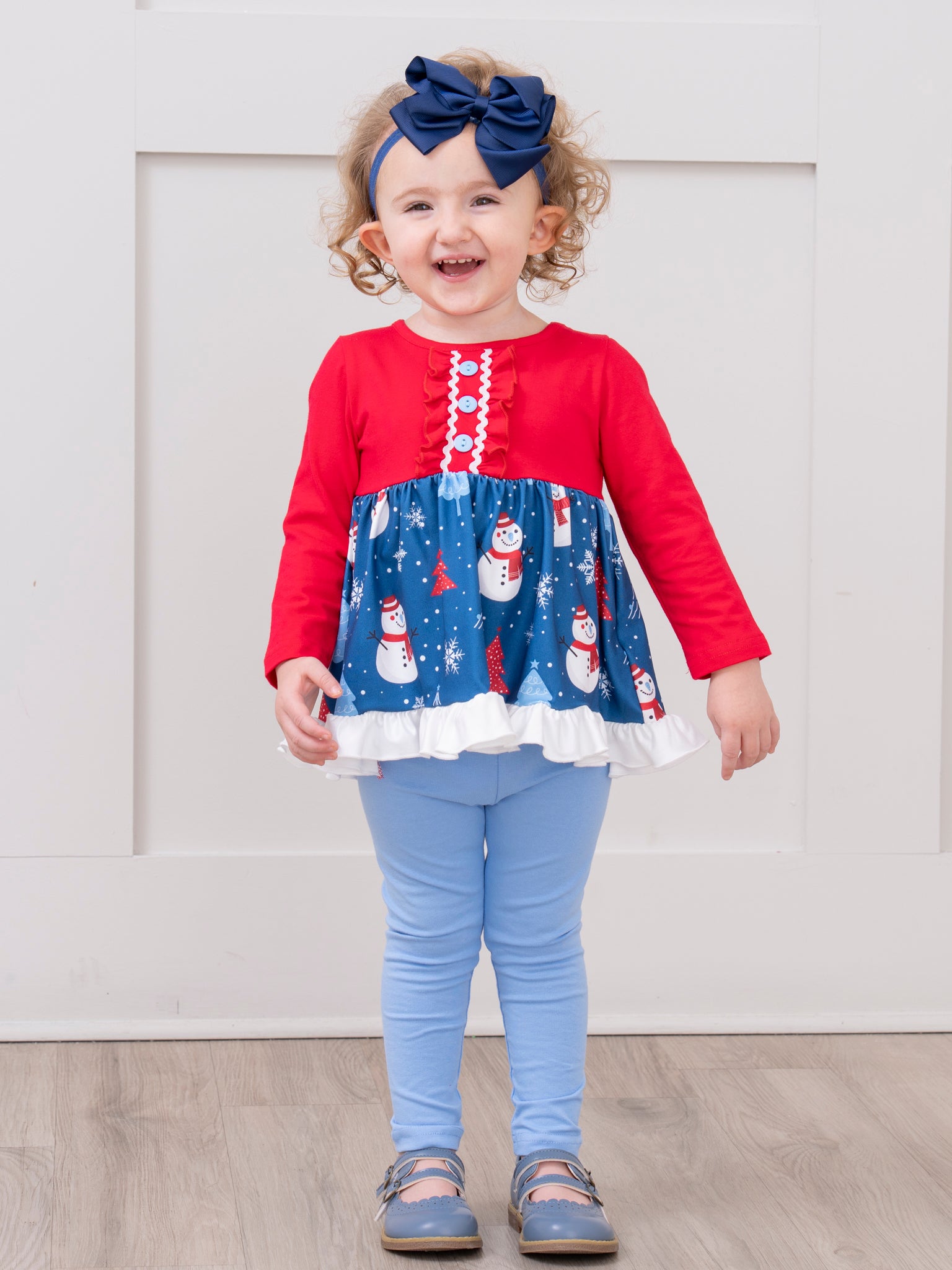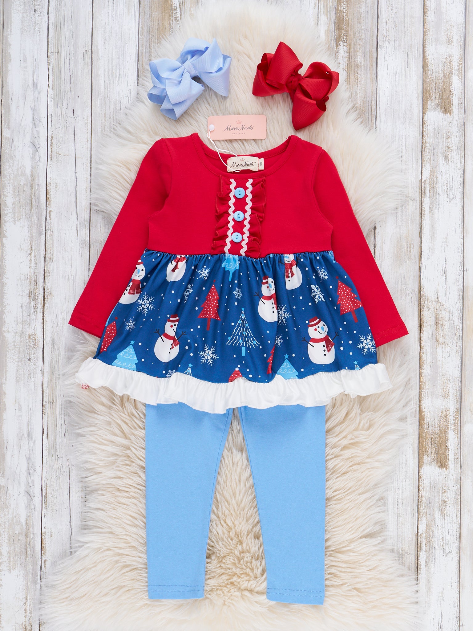 The Merry Little Snowman Ruffle Outfit celebrates wintry fun with a whimsical snowman pattern on the skirt and a playful ruffle-trimmed hem, paired with soft, easy-fitting leggings. Designed by Marie Nicole Clothing, this set ensures comfortable wear and joyful style for holiday outings, family gatherings, and seasonal festivities, making each winter moment feel special.