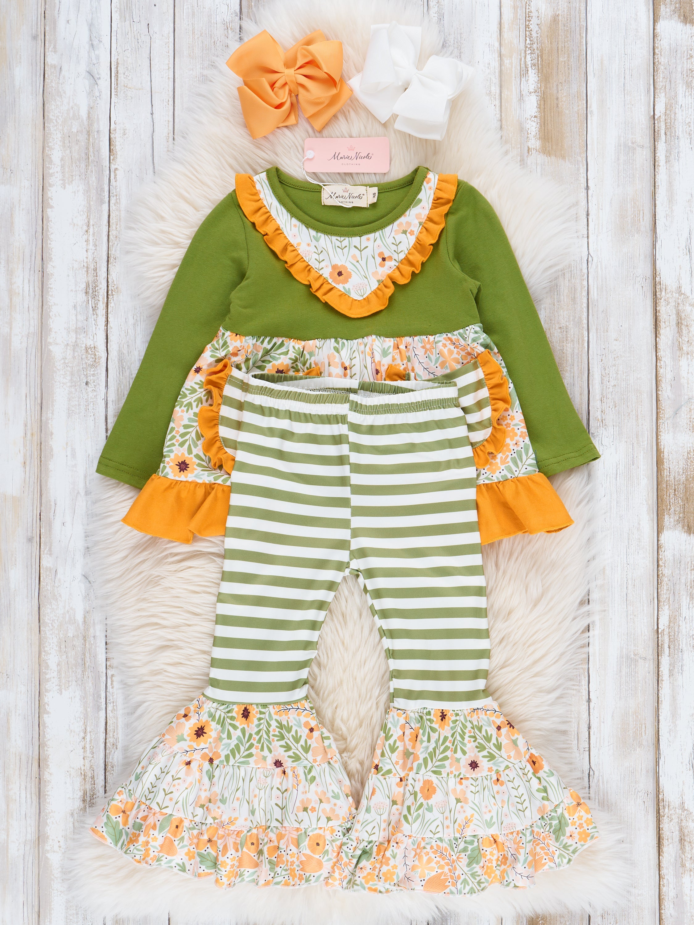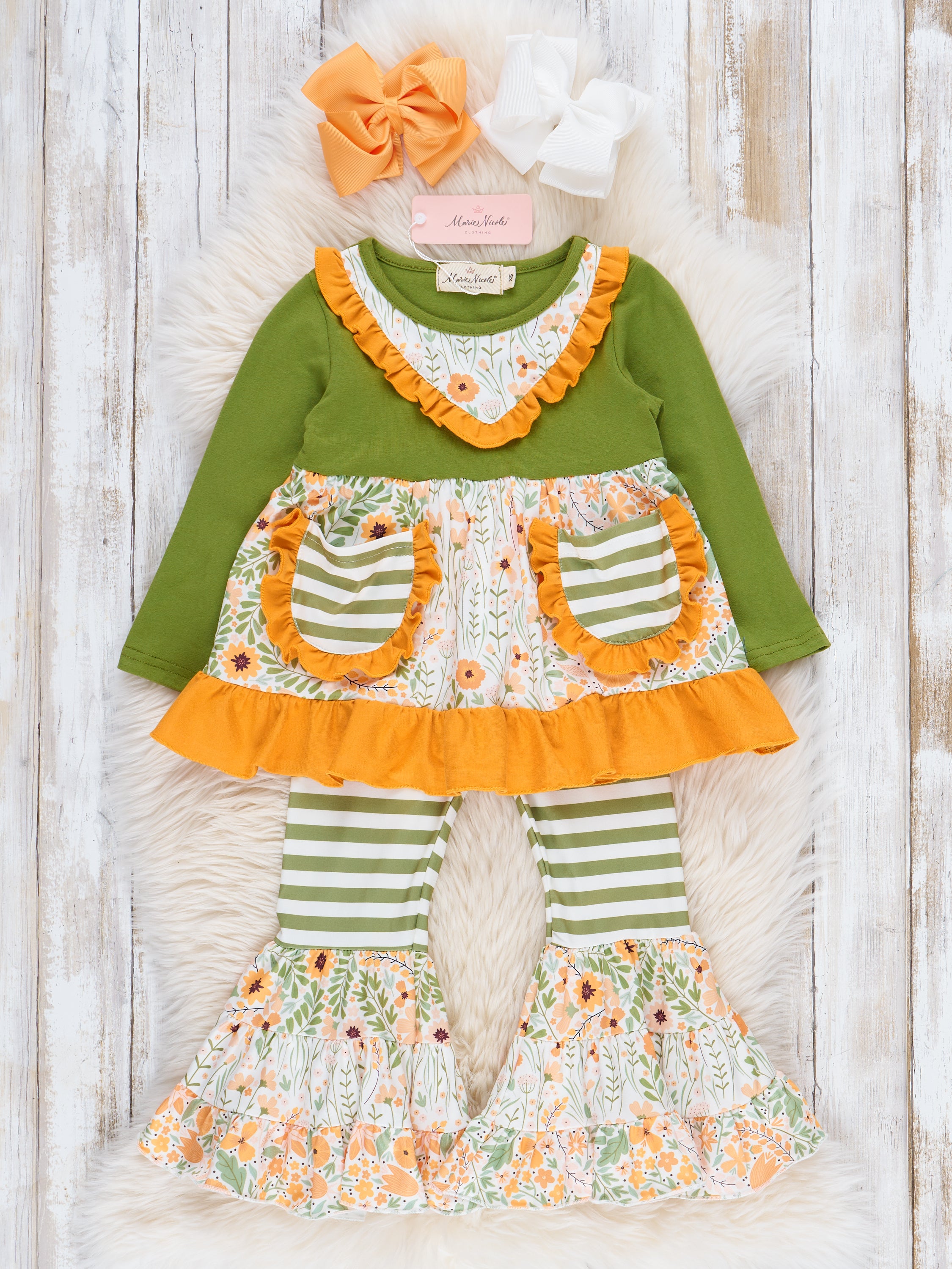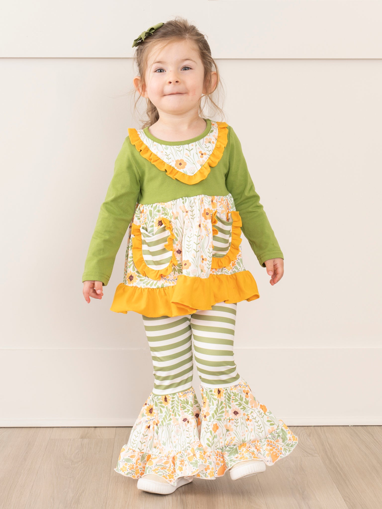 Designed specially for MNC, sister set is a blooming good time! 🌻 Featuring ruffle bell bottoms in mixed stripe and sunflower prints, this Pocket Flara Bells outfit is perfect for the autumn season. Get ready for some fun and playful fashion with this quirky outfit!