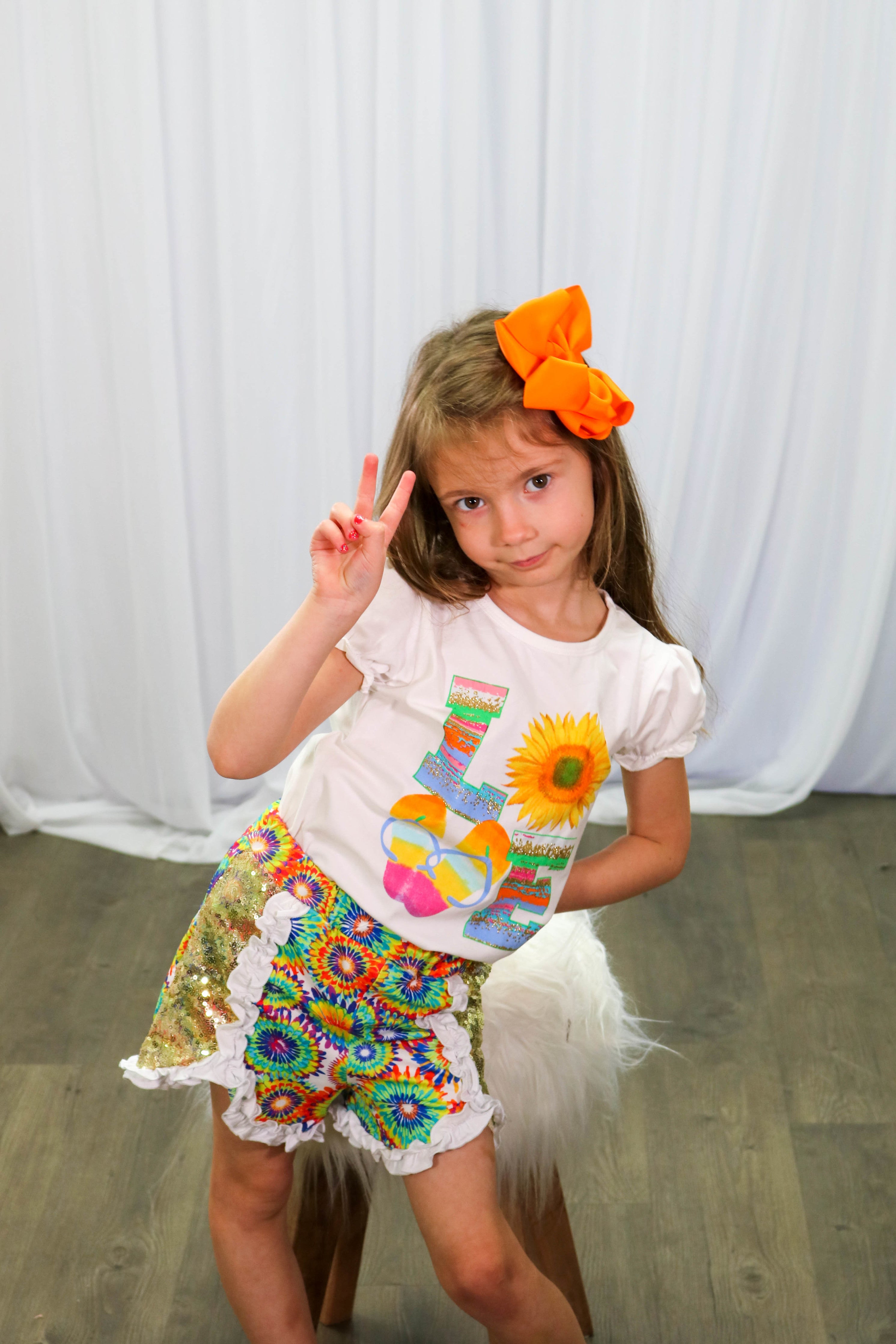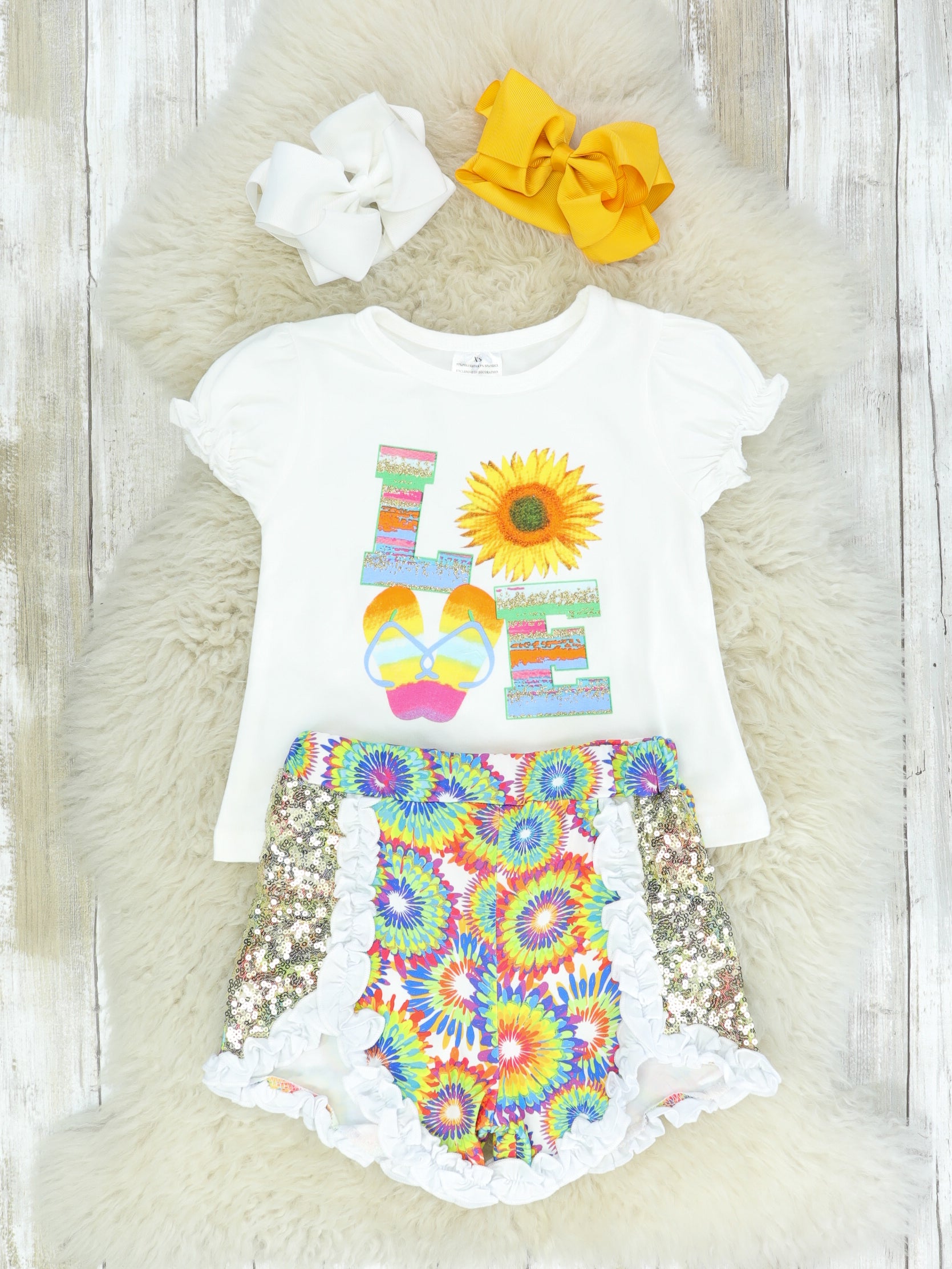 This outfit is taking us back to the 70's with its hip and funky style! It features a white top with a "Love" detail and tie dye detailed shorts with gold sequins and ruffle trim.