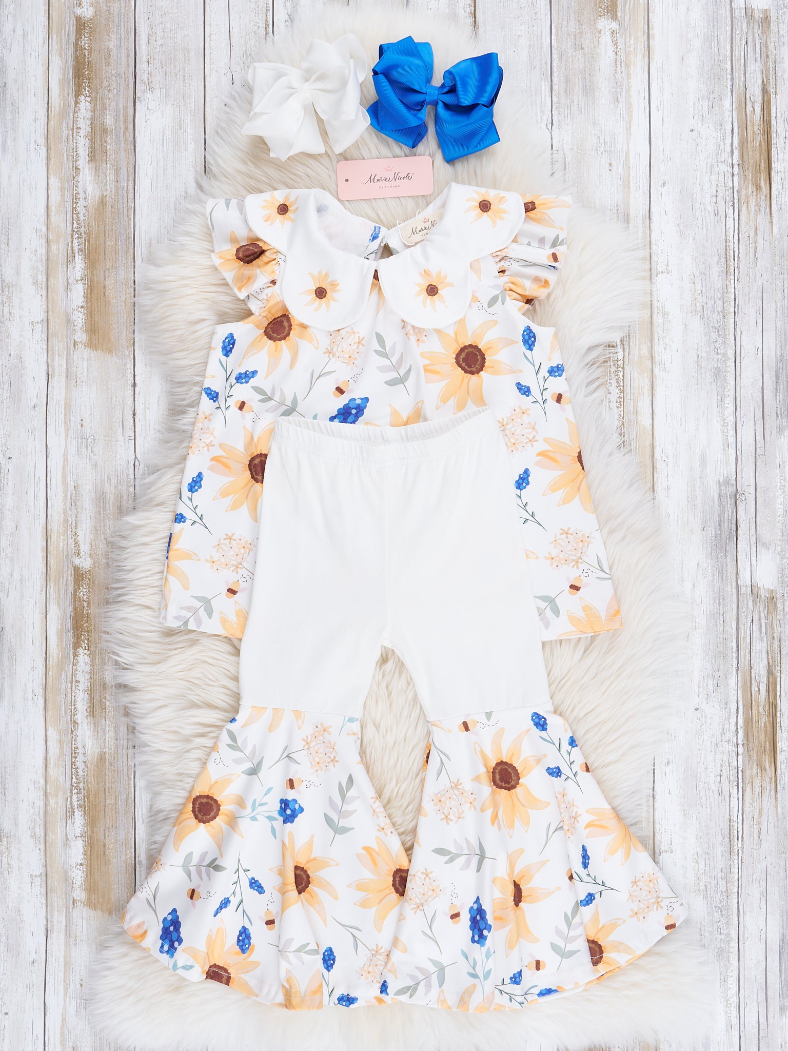 Get ready to blossom in this Sunflower Garden Bell Bottoms Outfit! The petal collar top adds a playful touch while the bell bottoms provide a comfortable fit. Complete with bright and cheery sunflowers, this outfit will have you feeling like a ray of sunshine!