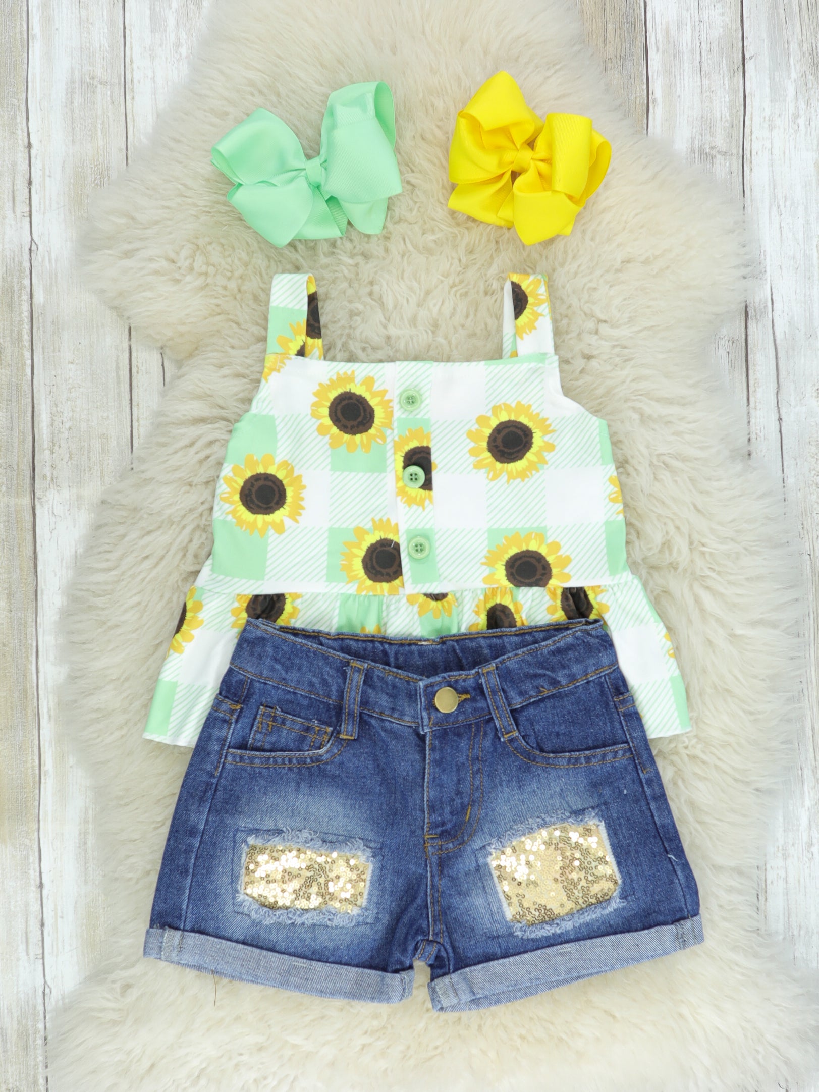 The cutest outfit for your little sunshine! This outfit features a peplum tank with a green and white checked pattern, green buttons lining the middle, and a too cute sunflower pattern; the denim shorts are distressed with gold sequin patches and an adjustable waist.