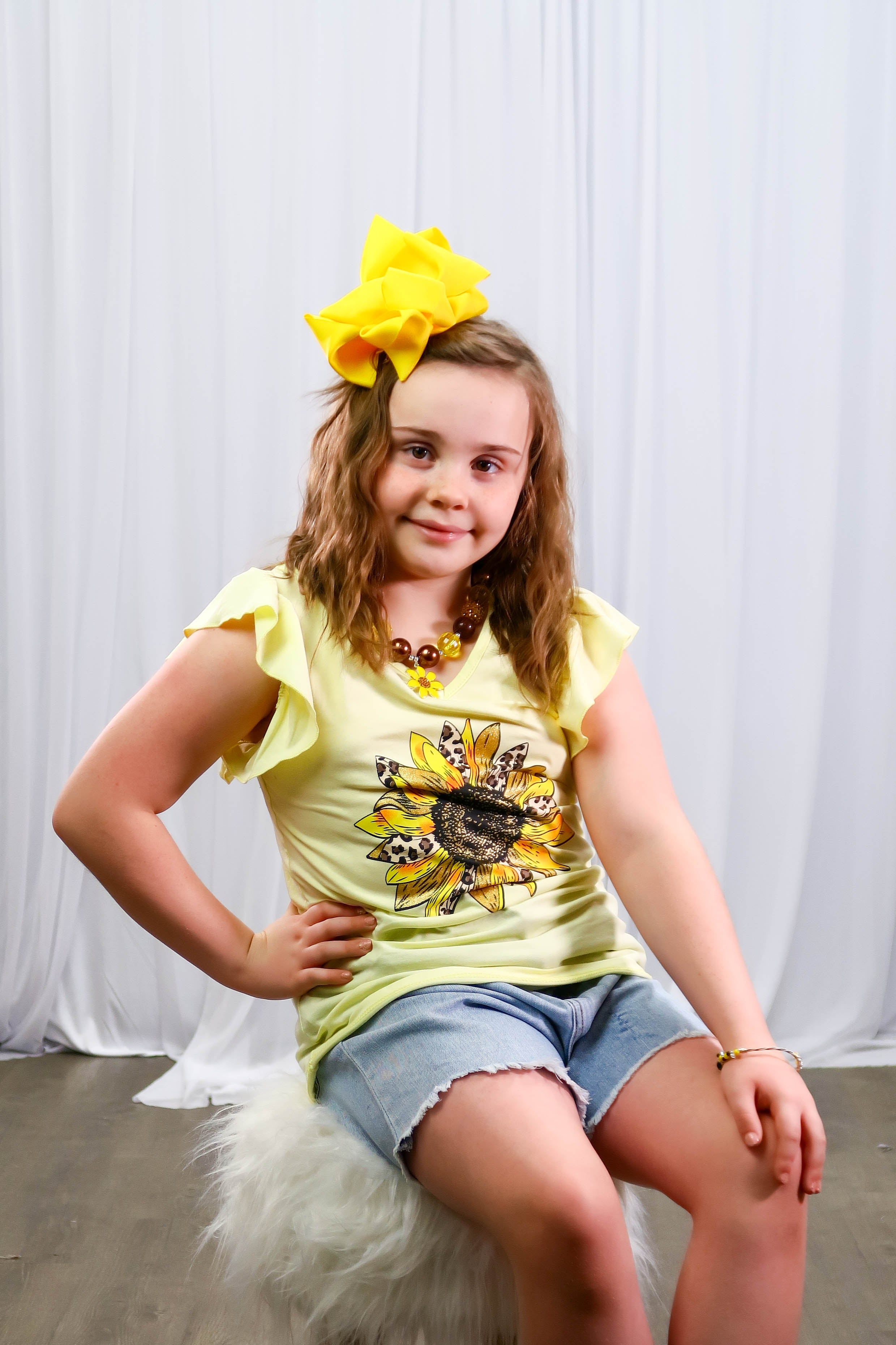 The cutest vintage sunflower outfit! It features a yellow flutter sleeve cold-shouldered top with a leopard sunflower detail and light wash denim shorts with a functional zipper and button and an adjustable waistband.