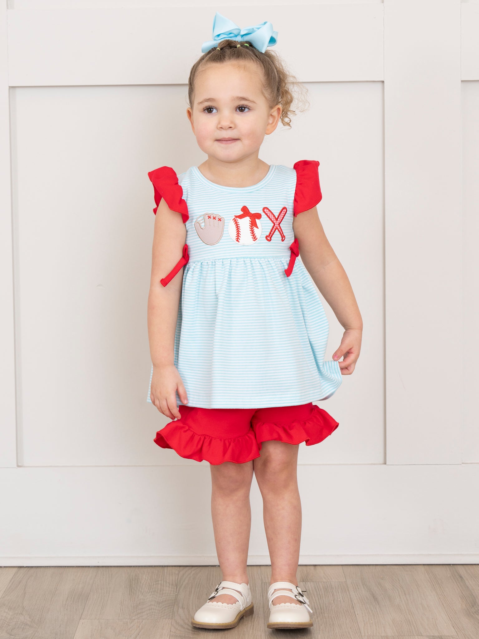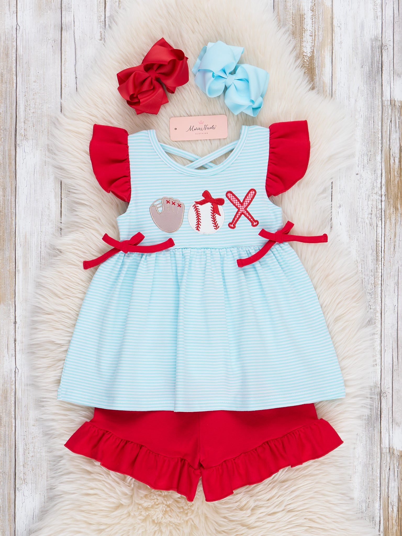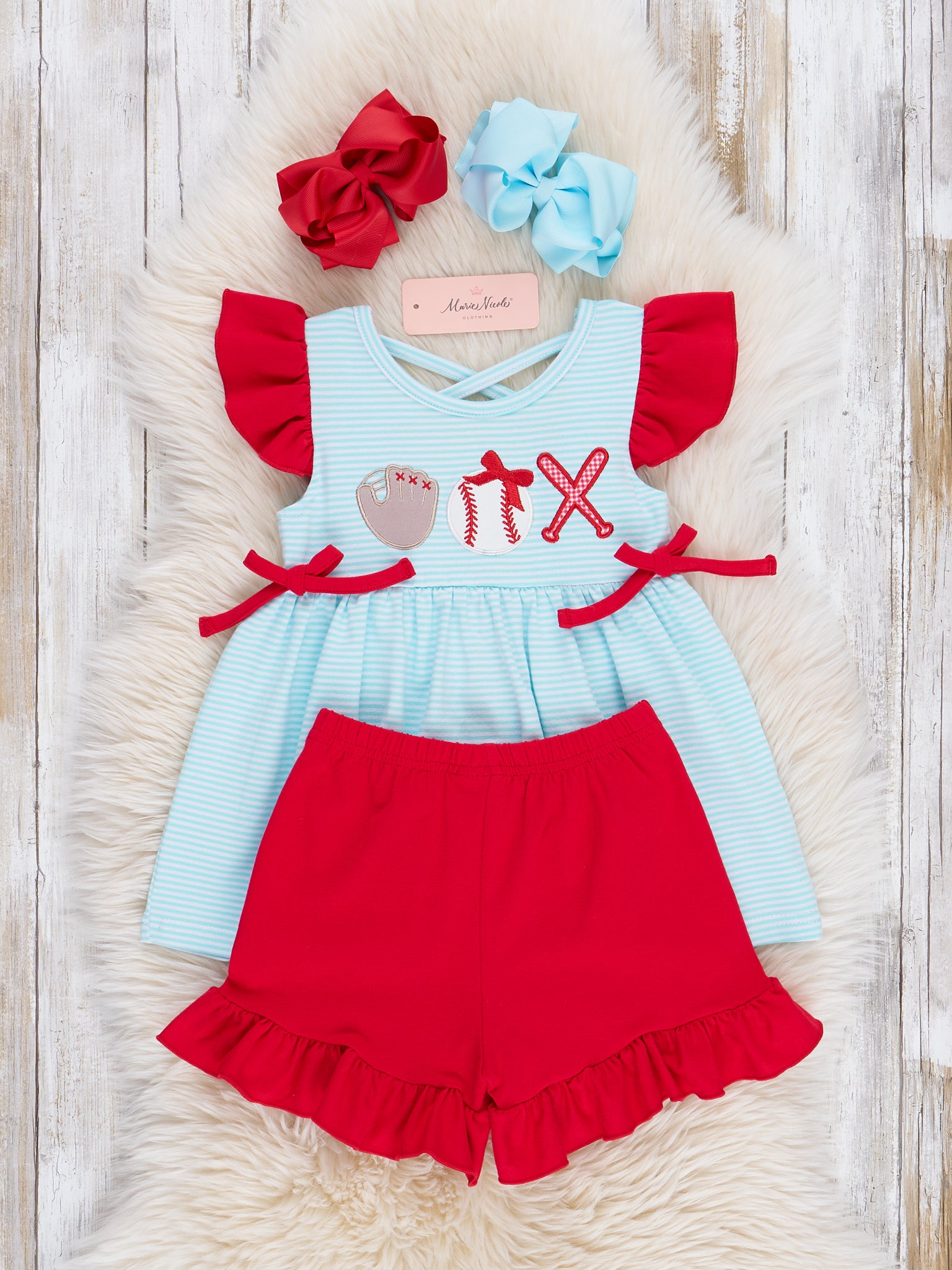 Score a home run with this Batter Up Embroidered Ruffle Outfit! This girls ruffle short set from Marie Nicole Clothing will have your little one looking cute while staying cool in the light blue top with red ruffles and bows detail. The embroidered baseball motif and red ruffle hem shorts add an extra playful touch. Perfect for a sibling set!