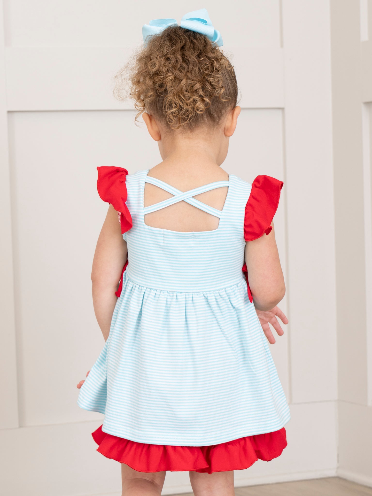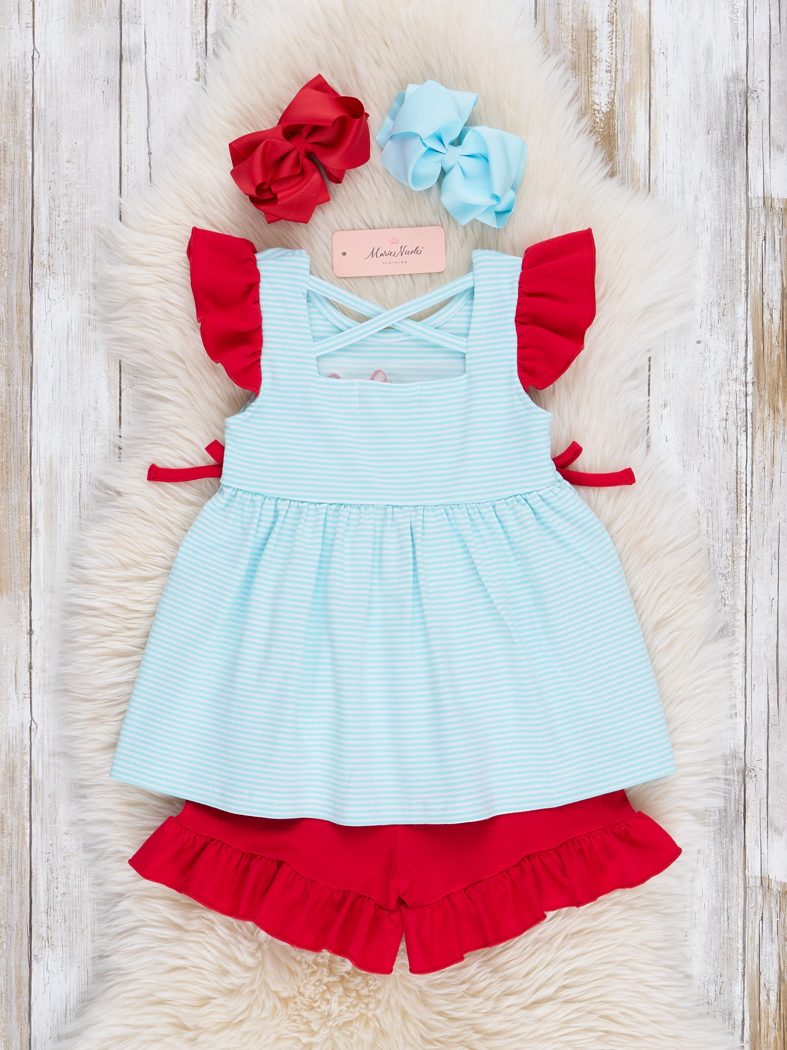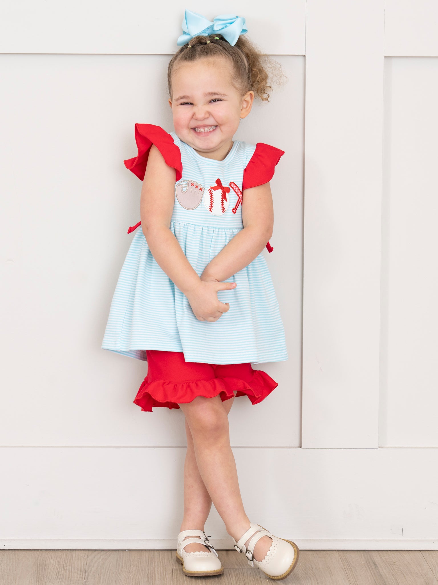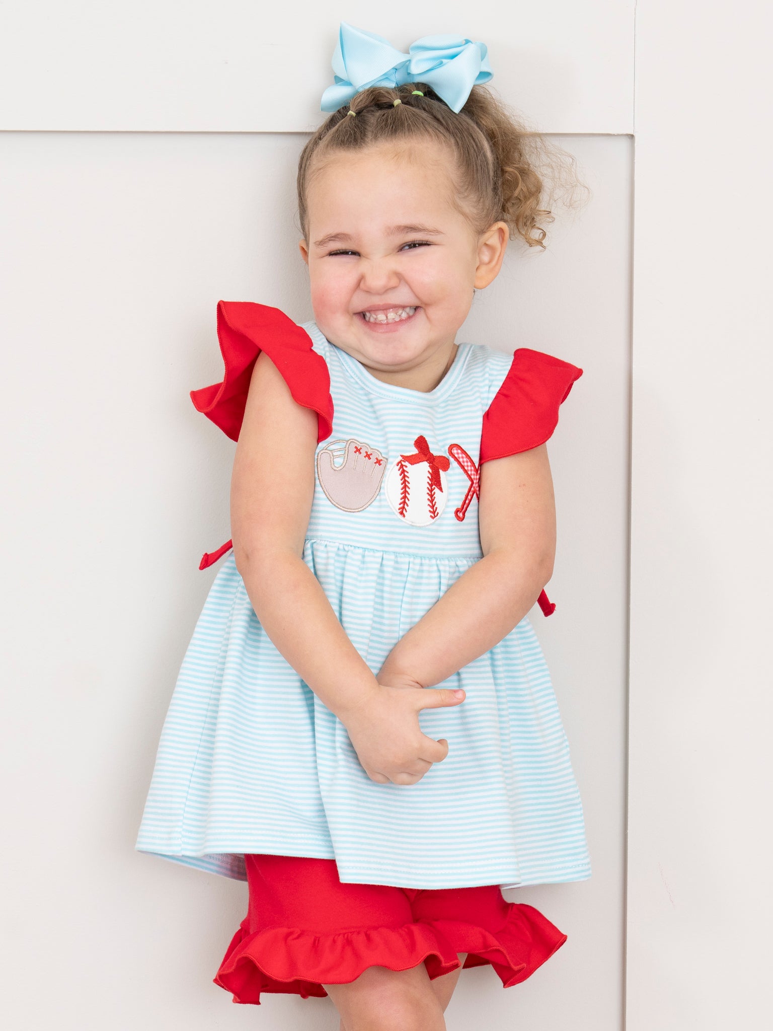 Score a home run with this Batter Up Embroidered Ruffle Outfit! This girls ruffle short set from Marie Nicole Clothing will have your little one looking cute while staying cool in the light blue top with red ruffles and bows detail. The embroidered baseball motif and red ruffle hem shorts add an extra playful touch. Perfect for a sibling set!