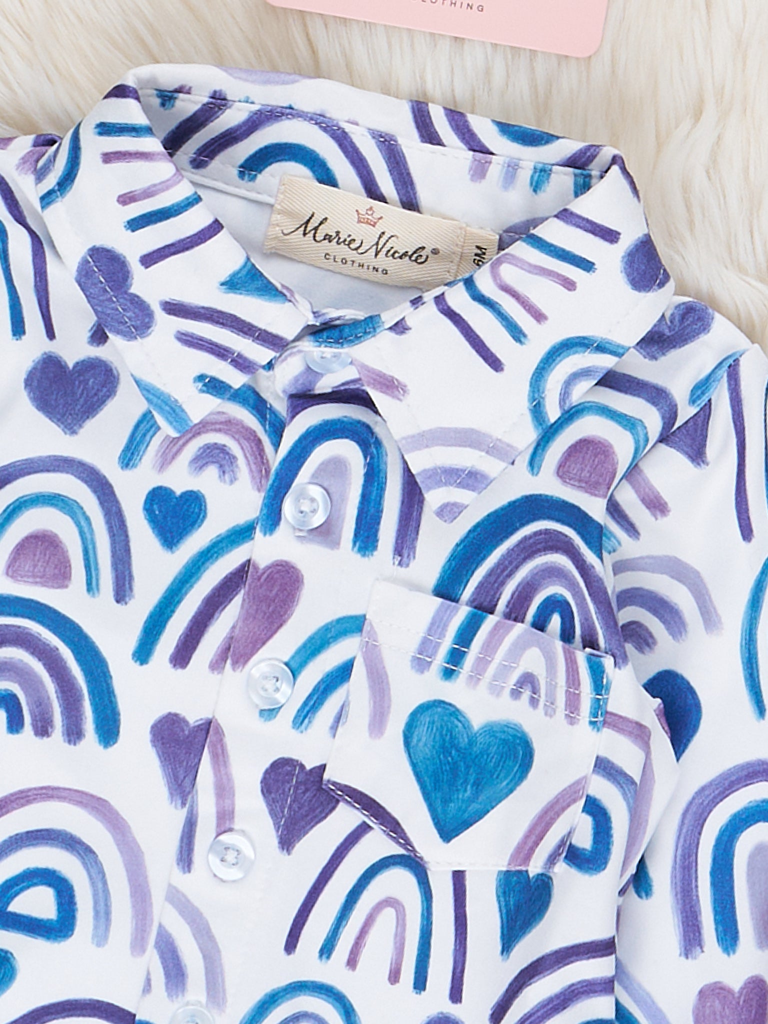 Let your little one stand out in this vibrant Blue Hearts & Rainbows Button-Up by Marie Nicole Clothing! With bold blues and purples and cheerful heart and rainbow designs, this boy's shirt is sure to make any occasion special! Brother-set or solo, your little one will be the star of the show!