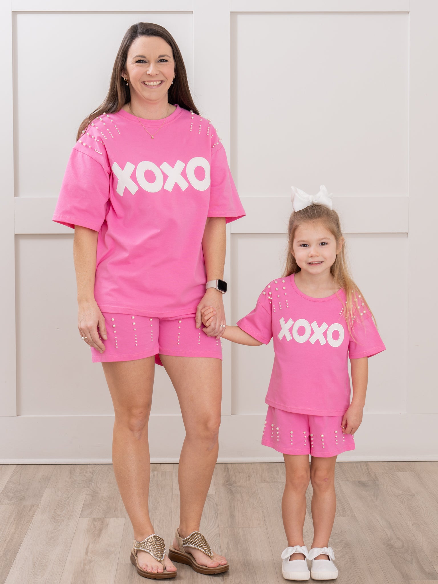The Mom & Me XOXO Pearl Embroidered Outfit by Marie Nicole Clothing is a comfy set for mom, featuring a playful "XOXO" embroidery across the top with beautiful pearl accents across the shoulders. Designed for shared moments and coordinated style, this set is perfect for matching with your little one.