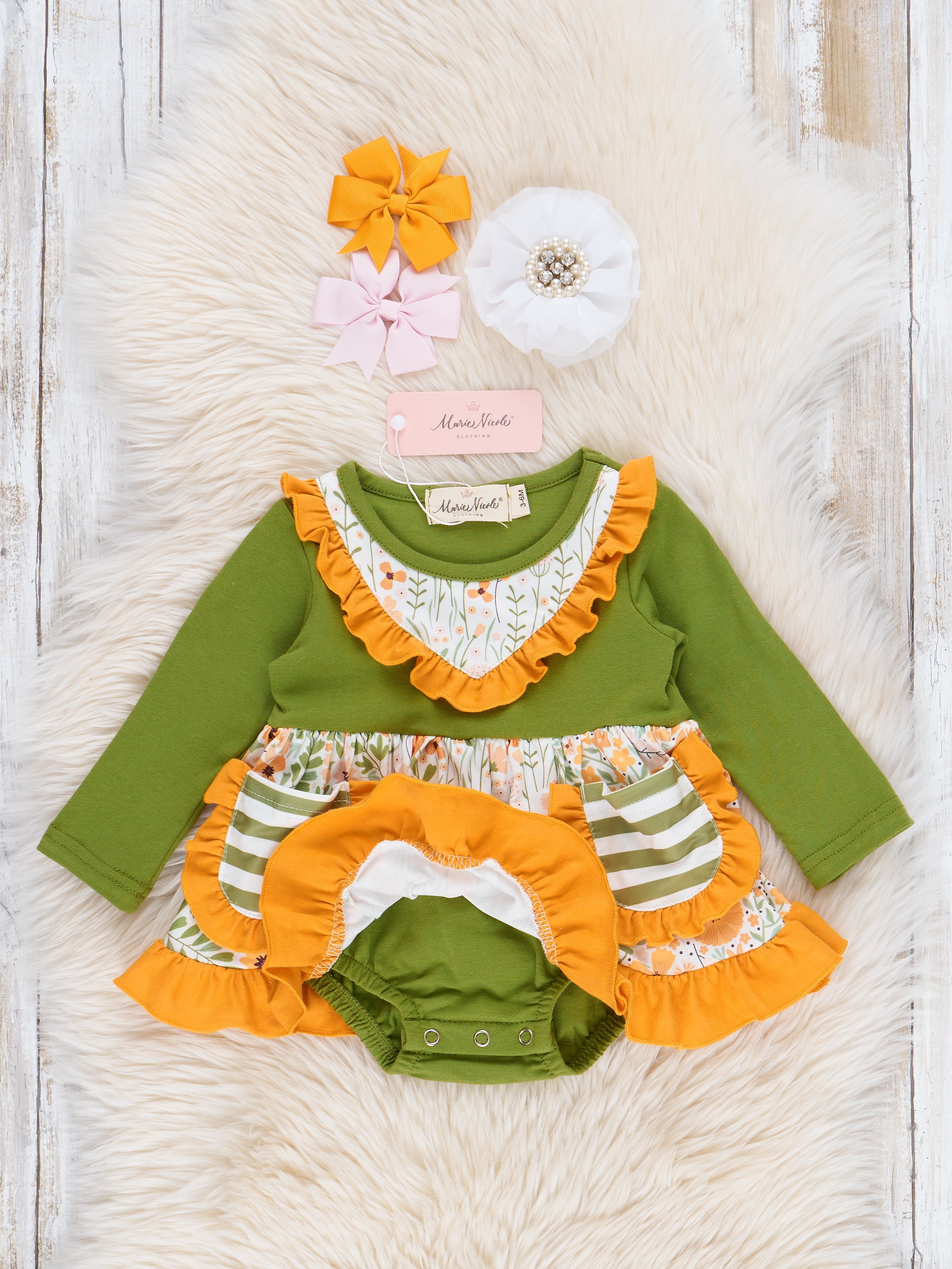 Designed specially for MNC, this sister set is a blooming good time! 🌻 Featuring ruffle trim & mixed stripe and sunflower prints, this bubble is perfect for the autumn season. Get ready for some fun and playful fashion with this quirky outfit!