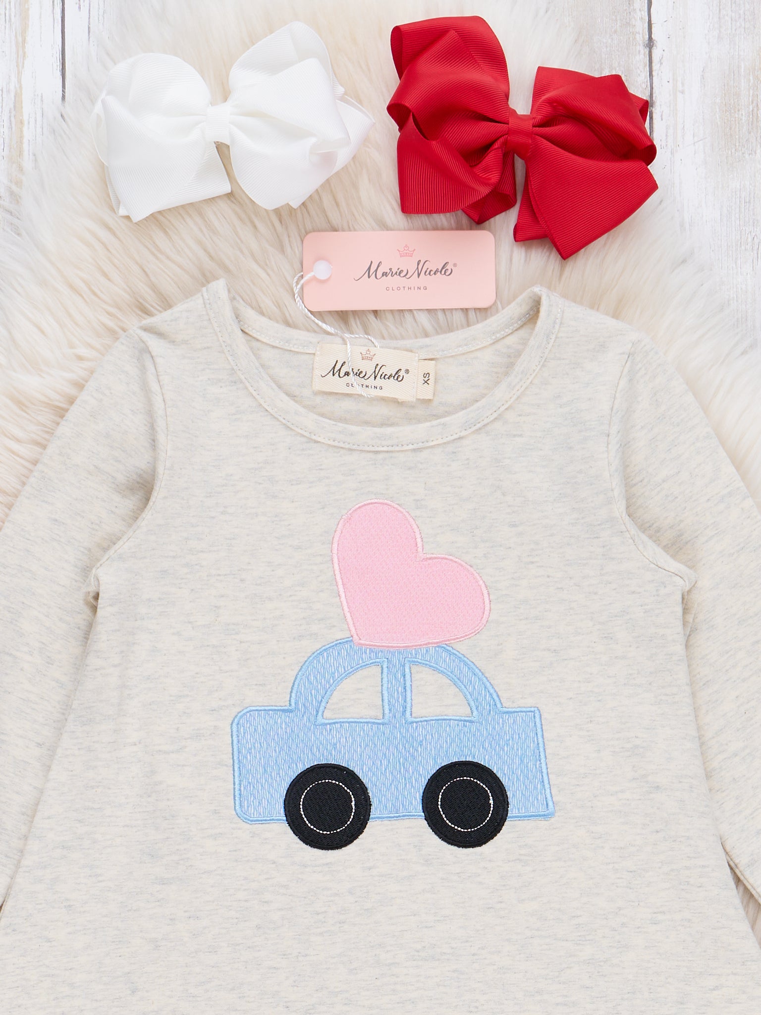 Feel the love with this playful Red Heart Car sibling set! Perfect for Valentine's Day, this girls romper features a yellow striped bodice with an embroidered car and fun vibrant red ruffle leggings. Make a statement and show some  Valentine's Day love with this stylish and unique romper by Marie Nicole Clothing!