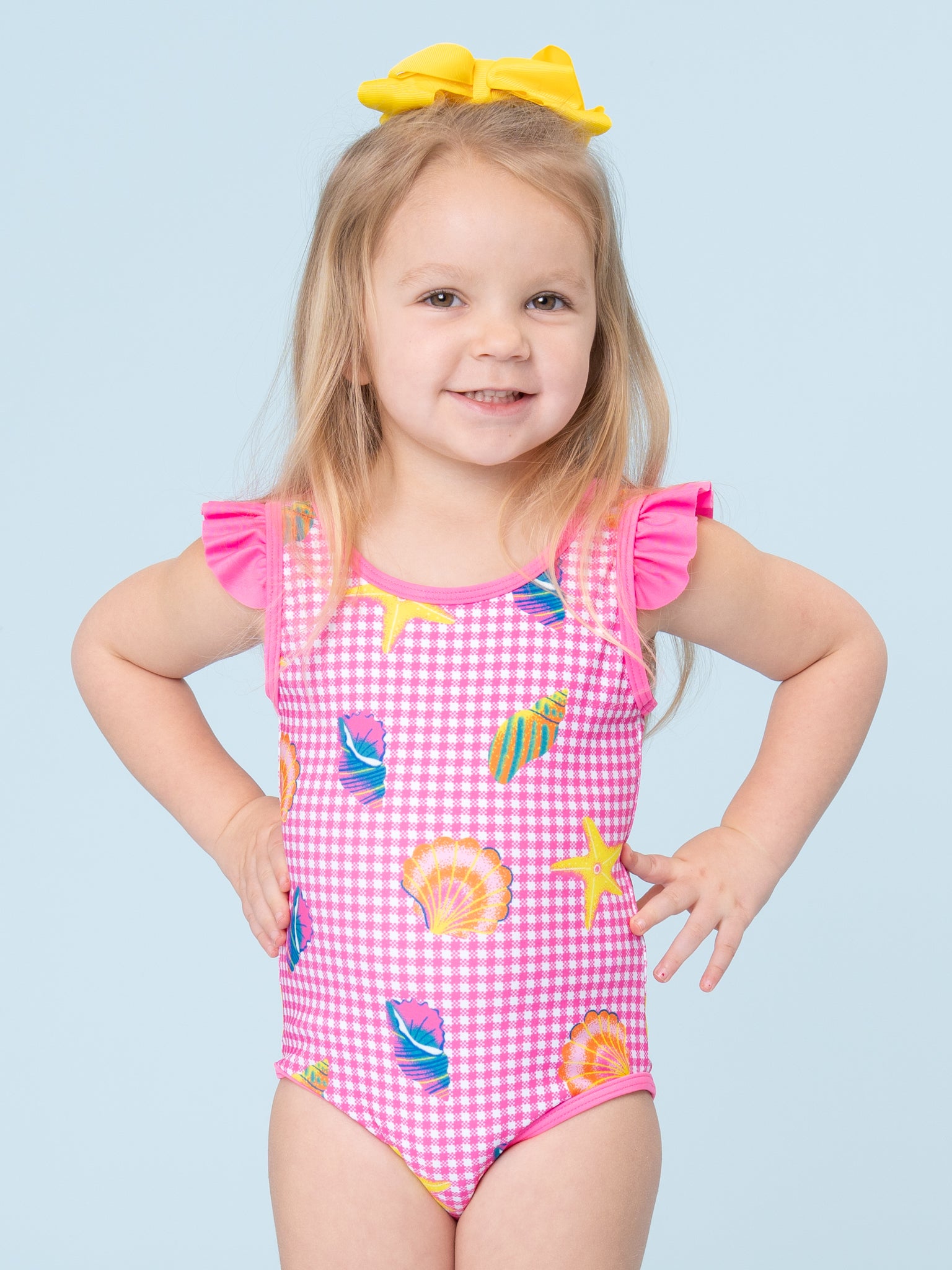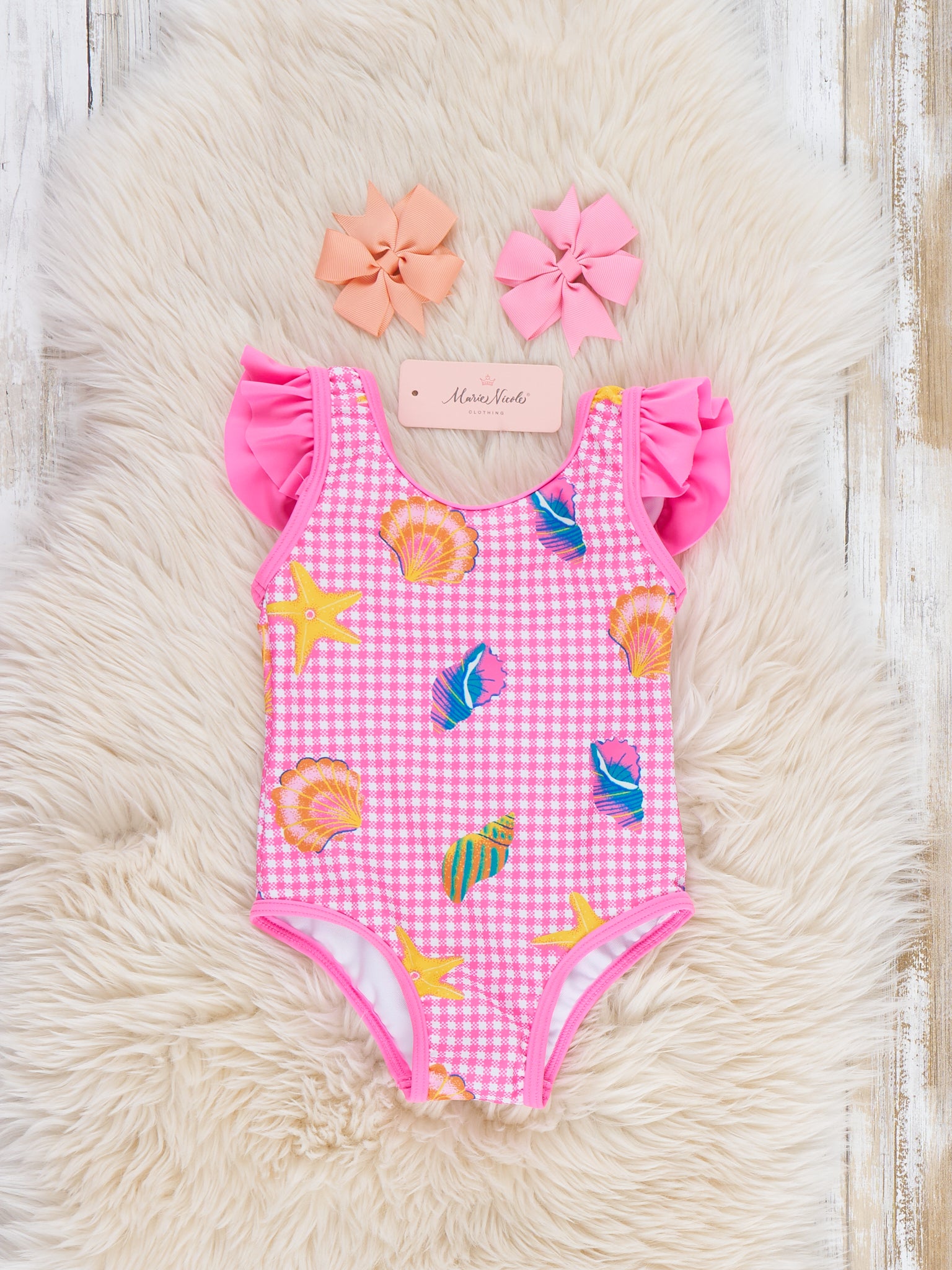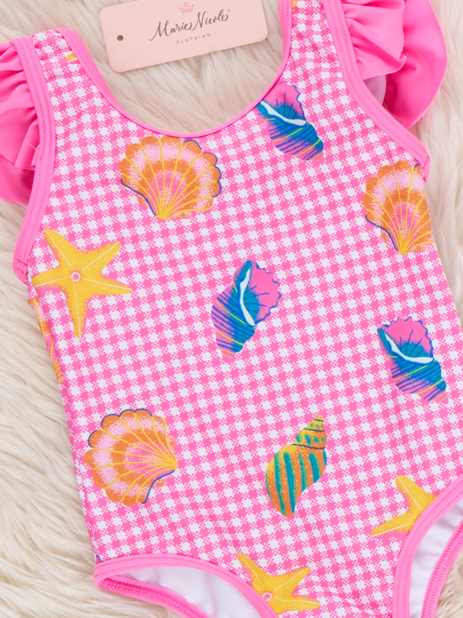 The Beach Treasures Gingham Ruffle Swimsuit by Marie Nicole Clothing combines gingham fabric with printed seashells, watermelon slices, and stars, accented by ruffled tank straps for beach-ready style. Secure fit and stretchy, water-made convenience. Perfect for pool days or seaside adventures.
