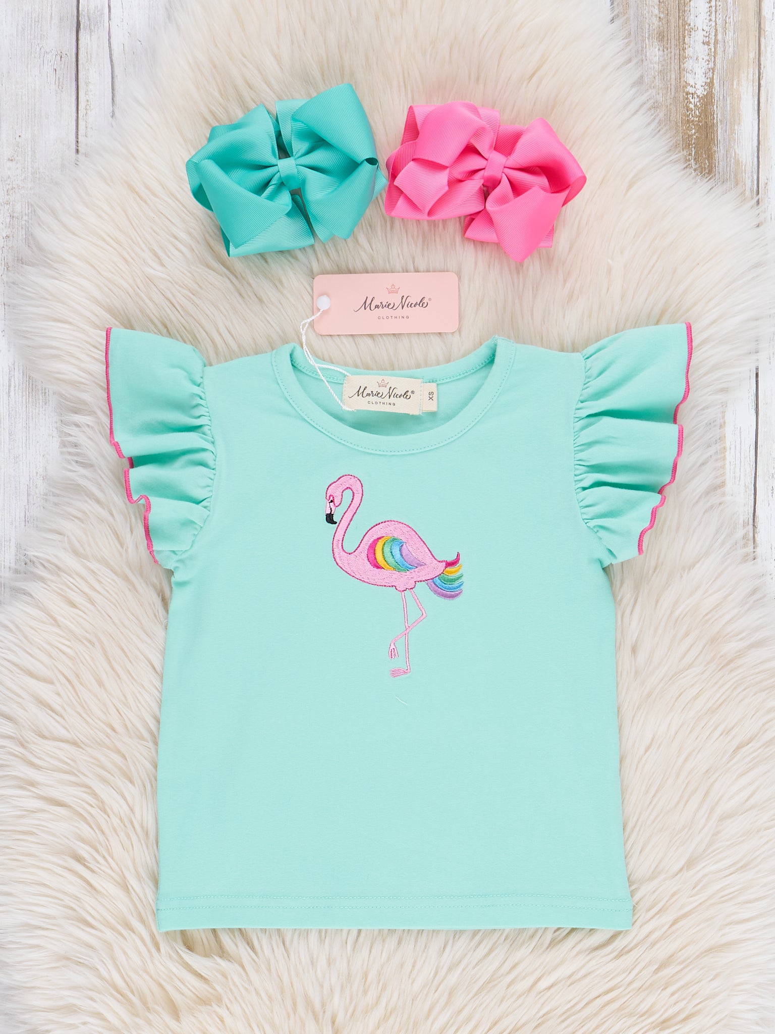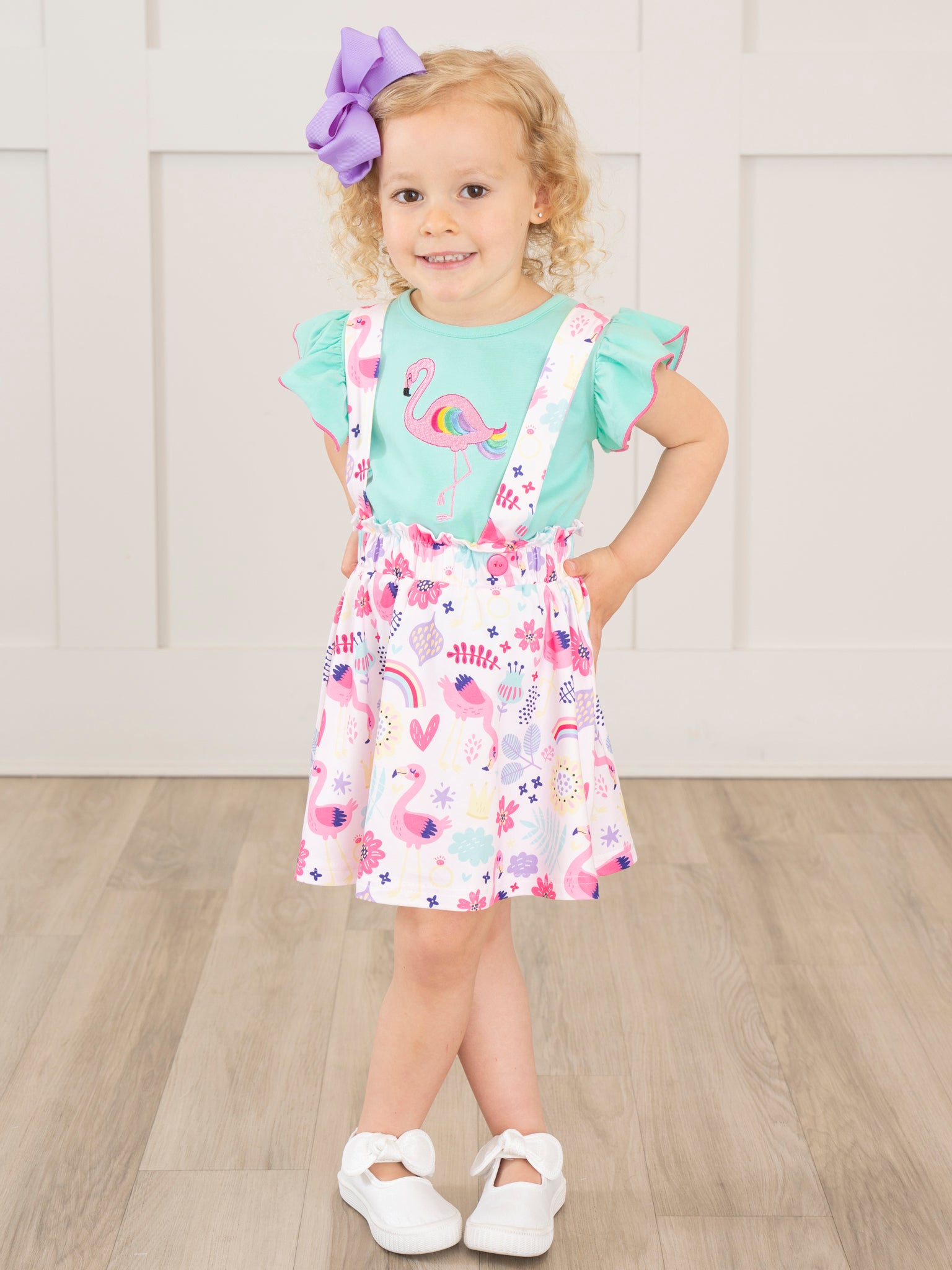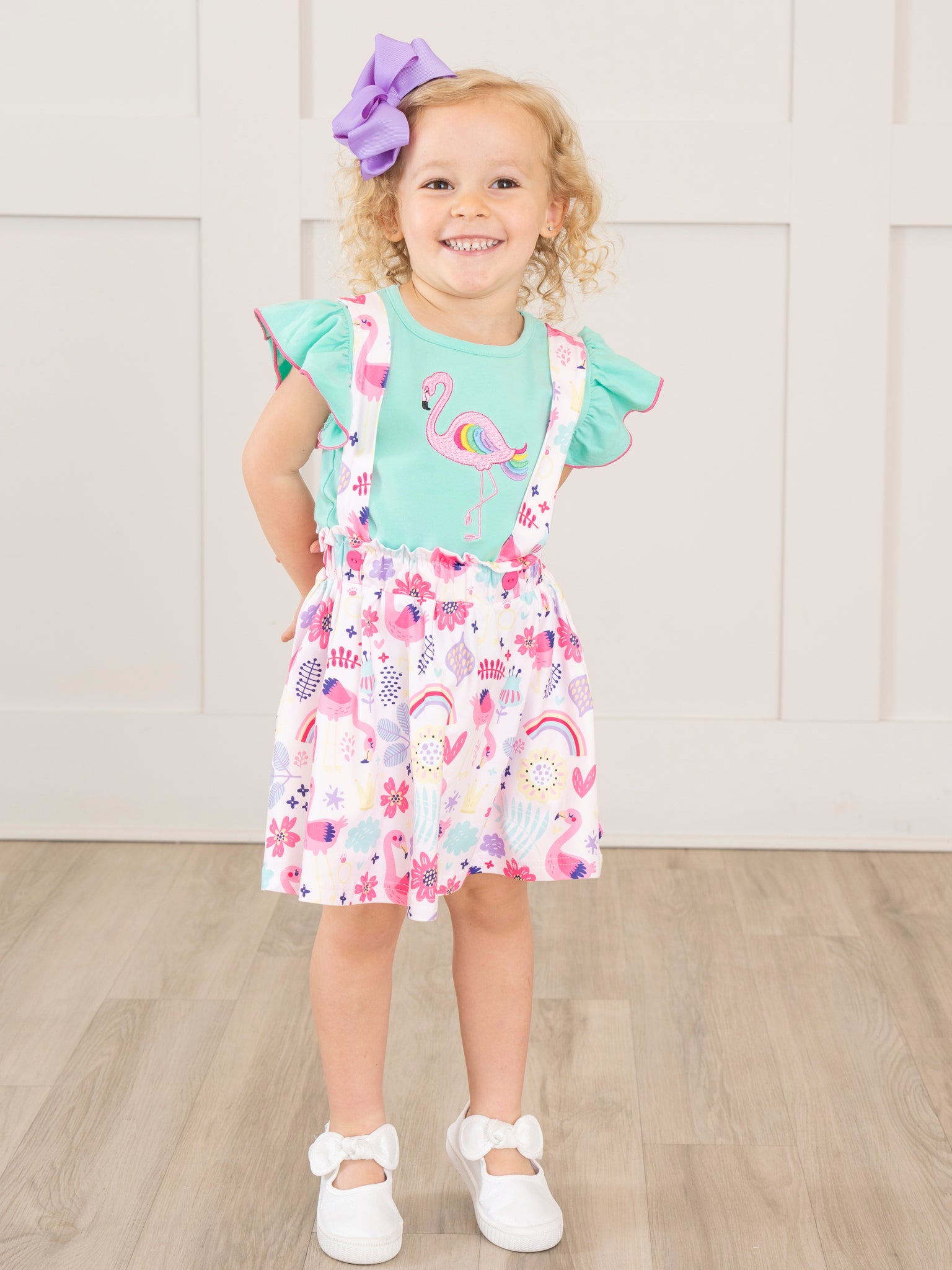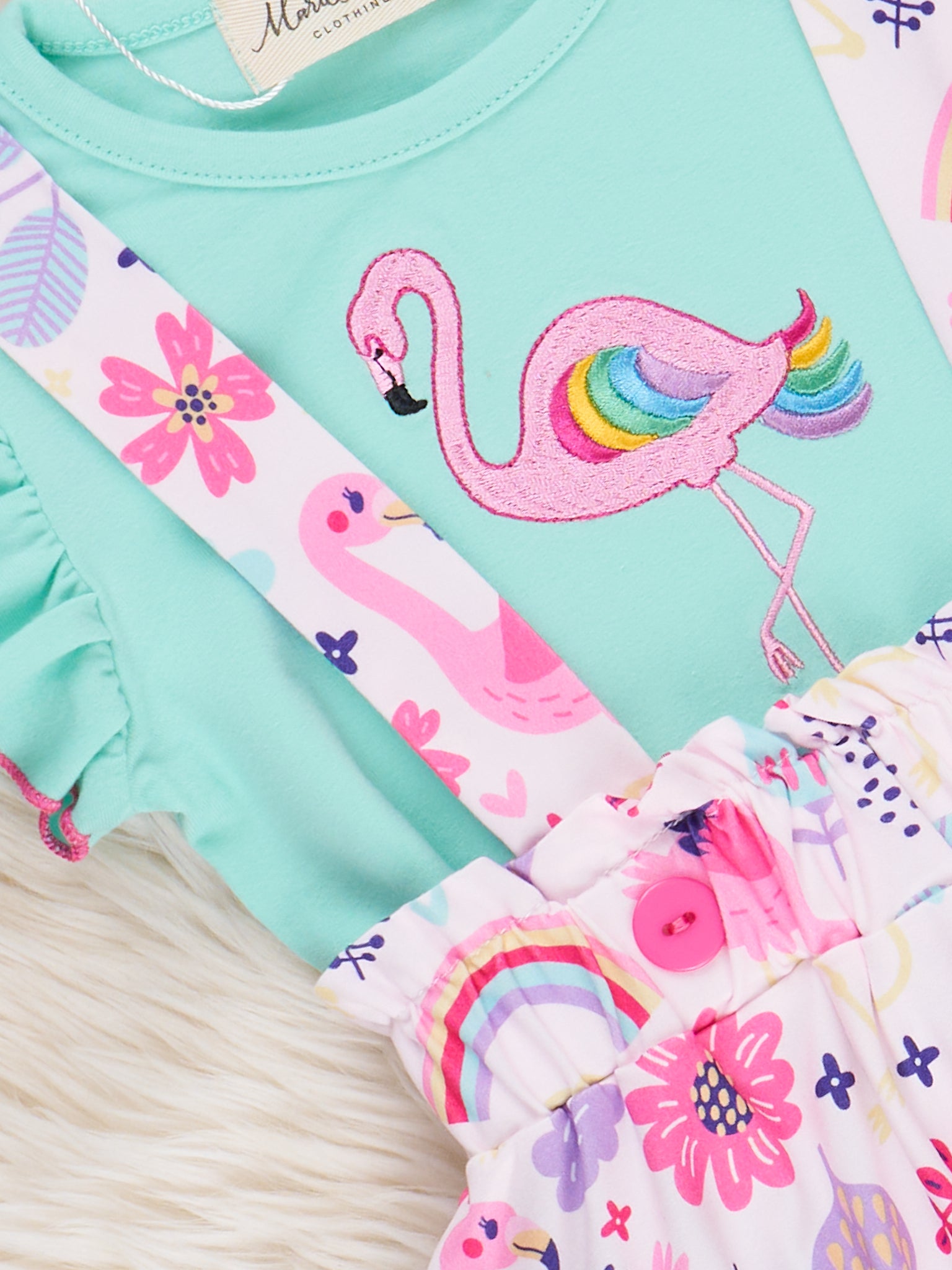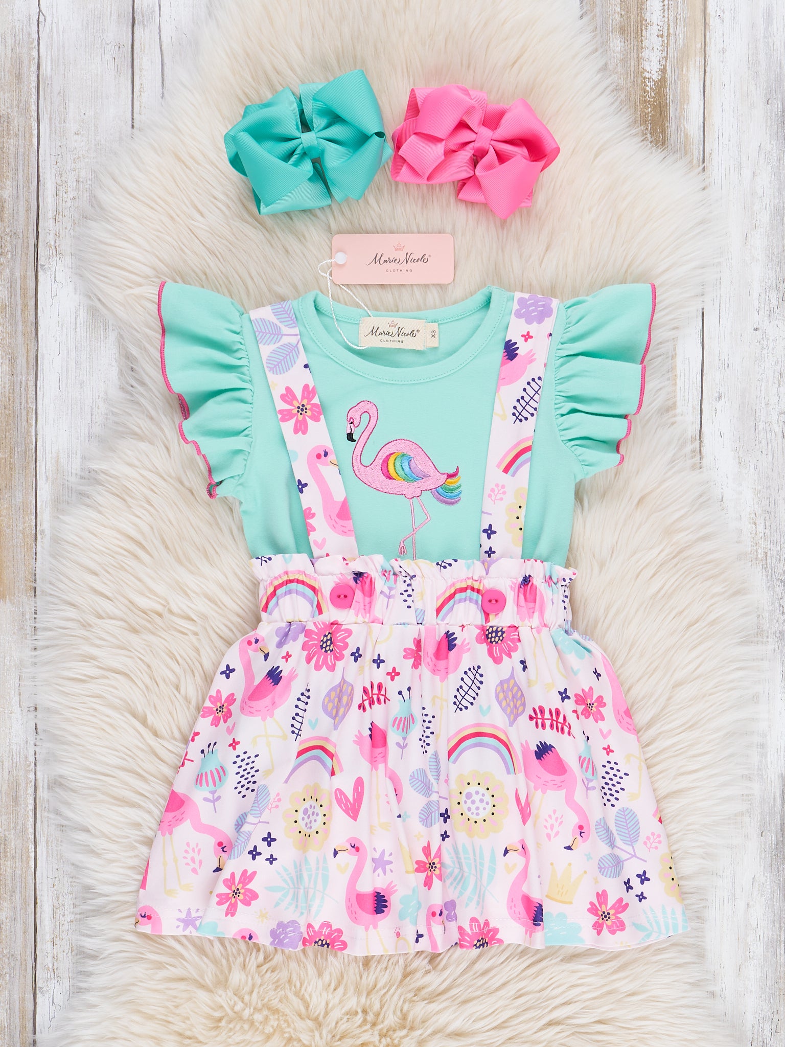 The Flamingo Rainbow Skirtall by Marie Nicole Clothing is a bright and cheerful outfit that’s perfect for sunny days. Featuring an adorable flamingo teal top and a flamingo and rainbow print pink skirtall, this Skirtall is both fun and comfortable. The adjustable straps and soft fabric ensure a great fit for all-day play.