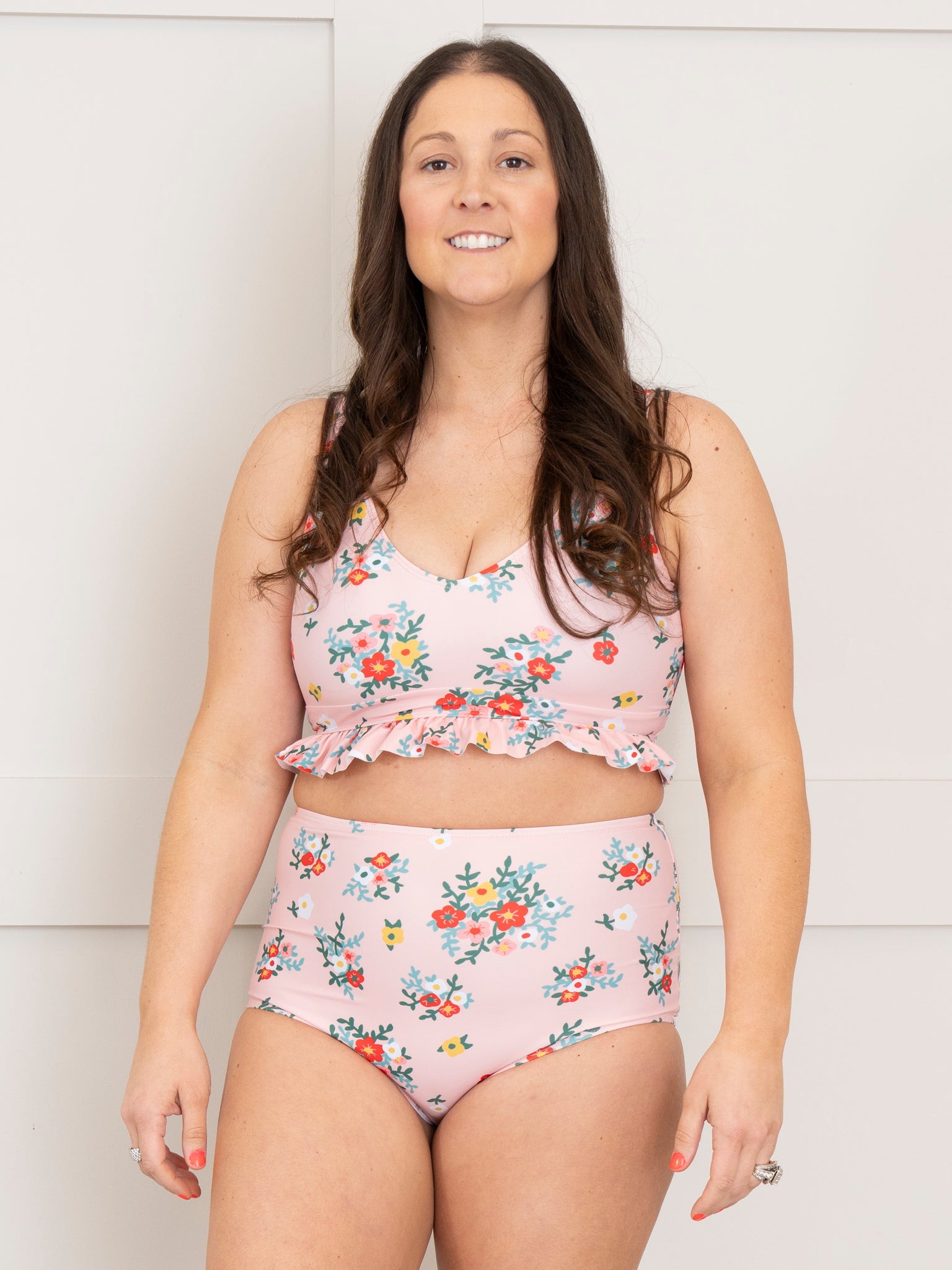 Emily is 5 ft 7 inches tall and 155 lbs wearing size Mom Medium in 2 piece swimsuits.