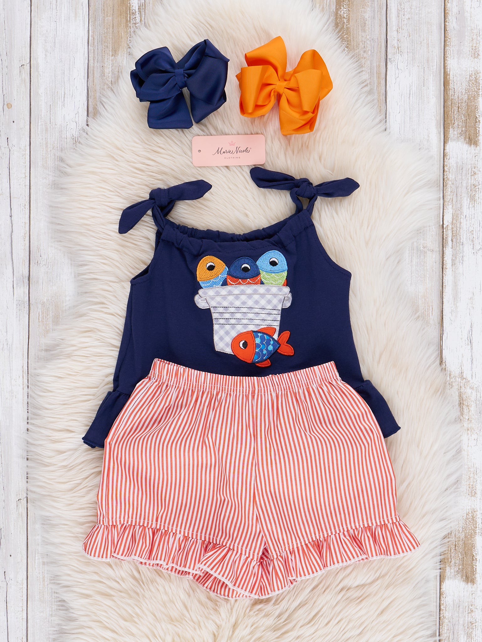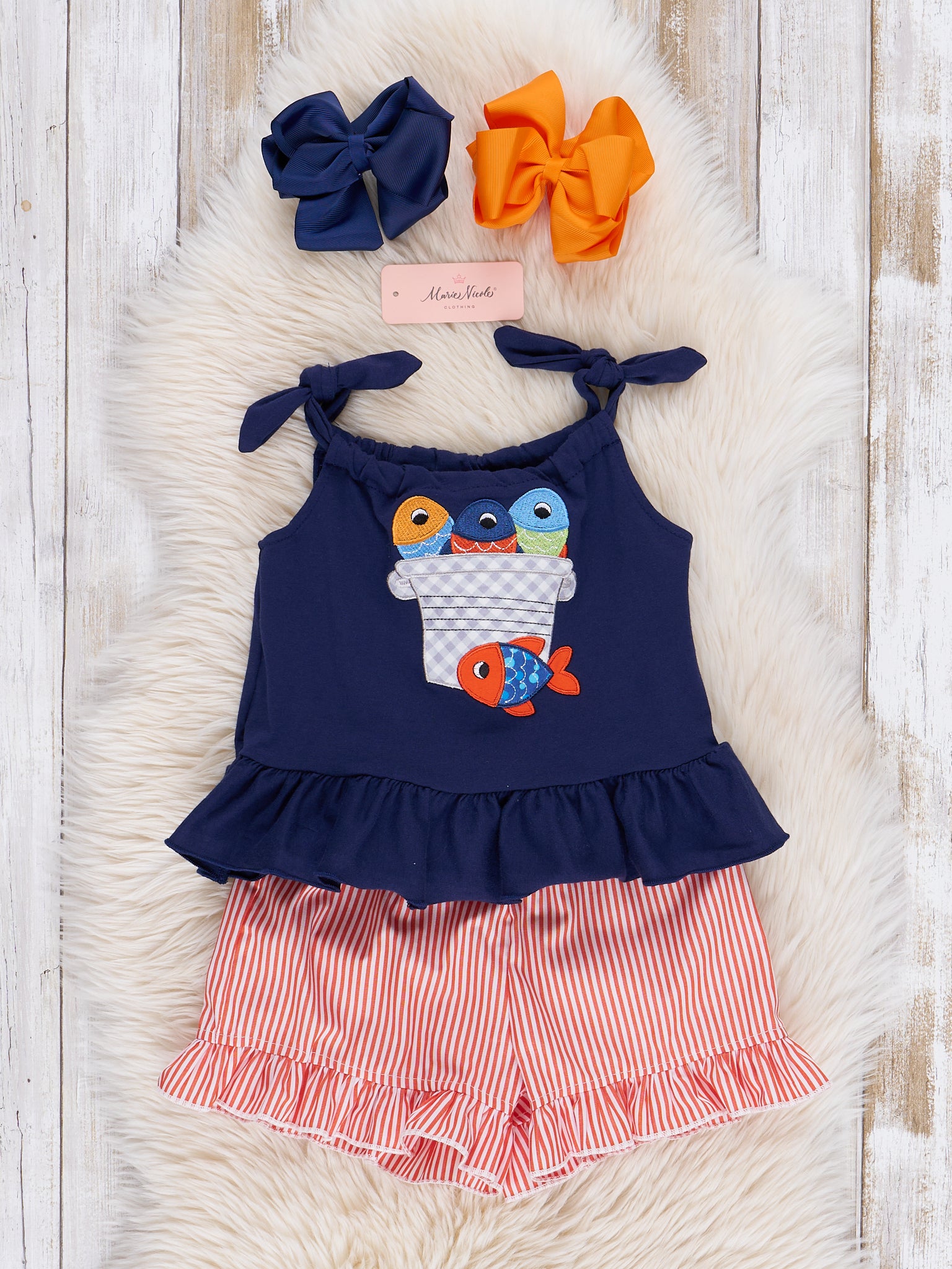 This fintastic sibling set by Marie Nicole Clothing is perfect for a fishing trip! This outfit features a navy top with the cutest fishing bucket appliqué, ruffle trim, adjustable tie straps, & red pinstriped shorts with an elastic waistband.