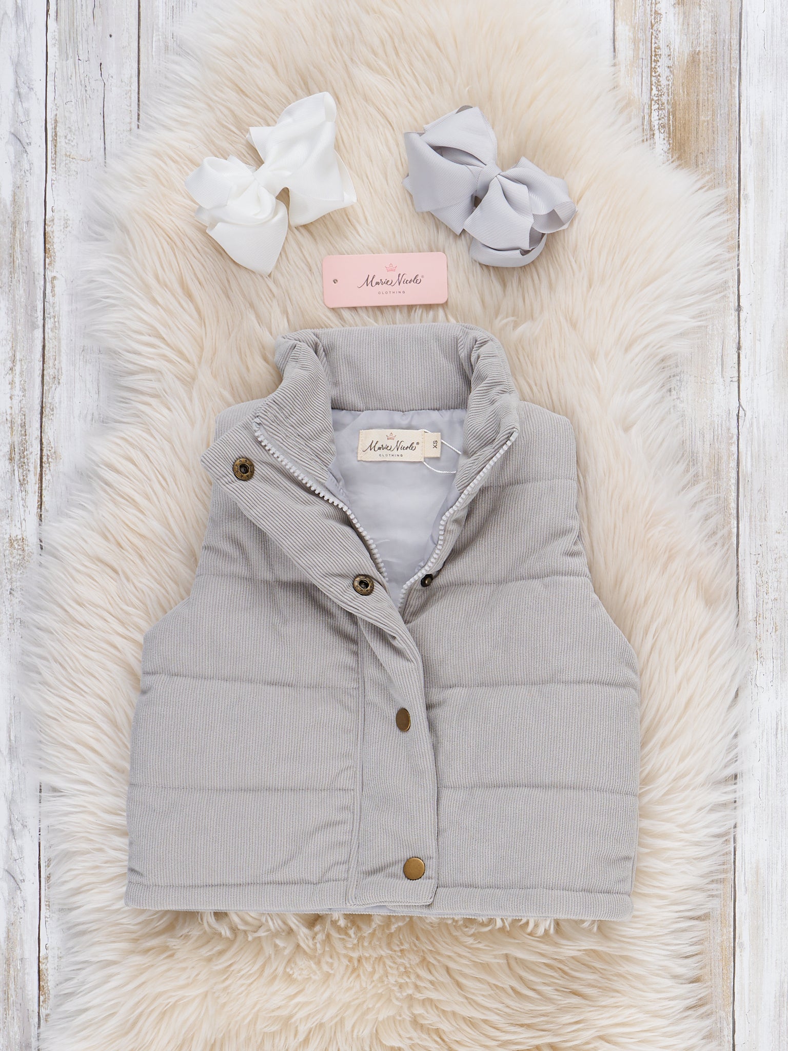 The Corduroy Puffer Vest in Silver by Marie Nicole features a plush, quilted construction with a high neck and snap-button closures down the front. The sleeveless design makes it an ideal layering piece for cool weather, offering both warmth and versatility.
