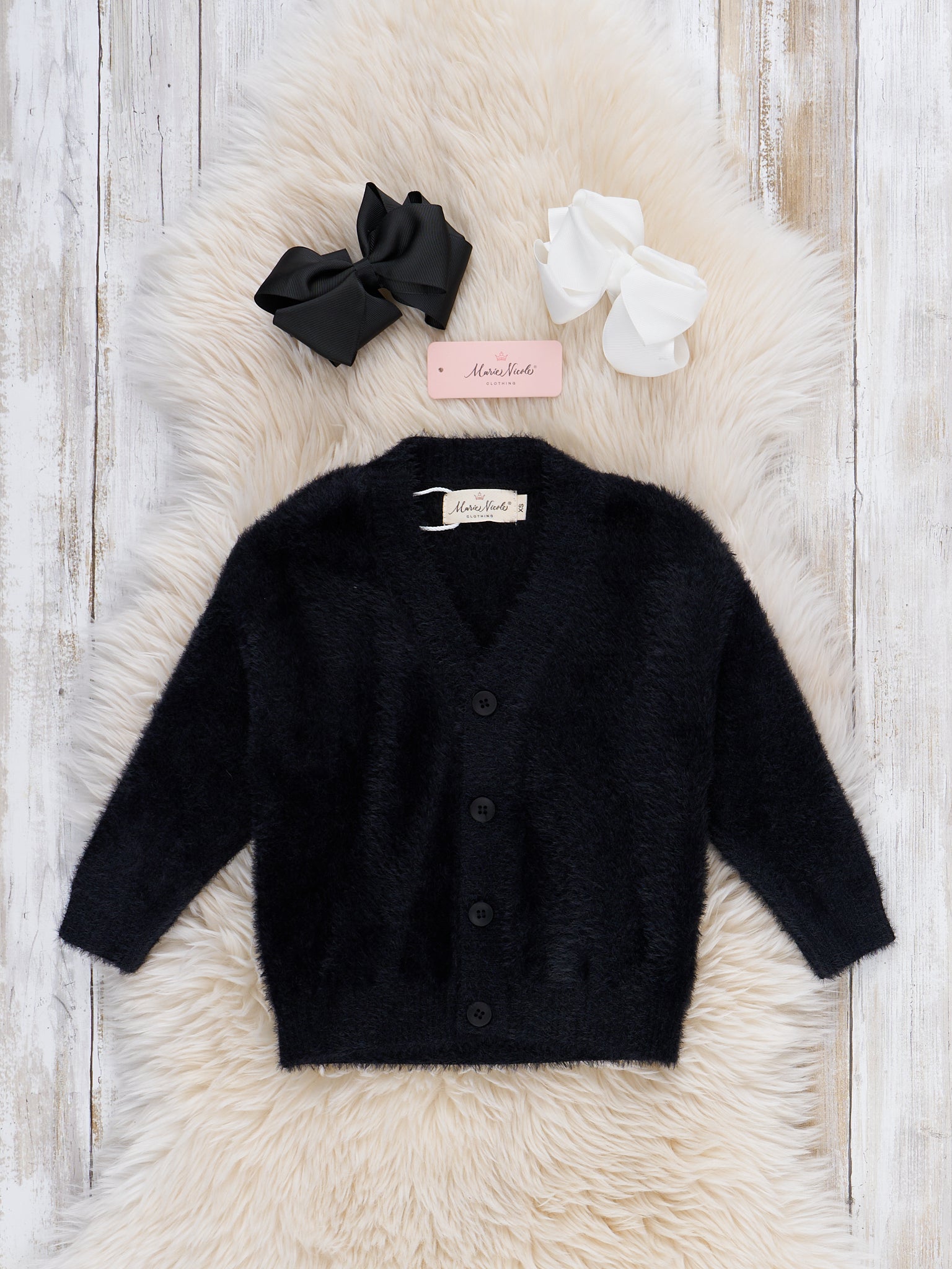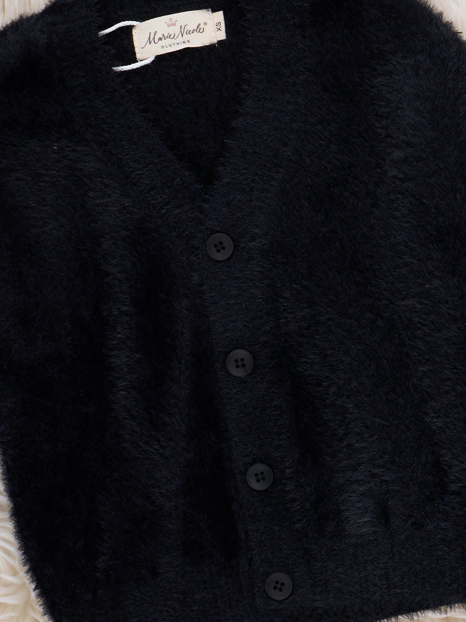 The Deep Night Cardigan by Marie Nicole is a soft, classic button-up knit cardigan designed for comfort and everyday wear. Its timeless silhouette makes it a versatile piece for layering, bringing a cozy, understated look.