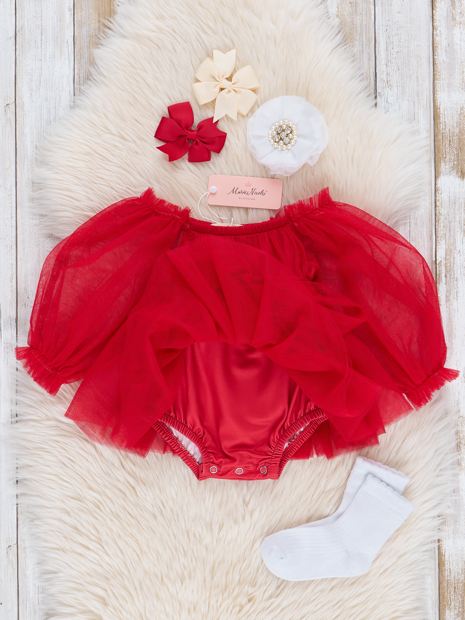 Make her the star of the holiday party with our Red Tulle Bow Bubble! This girls bubble features a playful tulle fabric and a waist tie for added flair. Perfect for a fun and festive look. (Caution: May cause excessive twirling.)